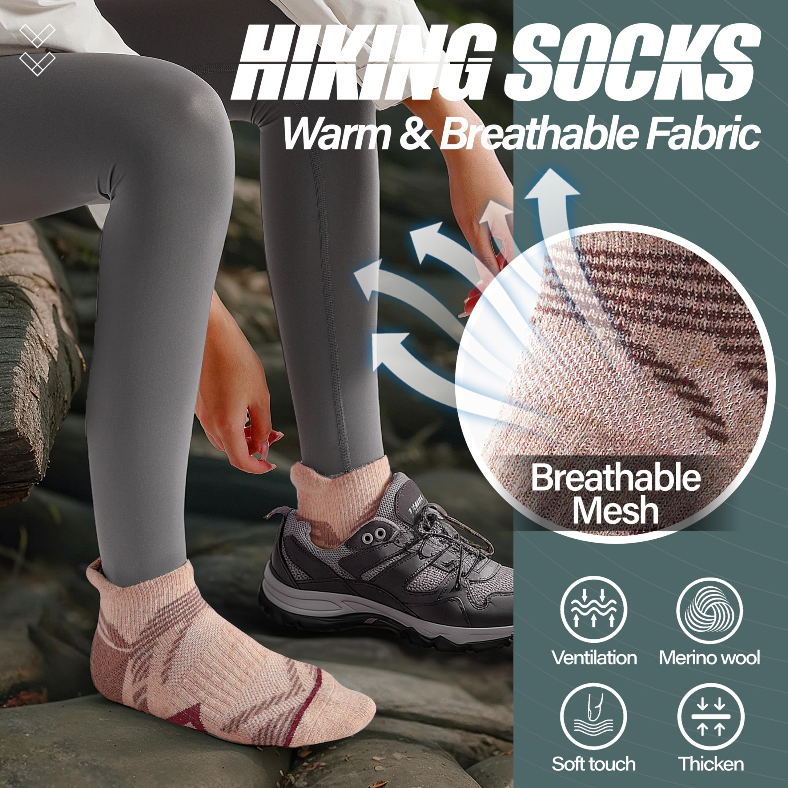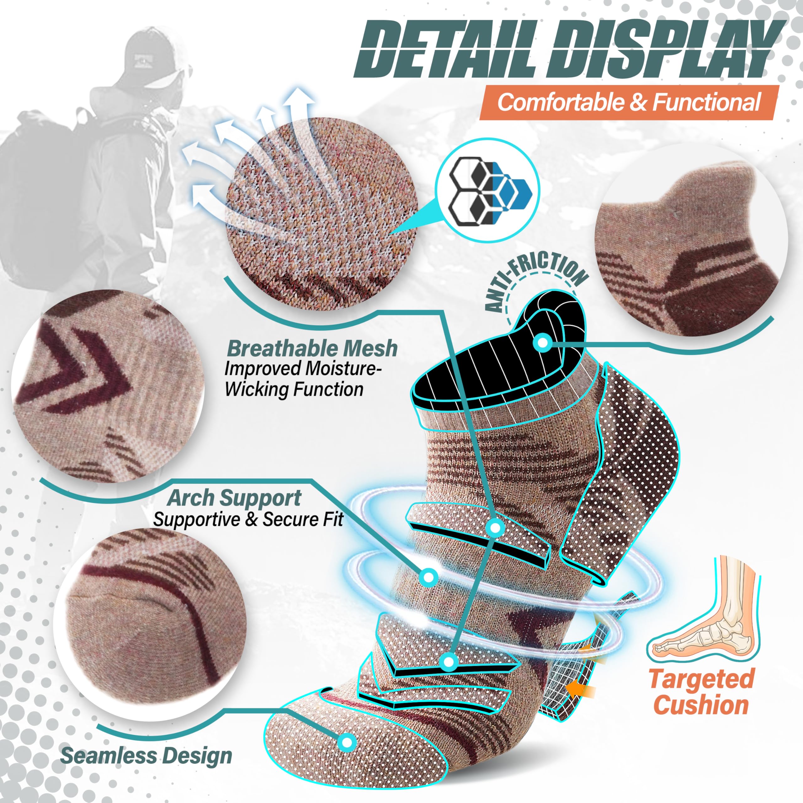 š GENTLE COMPRESSION SUPPORT ļ¼The hiking wool socks incorporates a gentle compression support technology (8-10mmHg), and a compression stripe is designed on the calf and the arch , so that the socks can fit the feet snugly and keep the socks in place,It can also enhance blood circulation , relieve symptoms varicose , reduce fatigue and help in muscle recovery. They are perfect socks for hiking , climbing , running , walking or other outdoor activities.