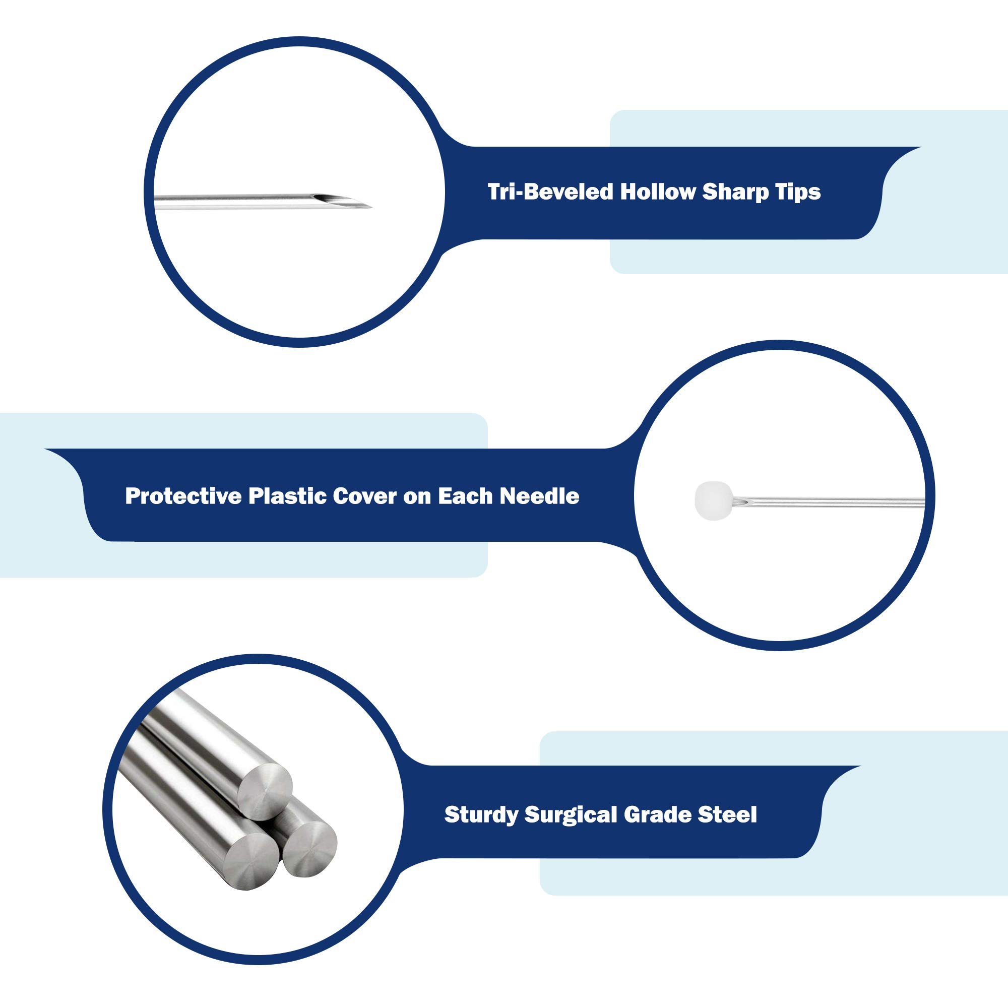 Needles are hollow, tri-bevelled and laser sharp for reducing damage during application onto client.