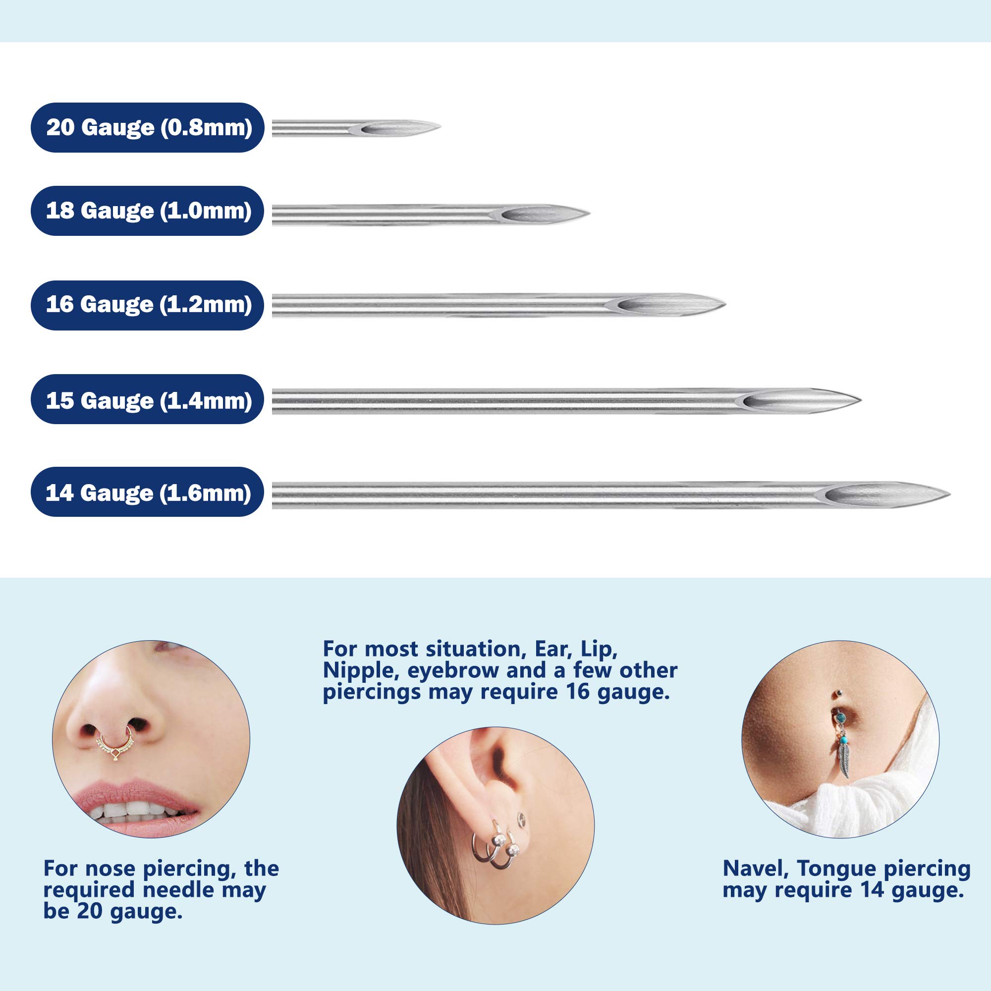 Package includes 100PCS Piercing Needles for Body Piercing. All needles are individual packaged and has been pre-sterilized w/ E.O. Gas (ethylene oxide). Protective sterile rubber tip on each needle. Surgical grade steel, no allergic reactions. Needles are hollow, tri-bevelled and laser sharp. These needles are designed to cause less harm to the body, and to promote healing. Disposable needles which ensure personal hygiene. For most situation, Ear, Lip, Nipple, eyebrow and a few other piercings may require 16 gauge. Navel, Tongue piercing may require 14 gauge. For nose piercing, the required needle may be 20 gauge.