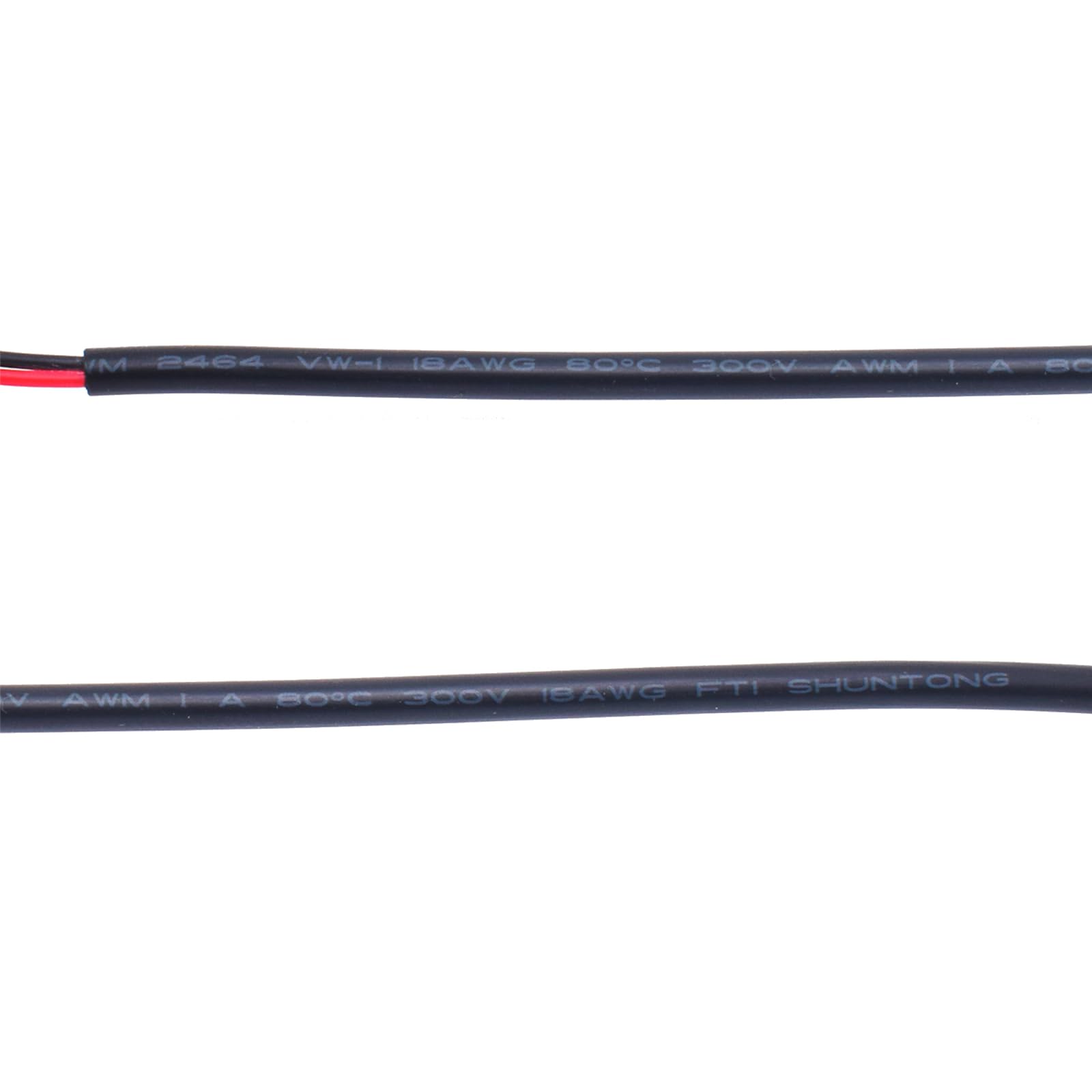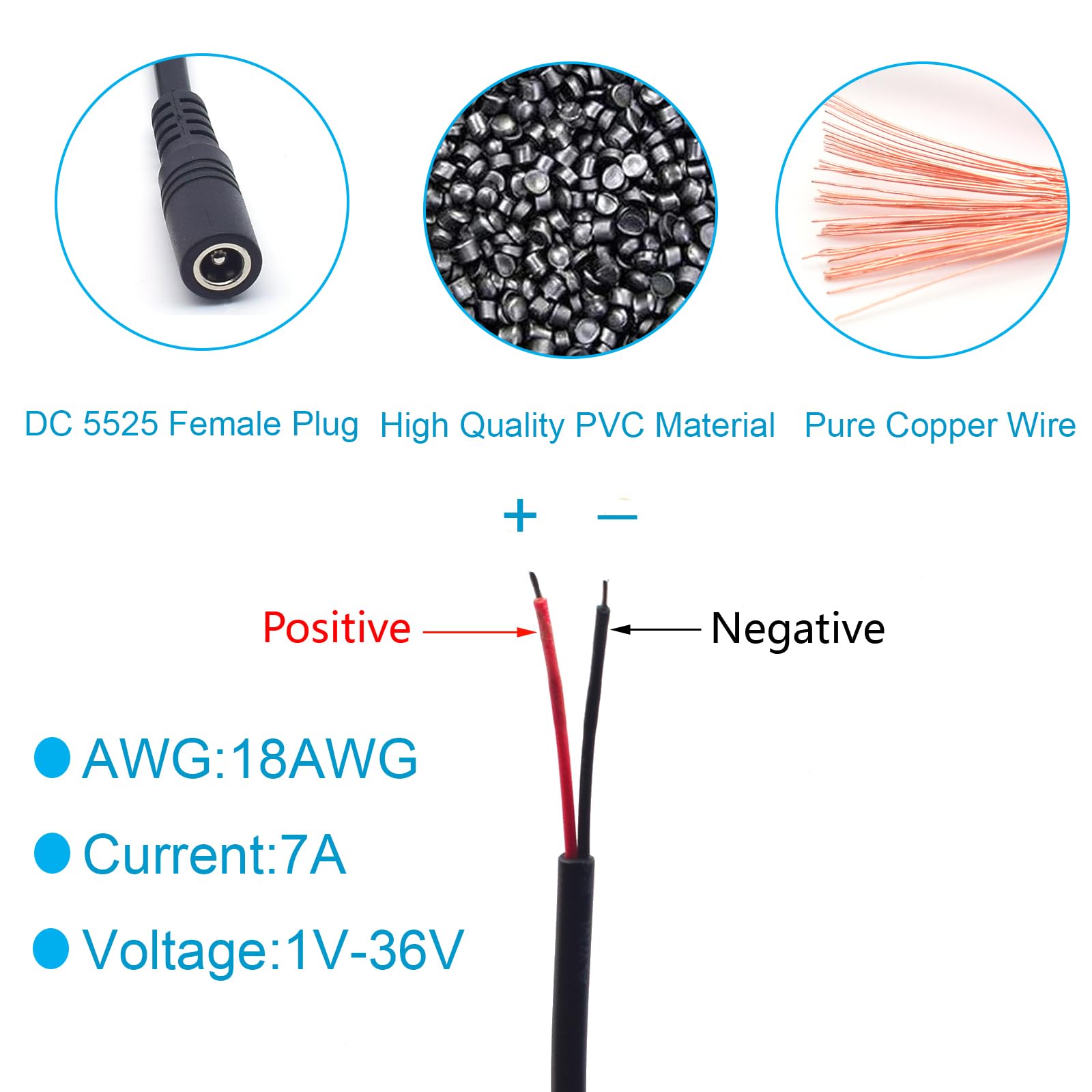 DC Power End Female Connector Features: One end is a DC 5.5mm x 2.5mm female connector. The other end is a red & black 2 wire,red represents the positive pole ,black represents the negative pole,18AWG, with a current of 7A and a voltage of 1V-36V. length is 0.3M/1FT,packaging includes 1PCS.