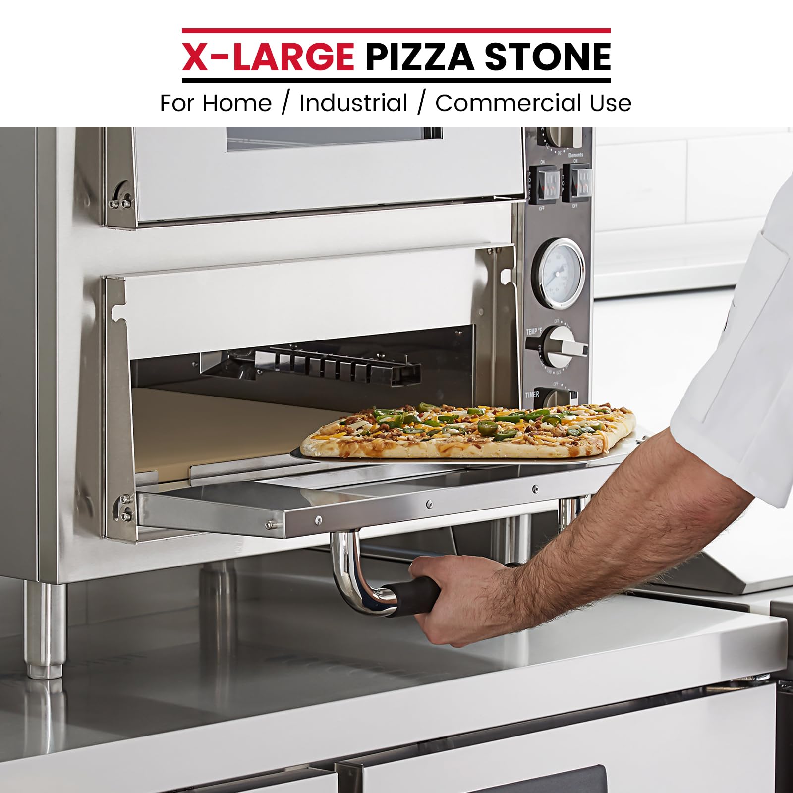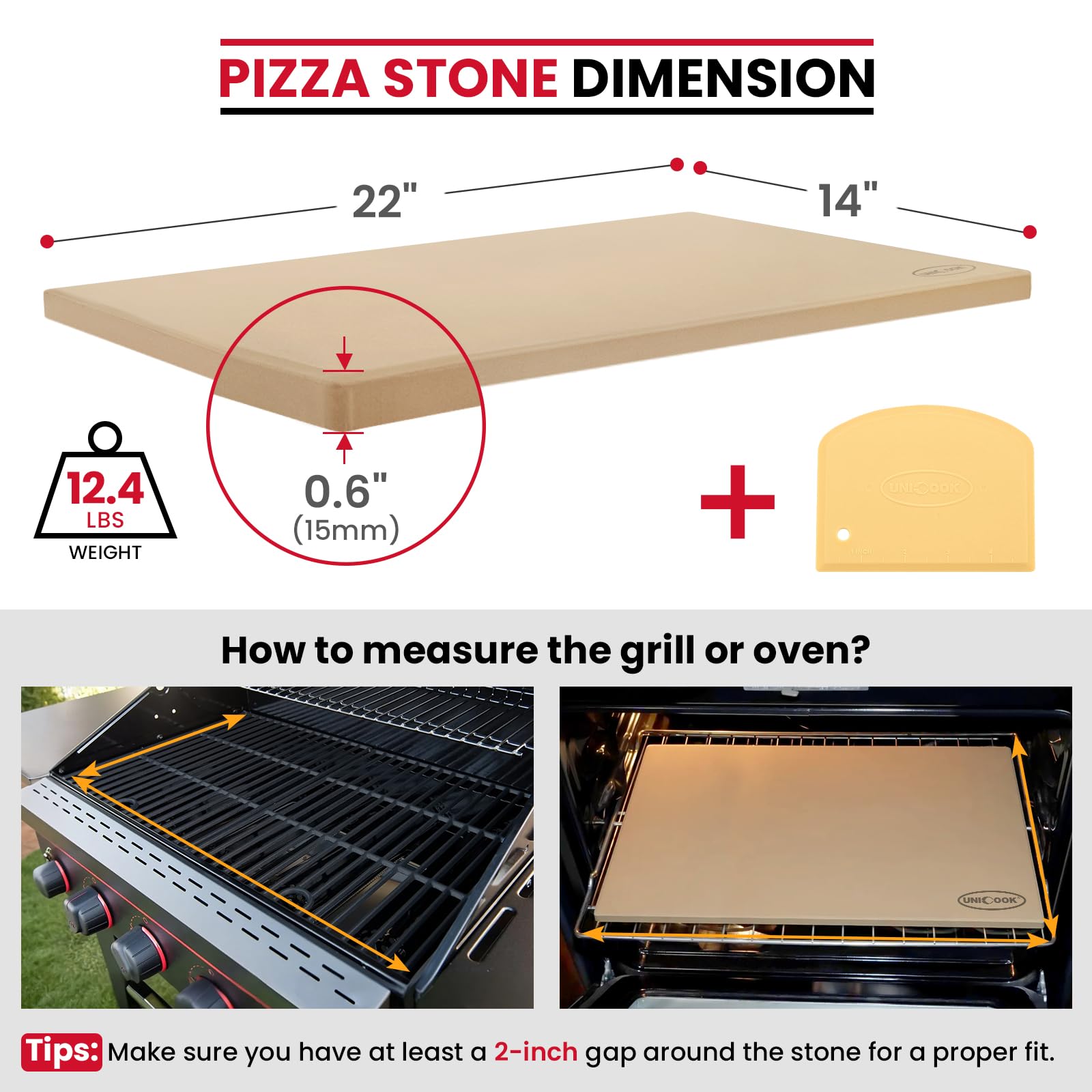 Extra Large Pizza Stone for Oven: 22" x 14" x 0.6"(15mm), weighs around 12.4 lbs, allows to bake multiple pizzas or loaves at the same time. Fits large home/convection/commercial ovens and grills with inner cavity larger than 24"L x 16"W. Make sure you have at least a 1-inch gap around your stone for a proper fit and good ventilation