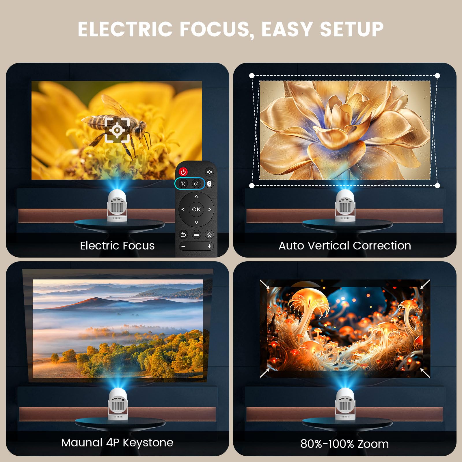 【Enhanced Speakers & Connectivity】Features WiFi 6 and Bluetooth 5.2 for seamless connections (compatible with 2.4G/5G networks). This compact yet powerful smart projector comes with 360° surround sound speakers, offering an immersive home theater experience.