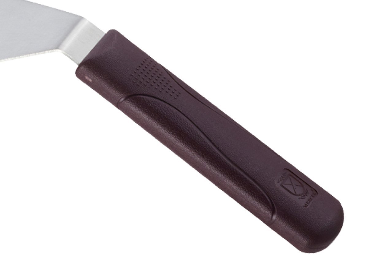The unique formulation of these handles absorbs 50% less heat than standard polypropylene handles, remaining cooler to the touch longer. The handles also safely withstand temperatures up to 450°F (232°C). Precision ground stainless steel blades provide the perfect combination of flexibility and stiffness.