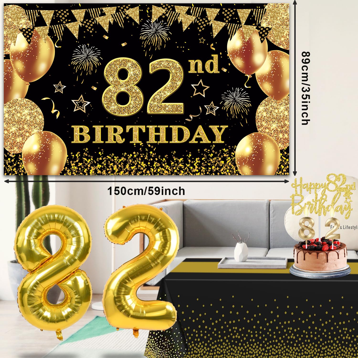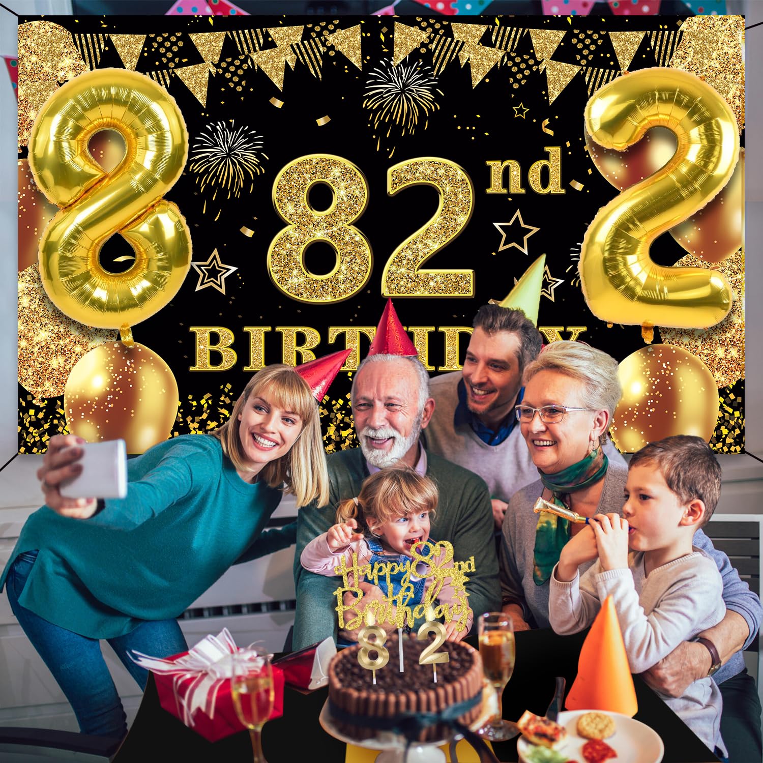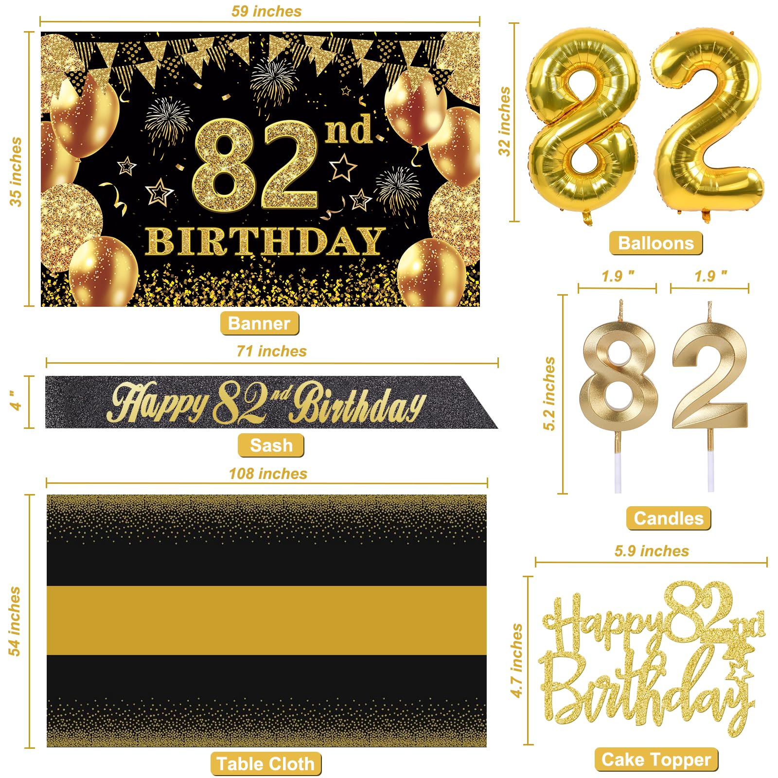 82nd Birthday Decorations Kit: Packing Coming with Large 82nd Birthday Banner x 1pc, Big Gold 82nd Birthday Balloons x 1set, Black and Gold Table Cloth x 1pc, Black Glittery with Gold Foil Words Happy 82nd Birthday Sash x 1pc, 82nd Happy Birthday Cake Topper x 1pc, Gold Number 82 Candles x 1set. This Value Black and Gold Party Decorations Set Meet Your Every Needs and Expects in 82nd Birthday Milestone