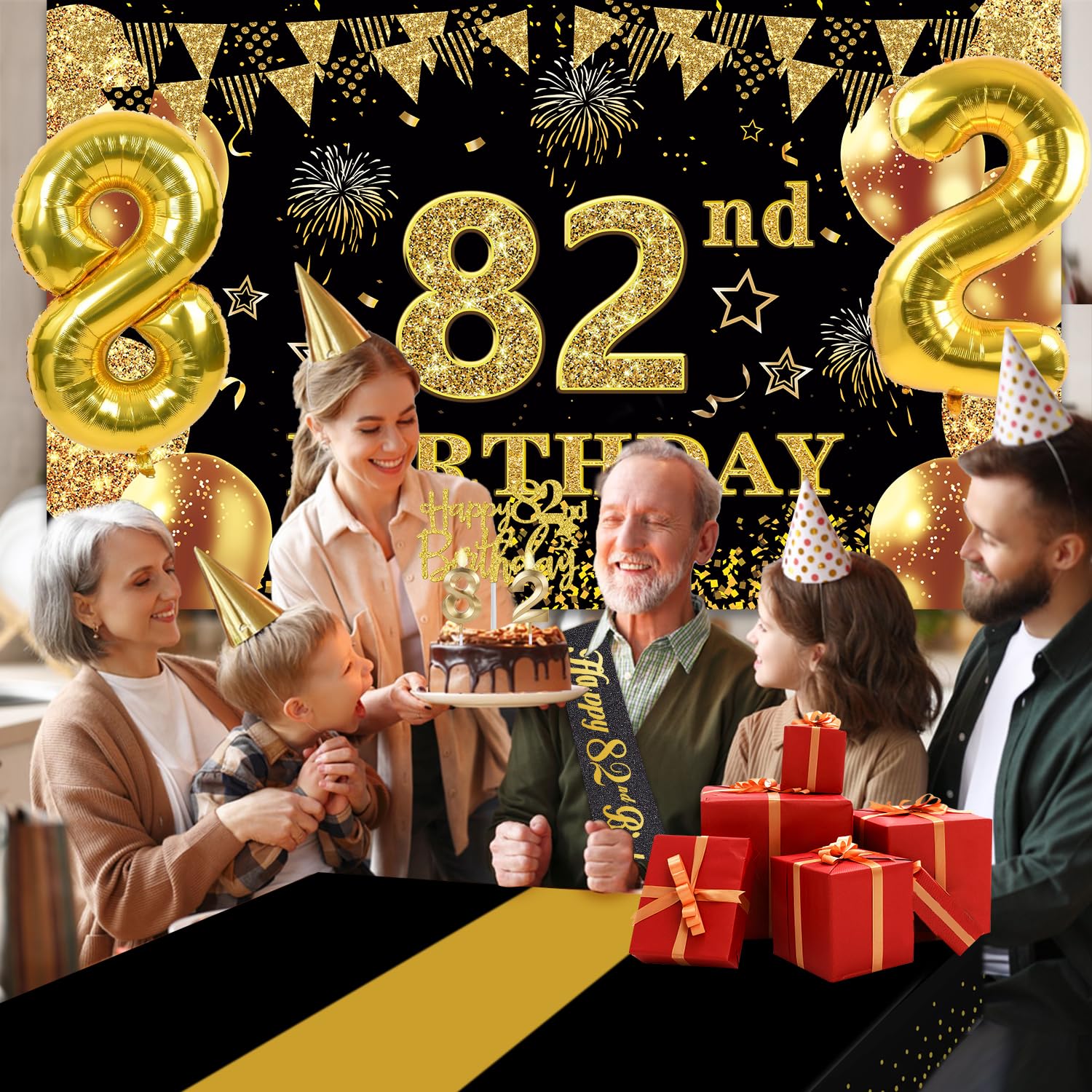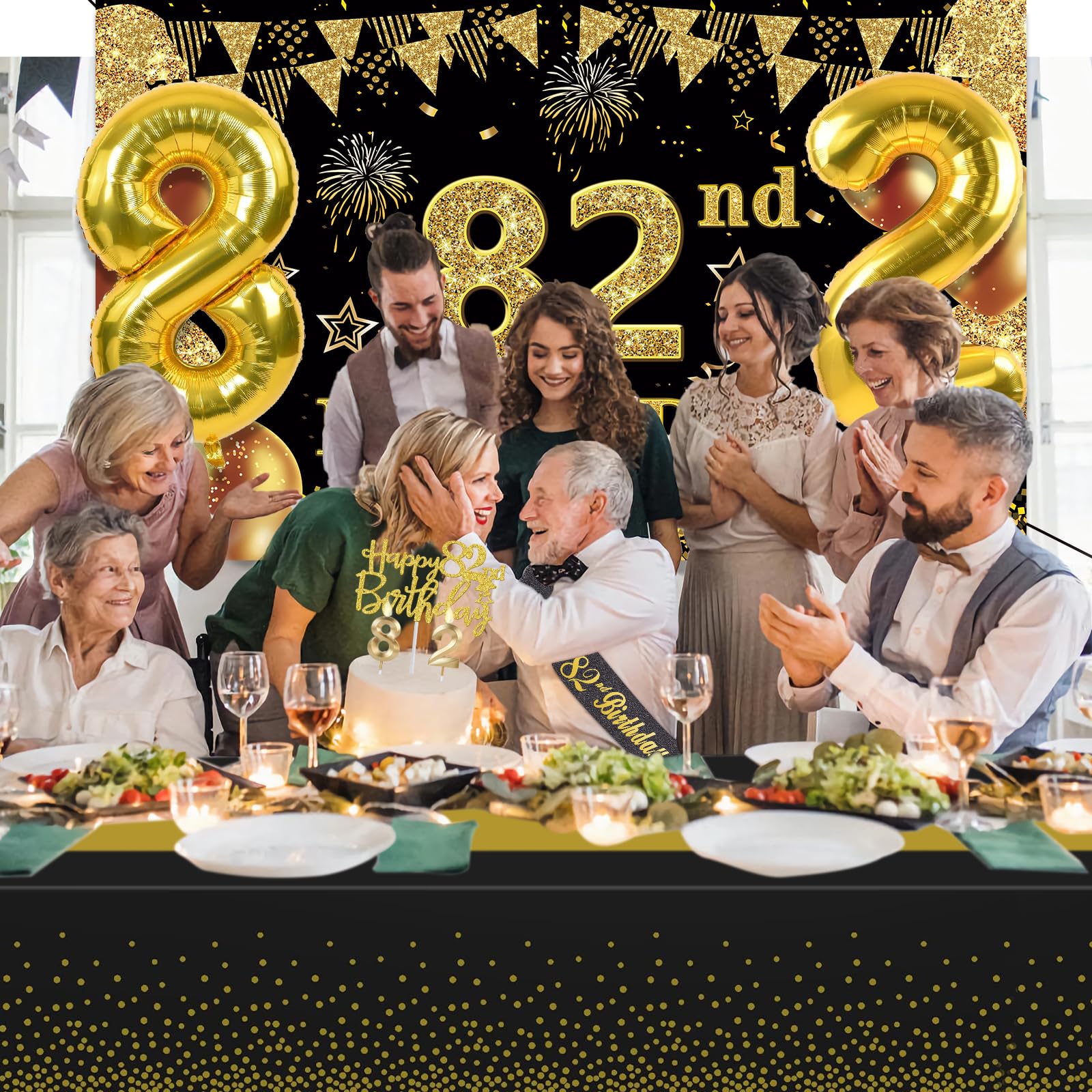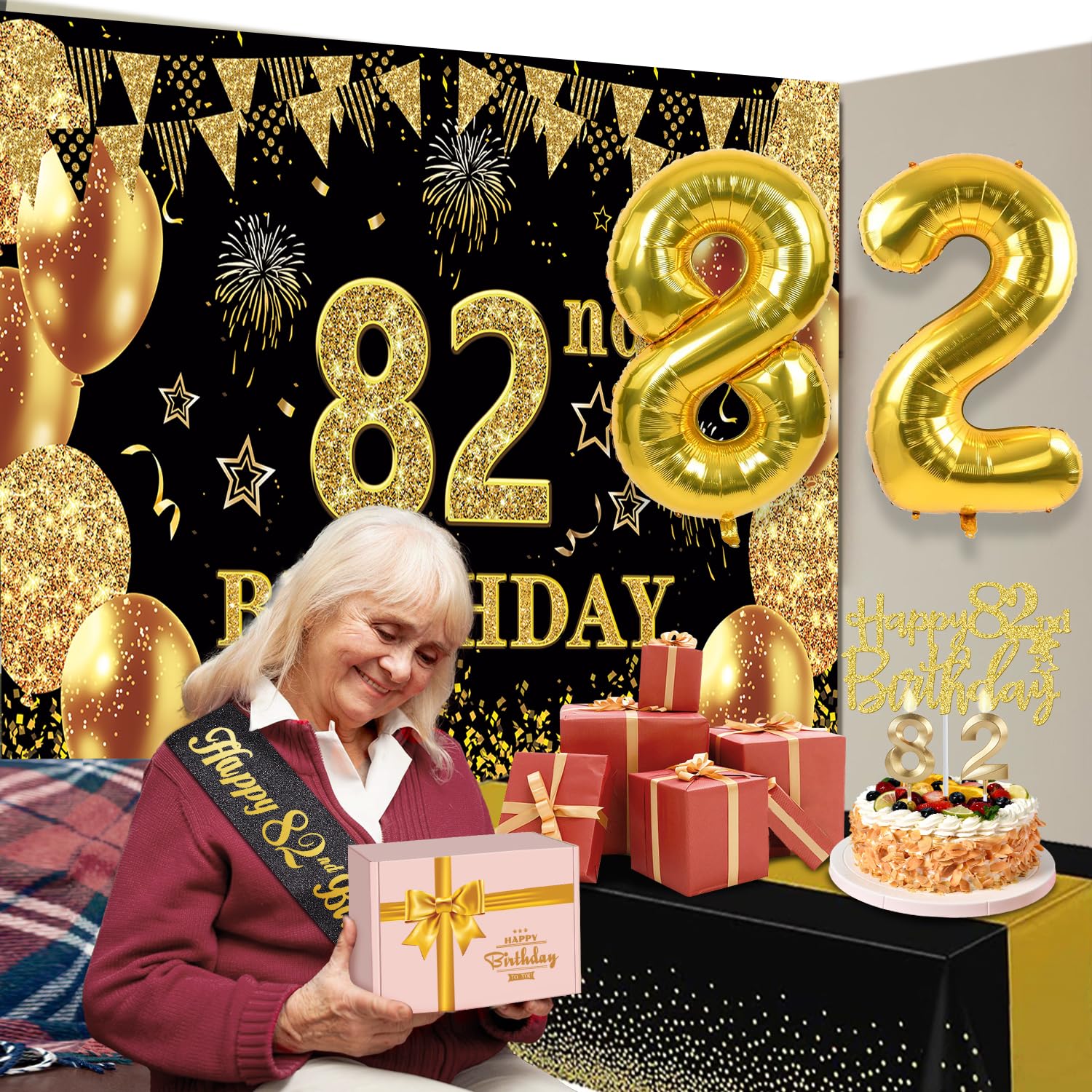 82nd Birthday Decorations Kit: Packing Coming with Large 82nd Birthday Banner x 1pc, Big Gold 82nd Birthday Balloons x 1set, Black and Gold Table Cloth x 1pc, Black Glittery with Gold Foil Words Happy 82nd Birthday Sash x 1pc, 82nd Happy Birthday Cake Topper x 1pc, Gold Number 82 Candles x 1set. This Value Black and Gold Party Decorations Set Meet Your Every Needs and Expects in 82nd Birthday Milestone