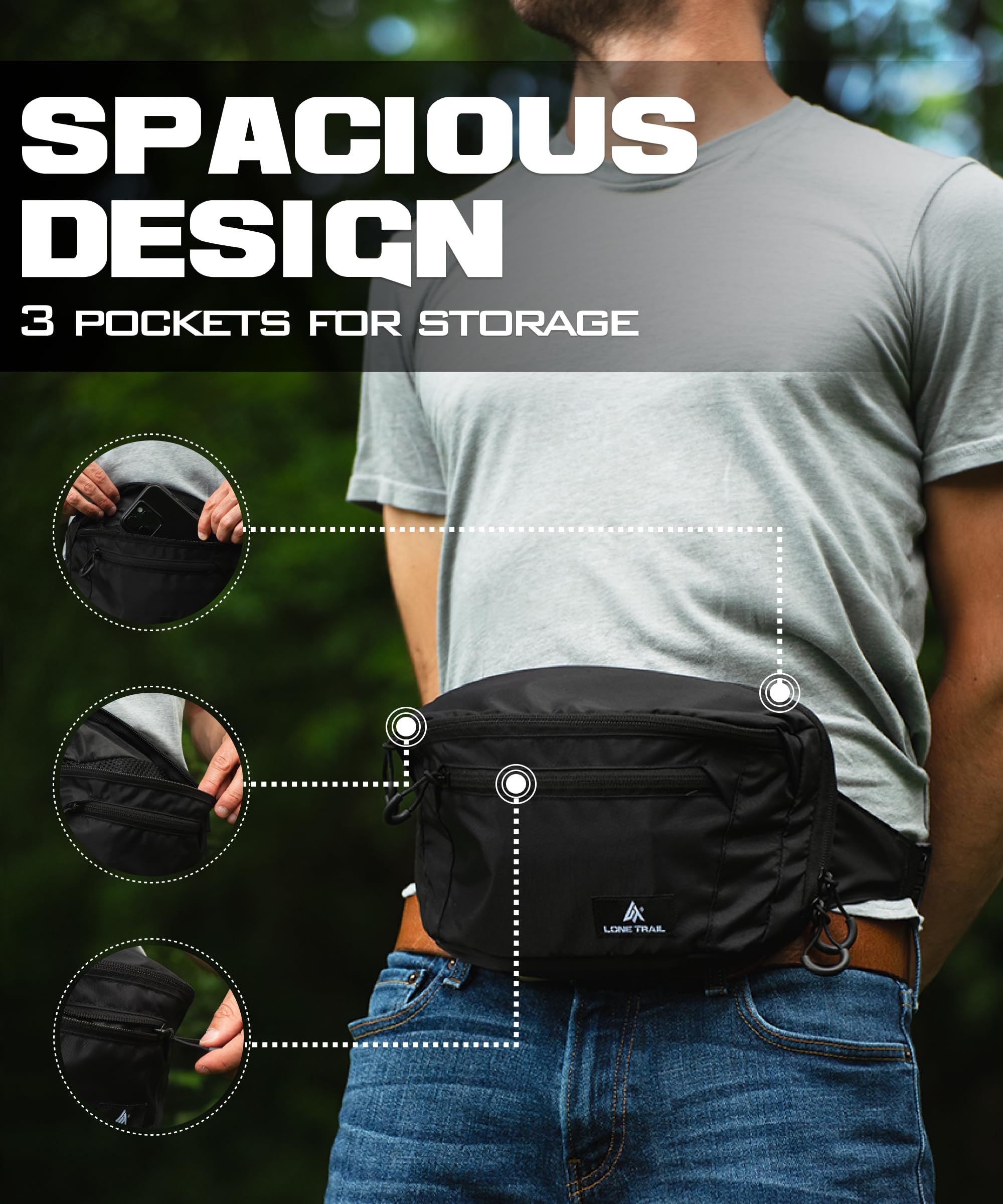 Man fanny pack with adjustable fit and zero bounce: With a 60" strap fully adjustable from 0" to 60" and 14" extender, this waist pack fits all sizes for men and women and wears clean crossbody or on-hip. Dual strap loops keep it snug, so you move freely, not flappy.