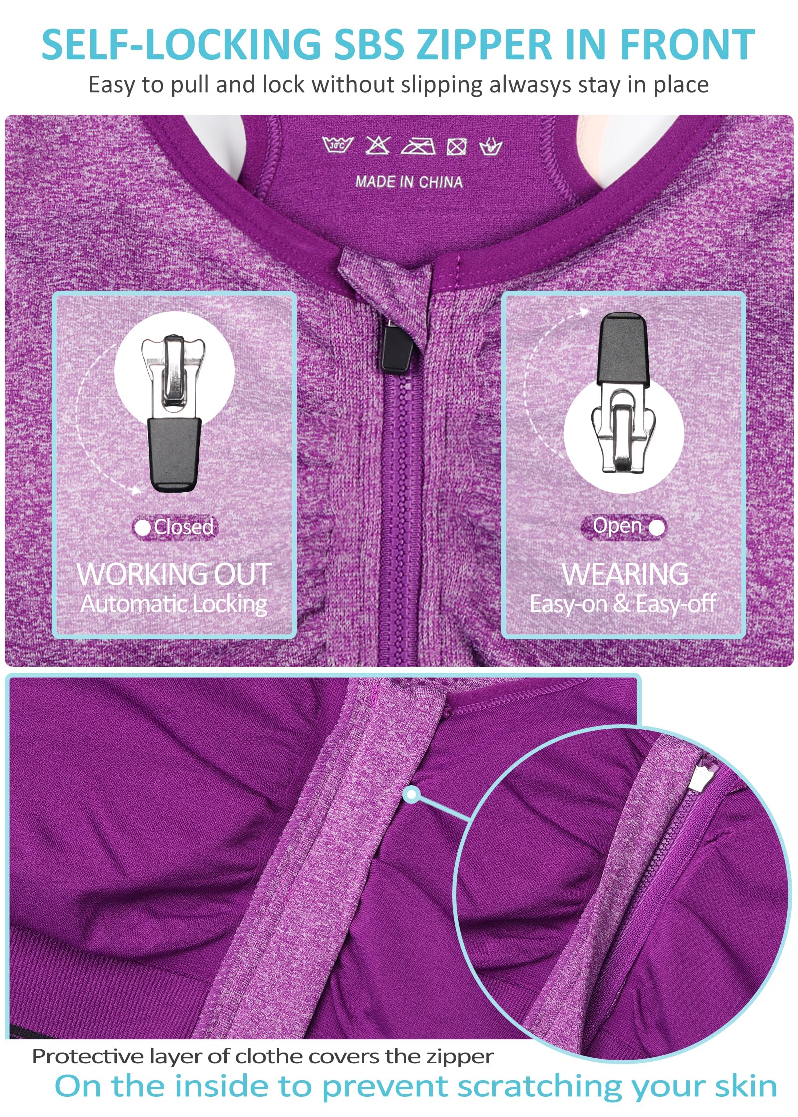 Front zipper closure-Easy to put on and take off with zipper front closure. Anti slide Zipper protect from sliding down when doing exercise. Protective layer of clothe covers the zipper on the inside to prevent scratching your skin