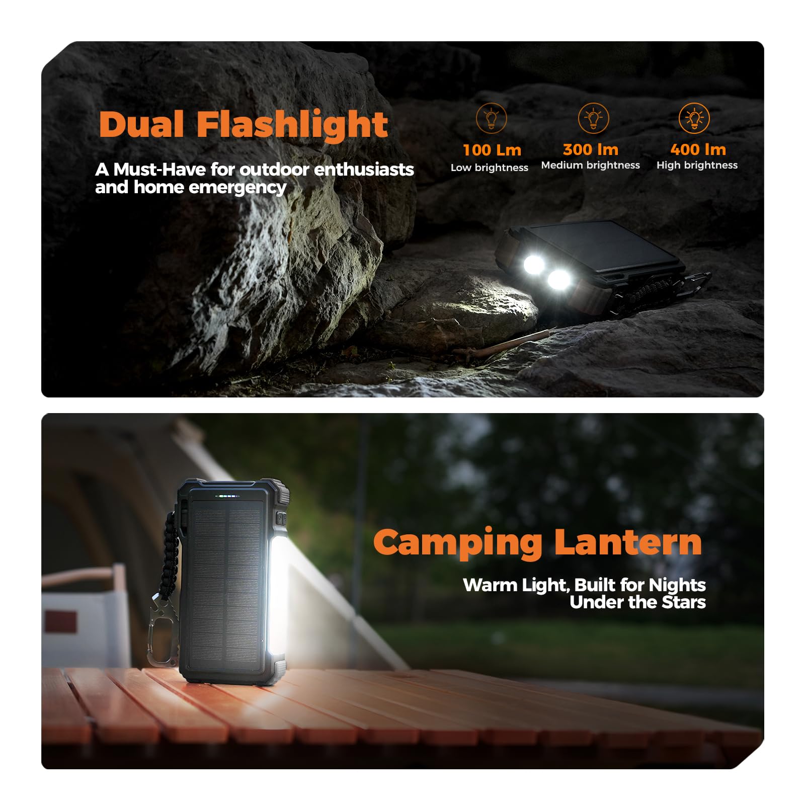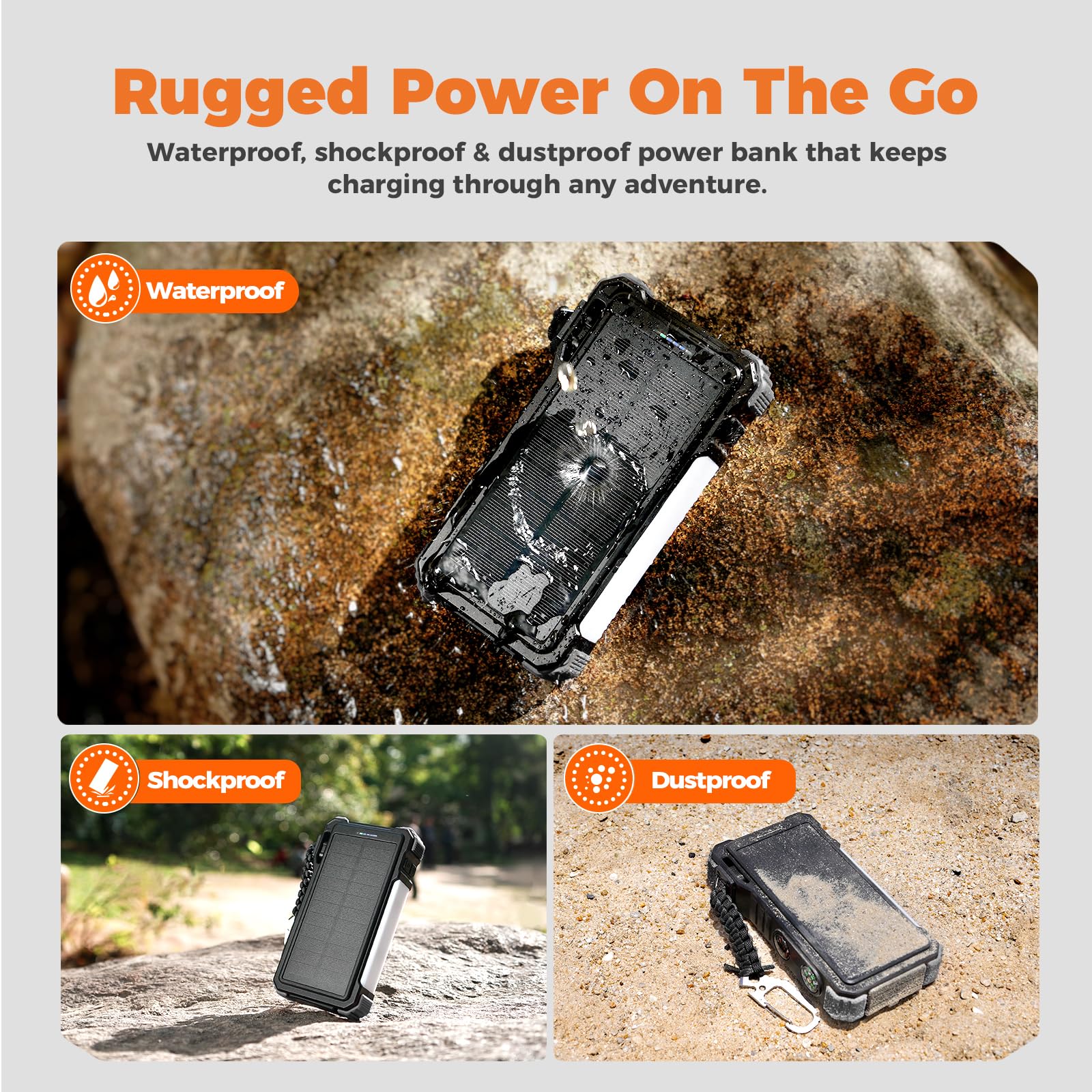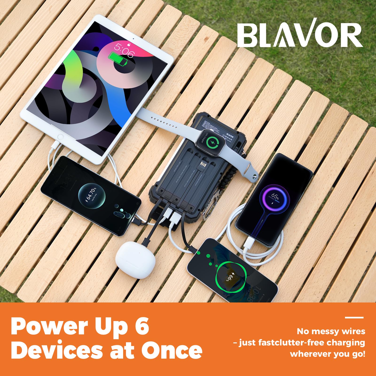 Durable And Adventure-Ready: Built to withstand anything nature throws at it, the BLAVOR solar charger power bank is a true warrior. Its flame retardant ABS+PC shell and waterproof silicone protection make it waterproof, shockproof, and dustproof, ensuring it can handle extreme conditions with ease. No matter where your adventures take you, this charger is up for the challenge
