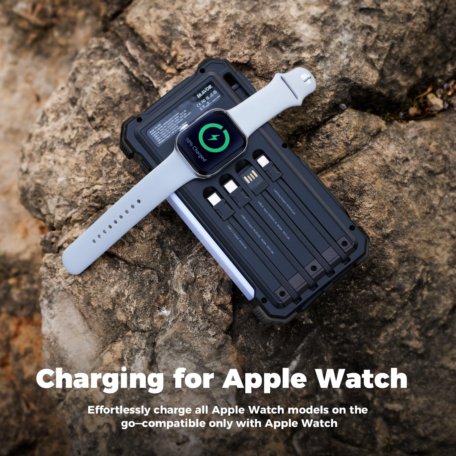 Simultaneously Charge 6 Devices: The BLAVOR solar charger is your ultimate charging solution! With its 4 built-in cables (including 2 USB-C, 1 iOS, and 1 USB-A) and 3 charging ports (USB-C, USB-A, and iOS), you can power up to 6 devices all at once. It even has a special wireless charging area for your Apple Watch, making it a true multitasking marvel