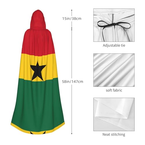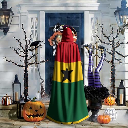 Flag of Ghana The patterned Halloween oversized cape is made of 100% polyester, which is soft and comfortable to the touch and has excellent wear resistance and durability. The size is 58 inches long, 61 inches wide, and the neckline length is 15 inches.