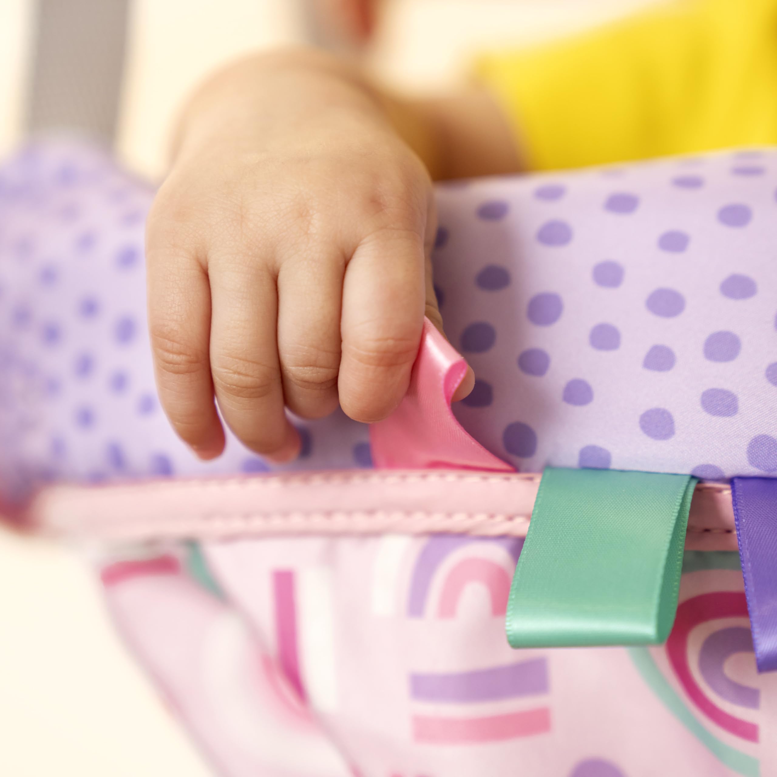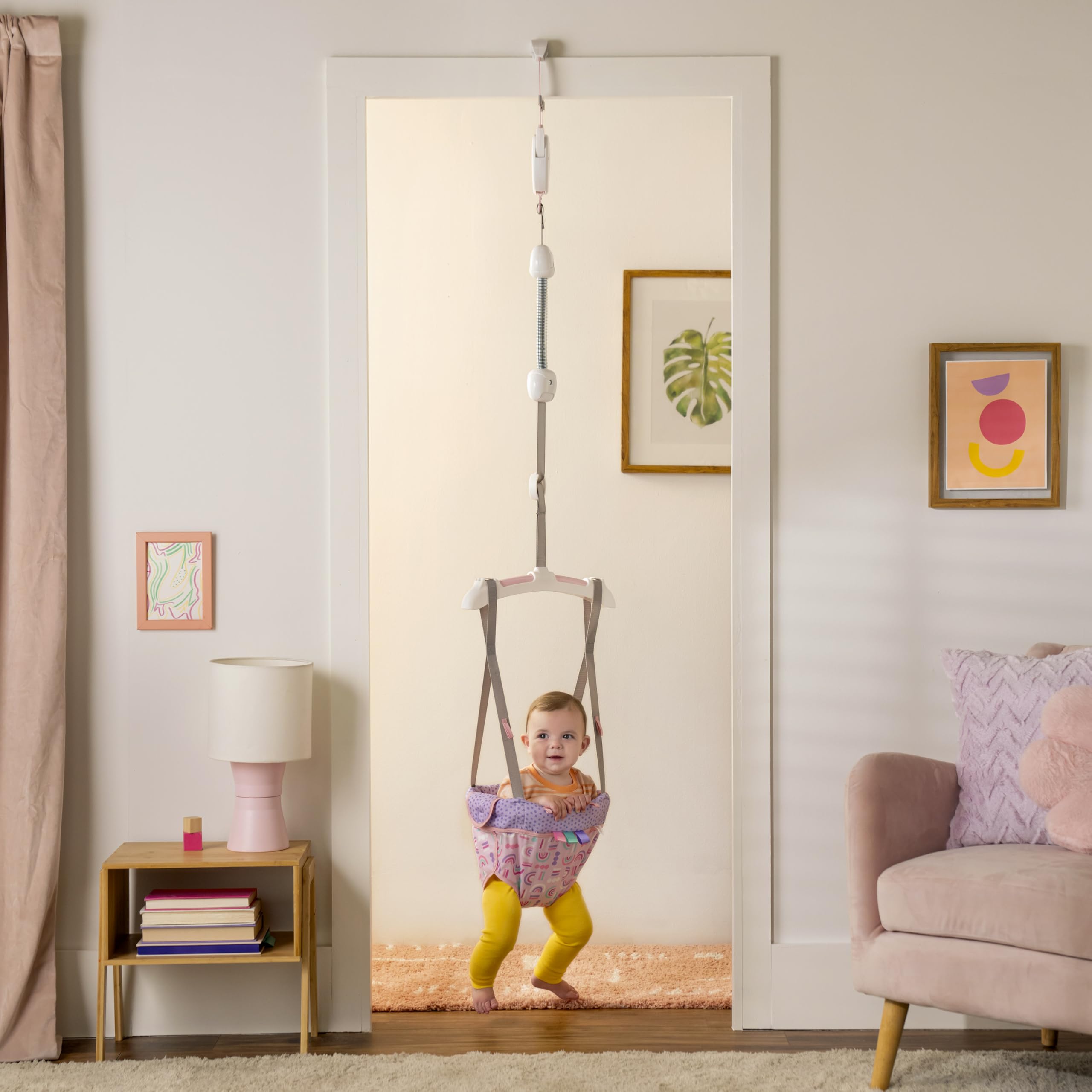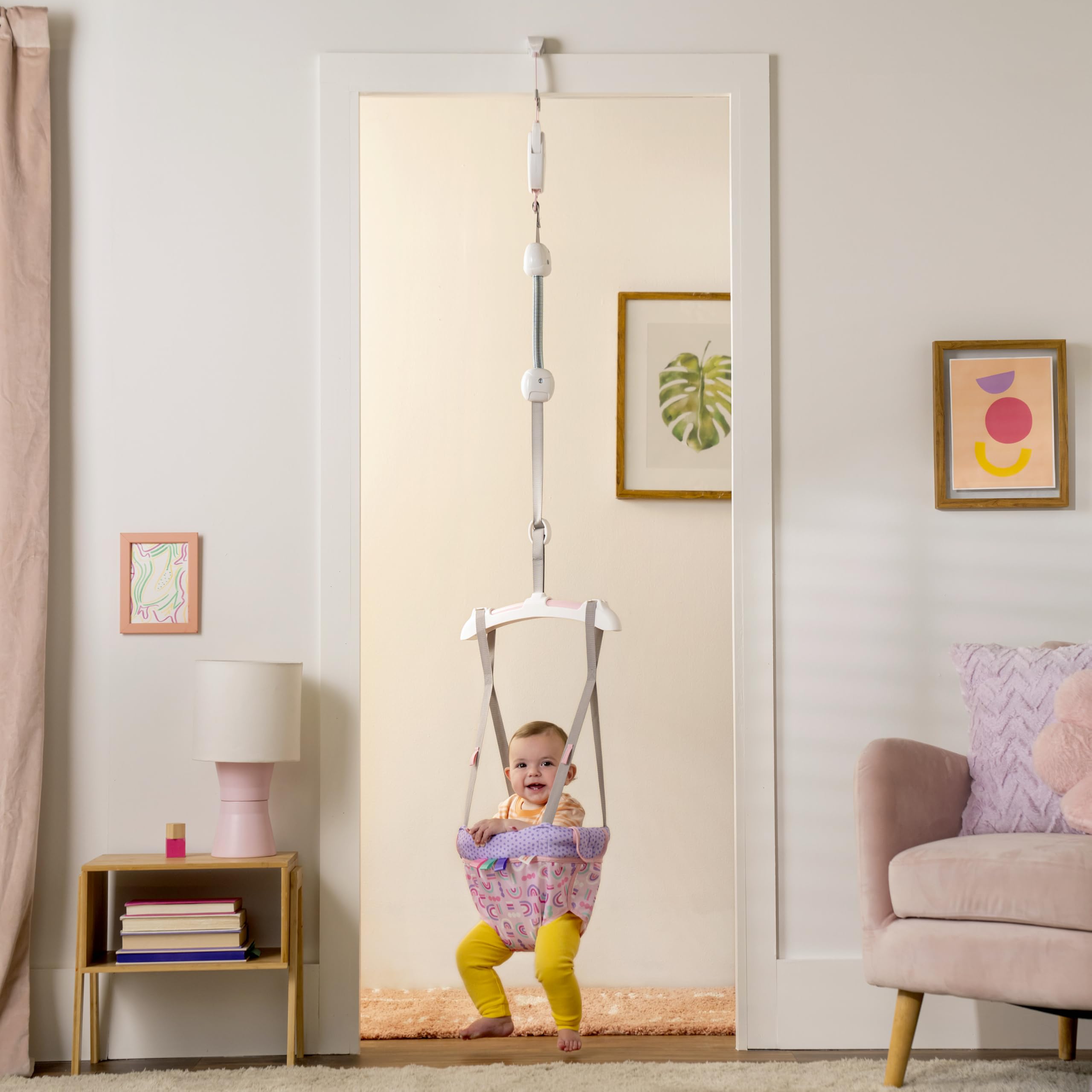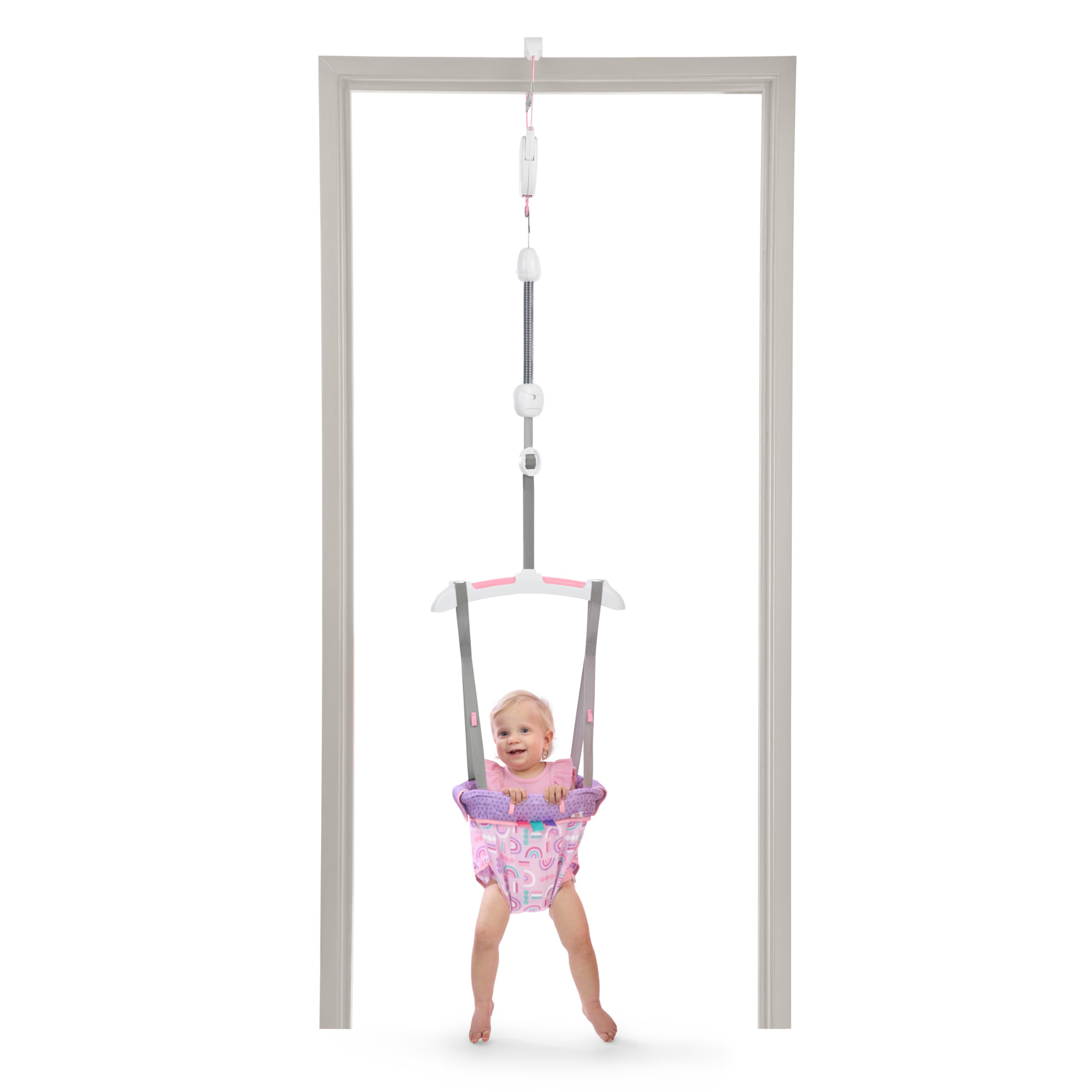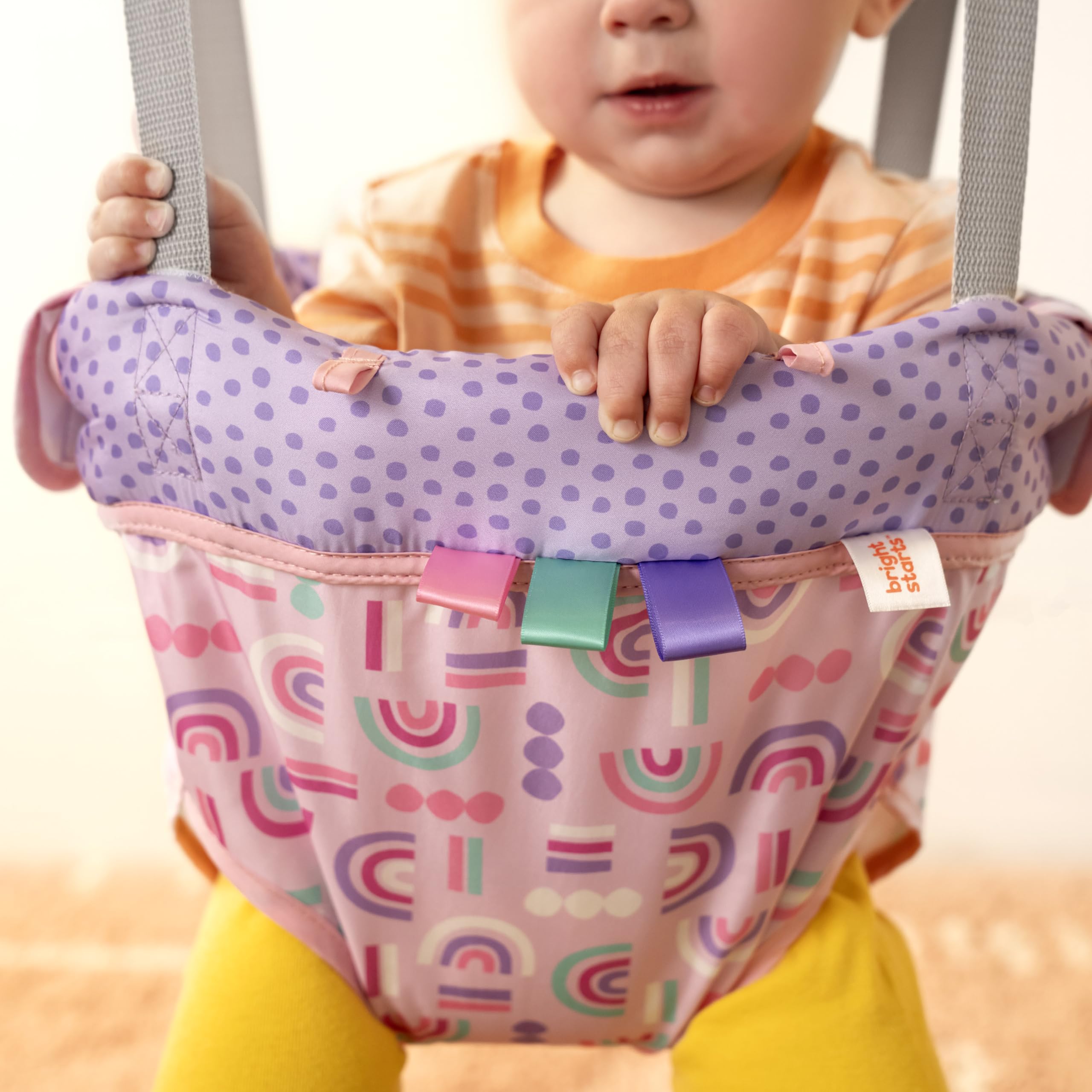 Bounce into playtime bliss with the Purple Paradise Door Jumper by Bright Starts, the #1 Manufacturer of Activity Jumpers!* This easy-to-use, supportive baby jumper is perfect for your little explorer, offering a secure, sturdy, and fun way to strengthen those growing muscles. Designed with parents in mind, it requires no tools for setupβsimply clamp it to most door frames for instant jumping fun. The durable, non-twist nylon strap and no-mark clamp provide safety and stability while keeping your doors pristine. The silky, colorful Taggies provide extra comfort and stimulation as baby plays. The Purple Paradise Door Jumper is suited for babies 4-12 months, up to 26 lbs. Features a padded seat ring for babyβs comfort and machine washable fabrics for your convenience! As your bouncing baby grows, adjust the straps to the perfect height in this high-quality jumper for baby. (*Circana, Retail Tracking Service, U.S., Activity Seats/Jumpers excluding No Jumping, dollar sales, 12 months ending October 2023).