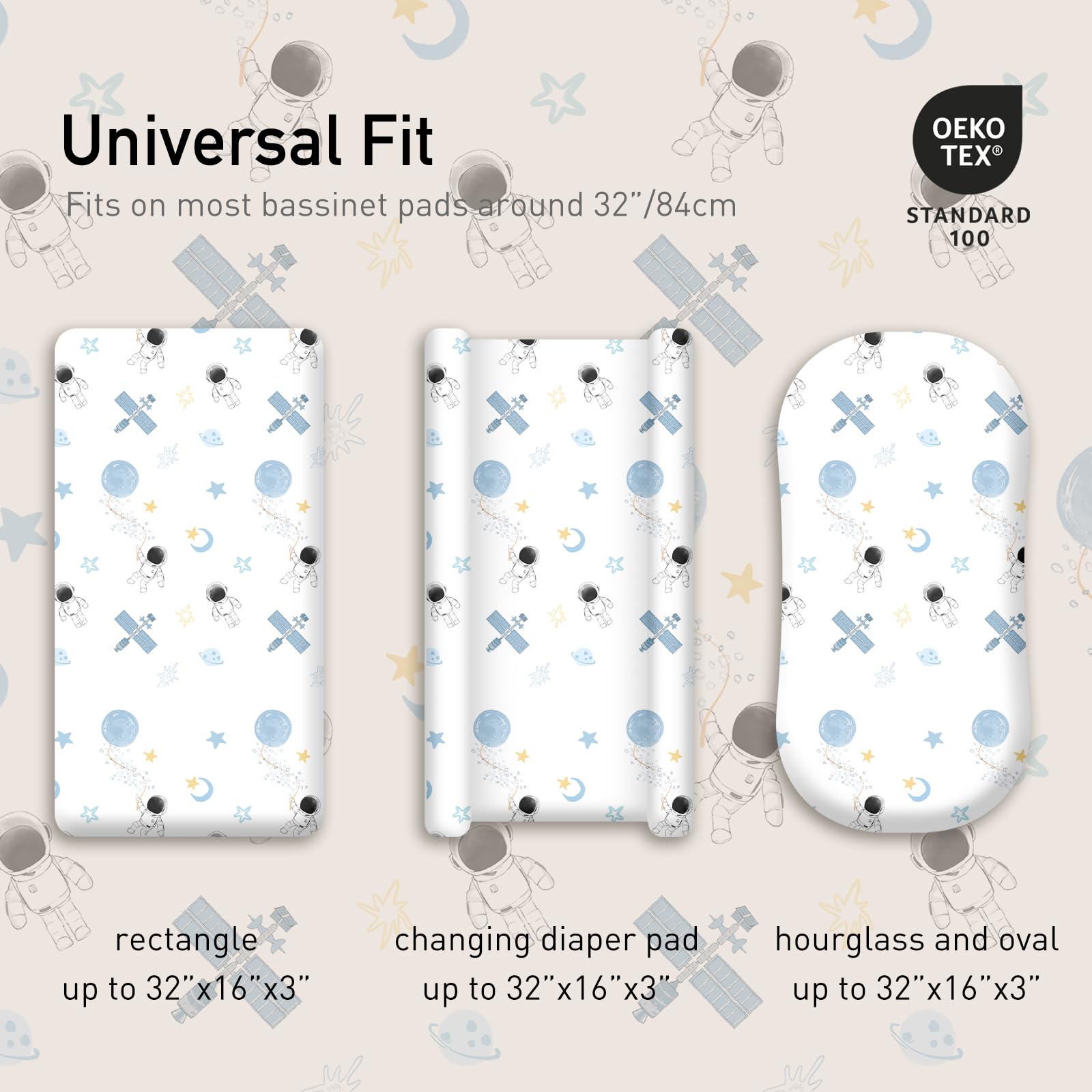 ONE SIZE FITS ALL (32"X16"X3"): Classic universal size. Not too big, not too small, smooth and snug to fit almost all bassinets, loungers, cradles, and co-sleepers' standard, oval, round, rectangle, and hourglass-shaped mattresses