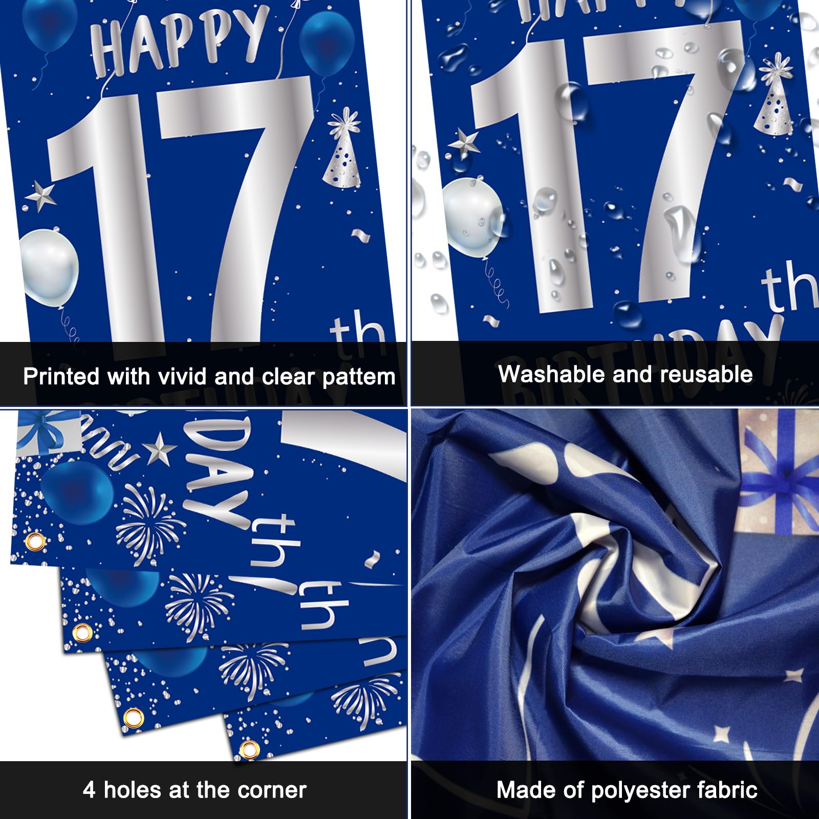 💙【High Quality & Safe Durable】The happy 17th birthday decorations balloons for boys are made of high quality thickened latex material, pressure resistant and durable, not easy to burst, can be used for a long time; The silver "HAPPY 17th BIRTHDAY" sign printed on the tablecloth, triangle flags, and birthday door banner is bright and colorful and won't fade easily.