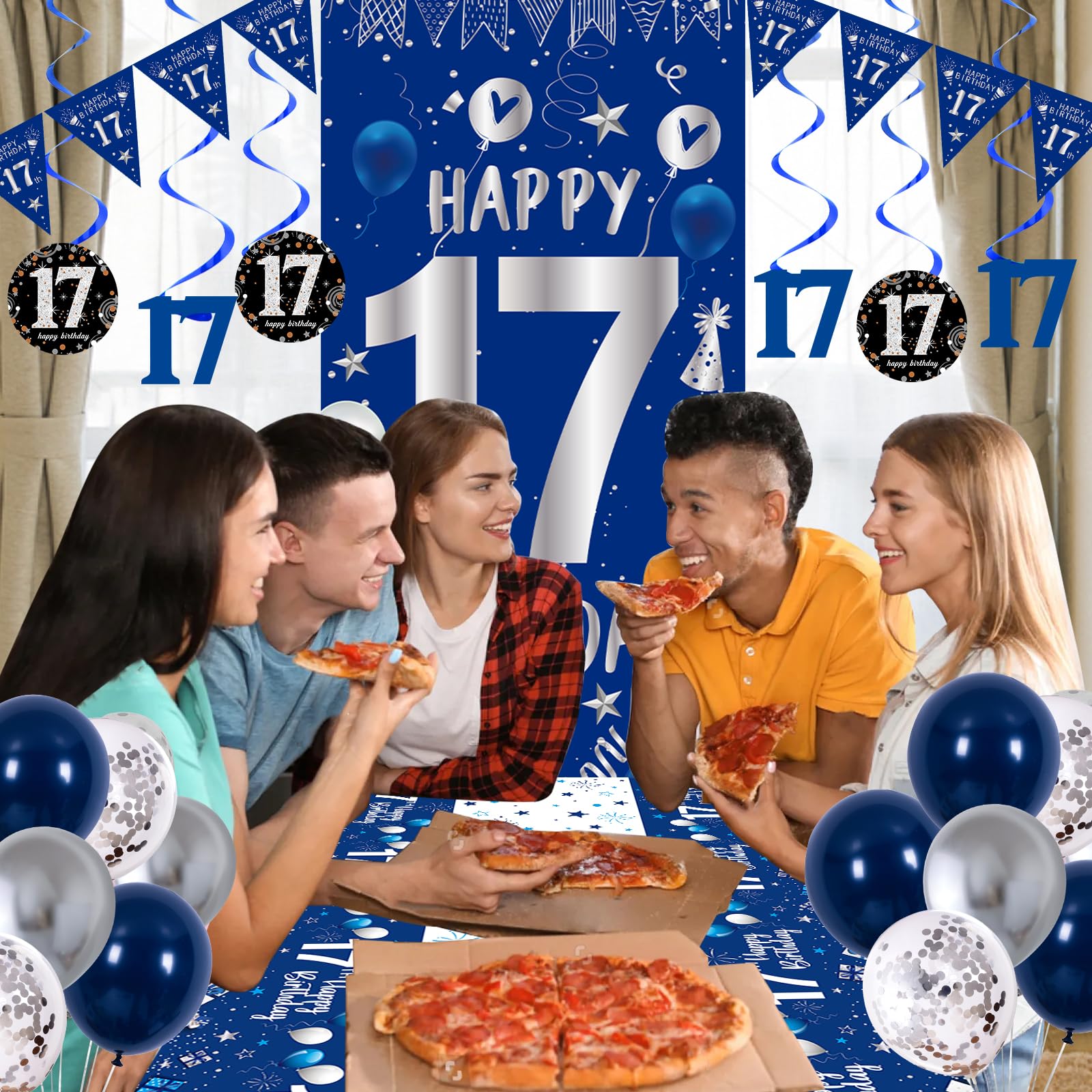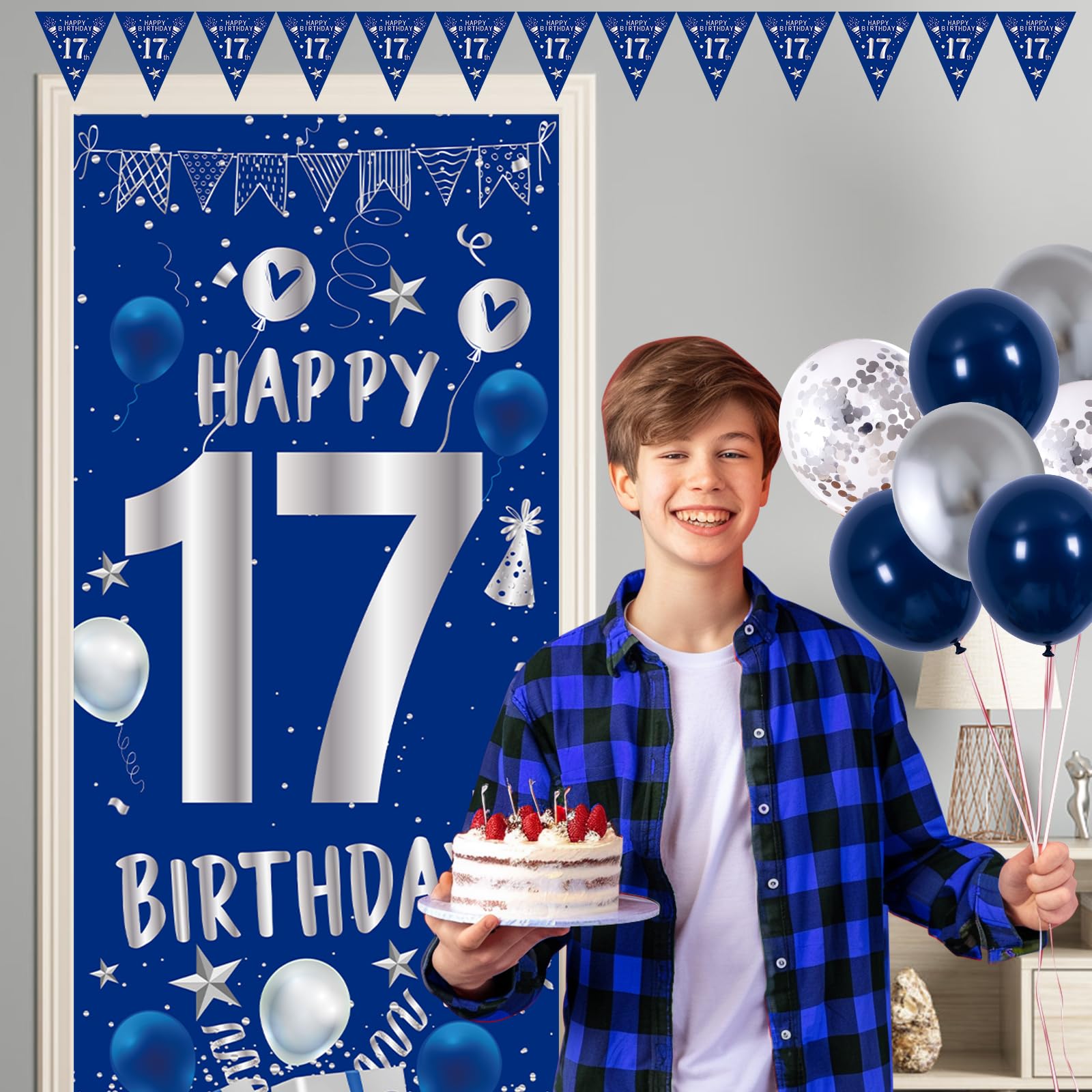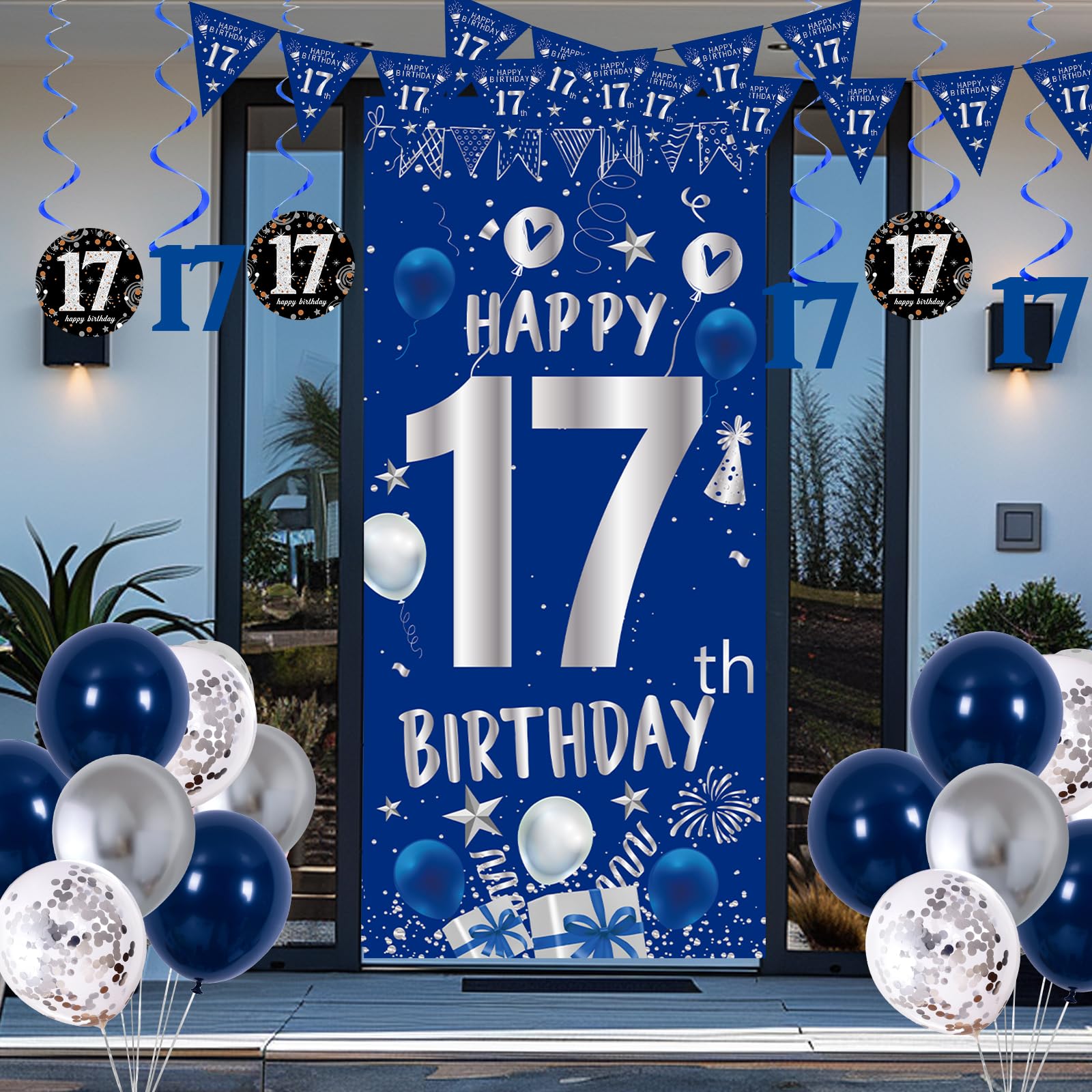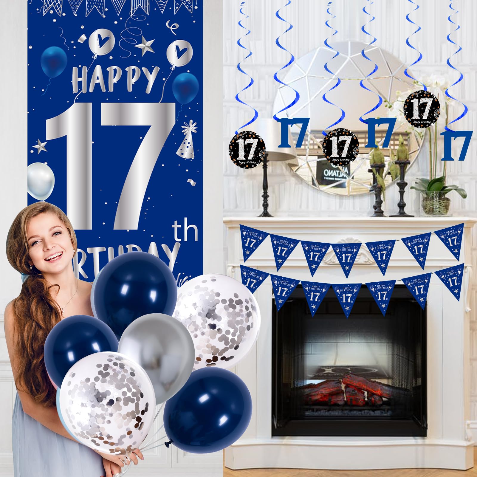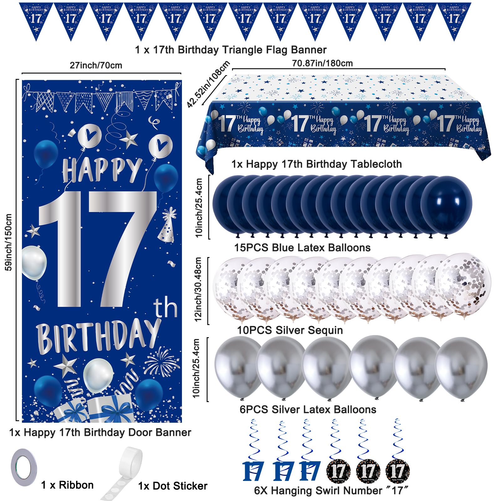 🎉【17th Birthday Decorations Kit for Boys Girls】This blue and silver happy 17th birthday decorations party supplies are designed for 17 year old boys and girls birthdays; Package list: 15x navy blue latex balloons, 10x silver confetti balloons, 6x silver latex balloons, 6x blue hanging swirls with number 17 pendant, 1x blue silver happy 17th birthday door banner, 1x blue silver 17th birthday tablecloth, 1 set x 17th triangle flag banner, 1x dot sticker, 1x ribbon.