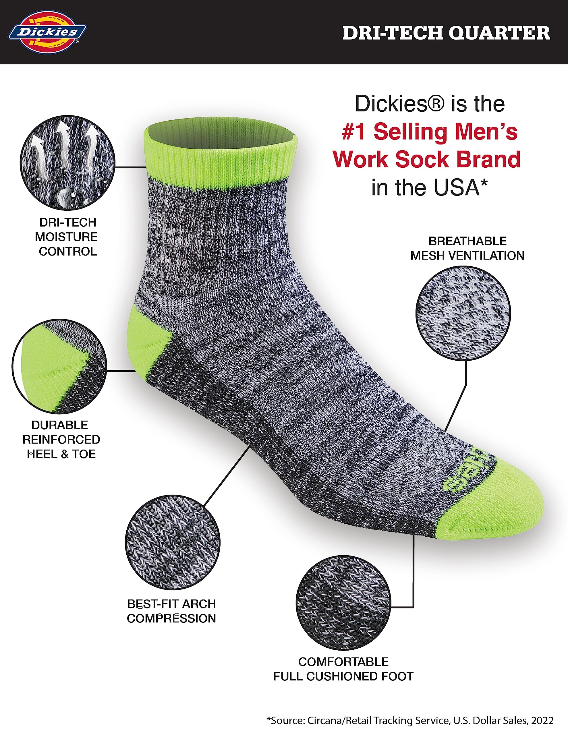 Description Dickies Men's Dri-tech Moisture Control Quarter Socks Multipack with wicking, moisture management fibers keeps feet dry, ventilation channels engineered for air circulation and moisture control, arch compression hugs feet and keeps socks in place, while providing in-step support, Reciprocated heel and toe for superior fit and full cushion comfort. For Over 95 Years Dickies has been making hard-duty work products built to stand up to whatever life throws at you. Dickies Work Socks are built with purpose to deliver superior comfort and performance on and off the job.