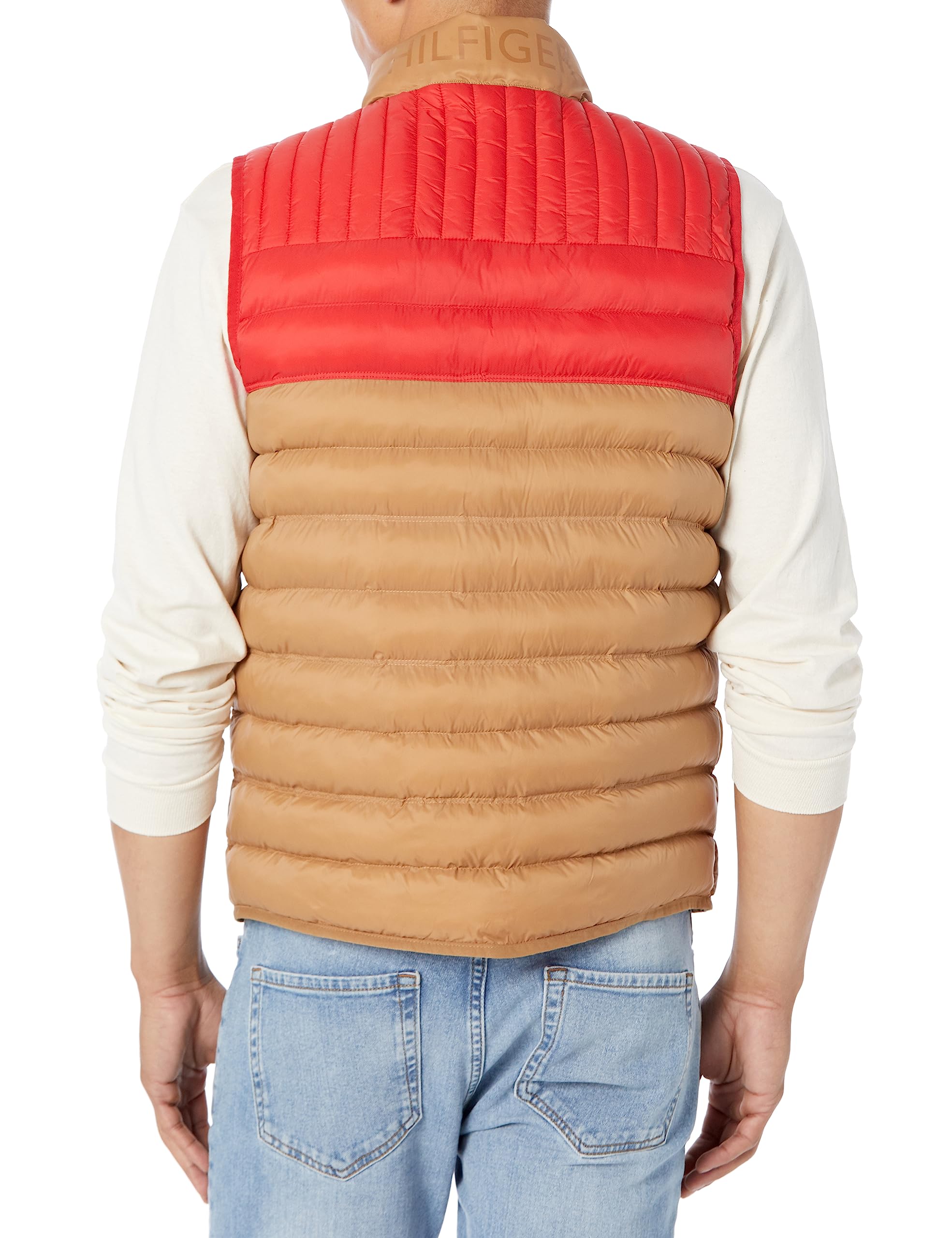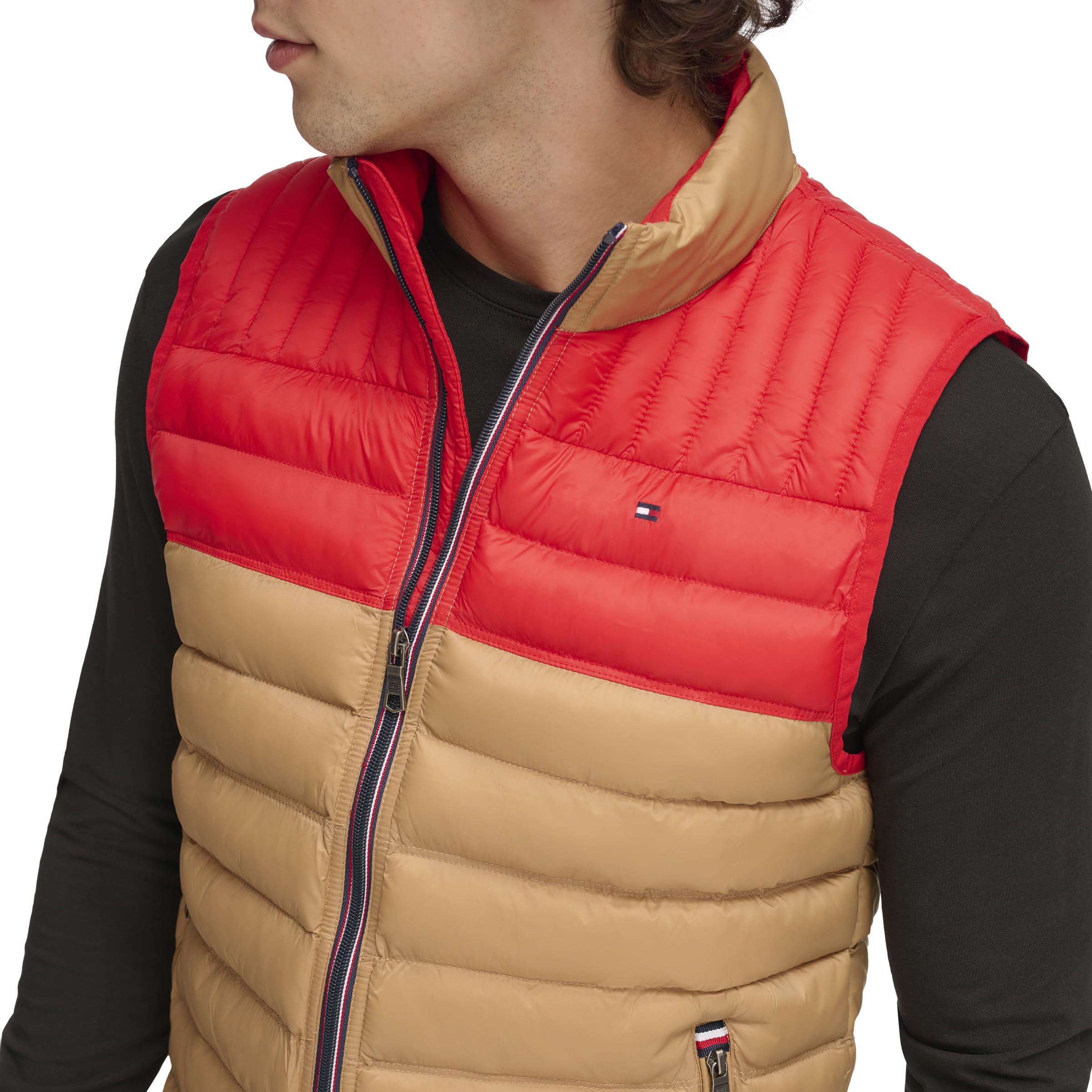 Description Nylon quilted lightweight puffer vest with Hilfiger logo printed on back of stand collar.