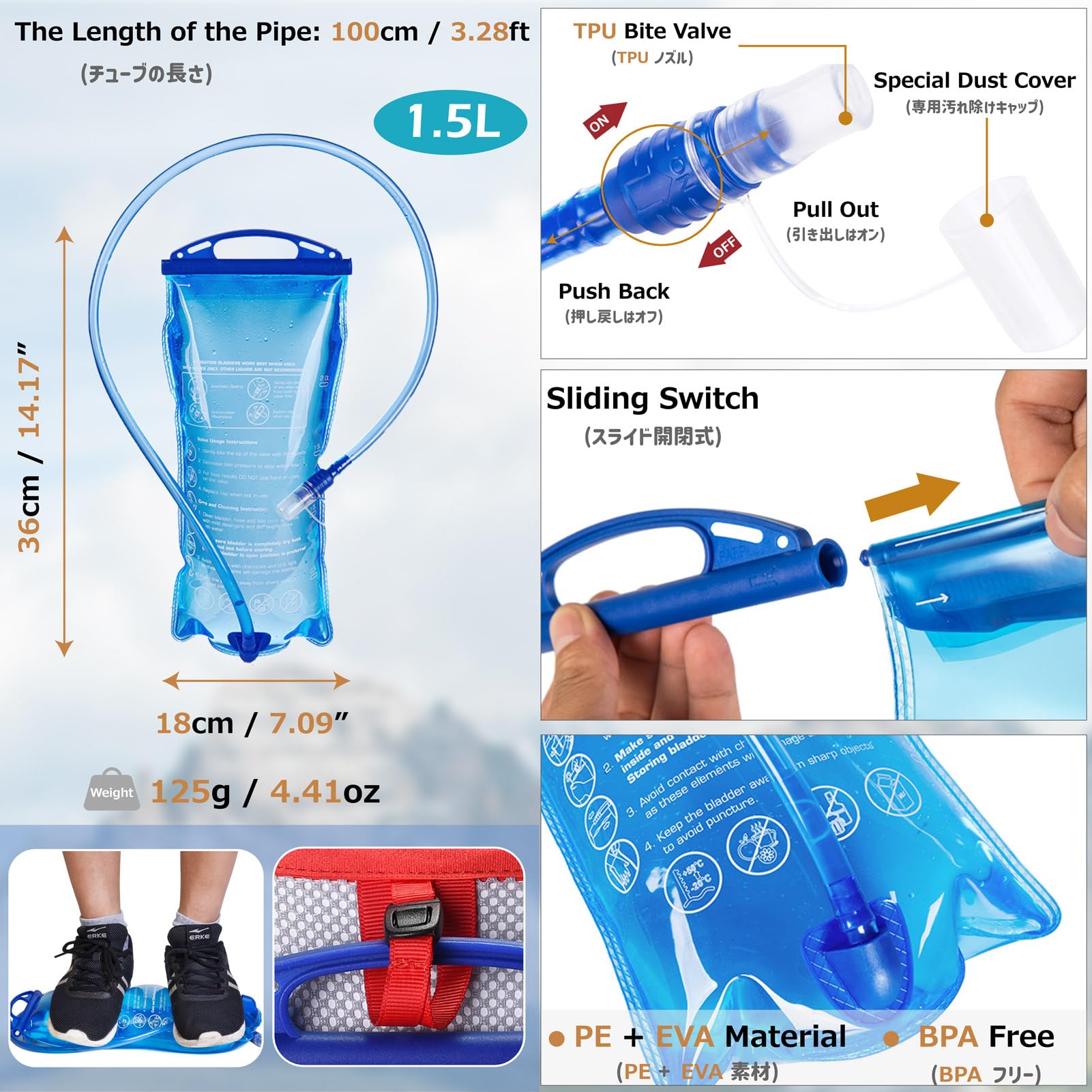 Hydration bladder: Equipped with a 1.5L water bladder made from PEVA material, free of BPA. The hydration bladder features complete pressure resistance and leak-proof functionality, ensuring sufficient water supply during various outdoor activities