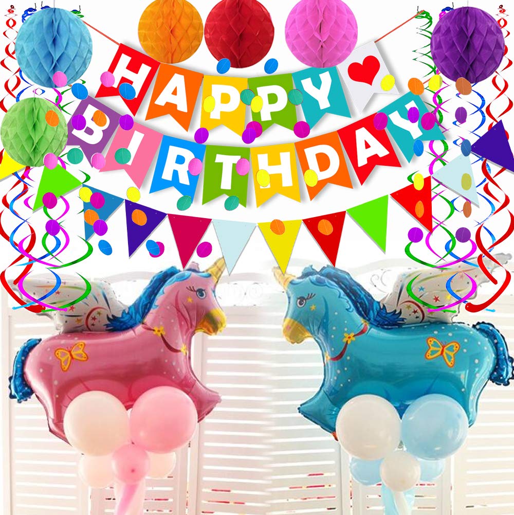 Color:Cute colorful,honeycomb is purple,orange,green,blue,red,pink.streamer is purple ,red,green,blue,happy birthday and confetti banner are colorful .Very Bright colors Perfect for adding to your party atmosphere.You can take a lot of beautiful pictures with these gorgeous banners decorations.