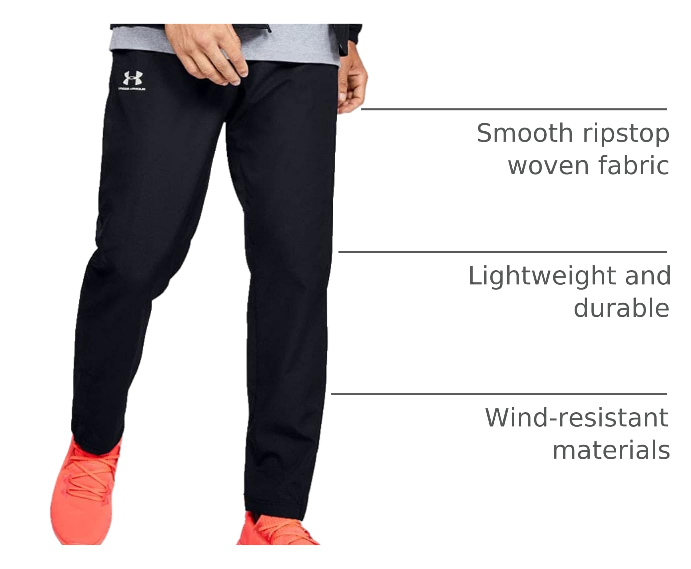 Description The goal with the UA Woven collection was to make the perfect set of warm-ups that keep your muscles ready, work for any sport, and also pack up super-small in your bag, so you can take them anywhere. Smooth, ripstop woven fabric is lightweight & extremely durable. Wind-resistant materials & construction shield you from the elements. Mesh lining delivers superior breathability & comfort. Encased elastic waistband with internal drawcord. Open hand pockets. 7"" ankle zips for easy on/off even over cleats. Inseam: 31.75"". Loose: Fuller cut for complete comfort. 100% Polyester.