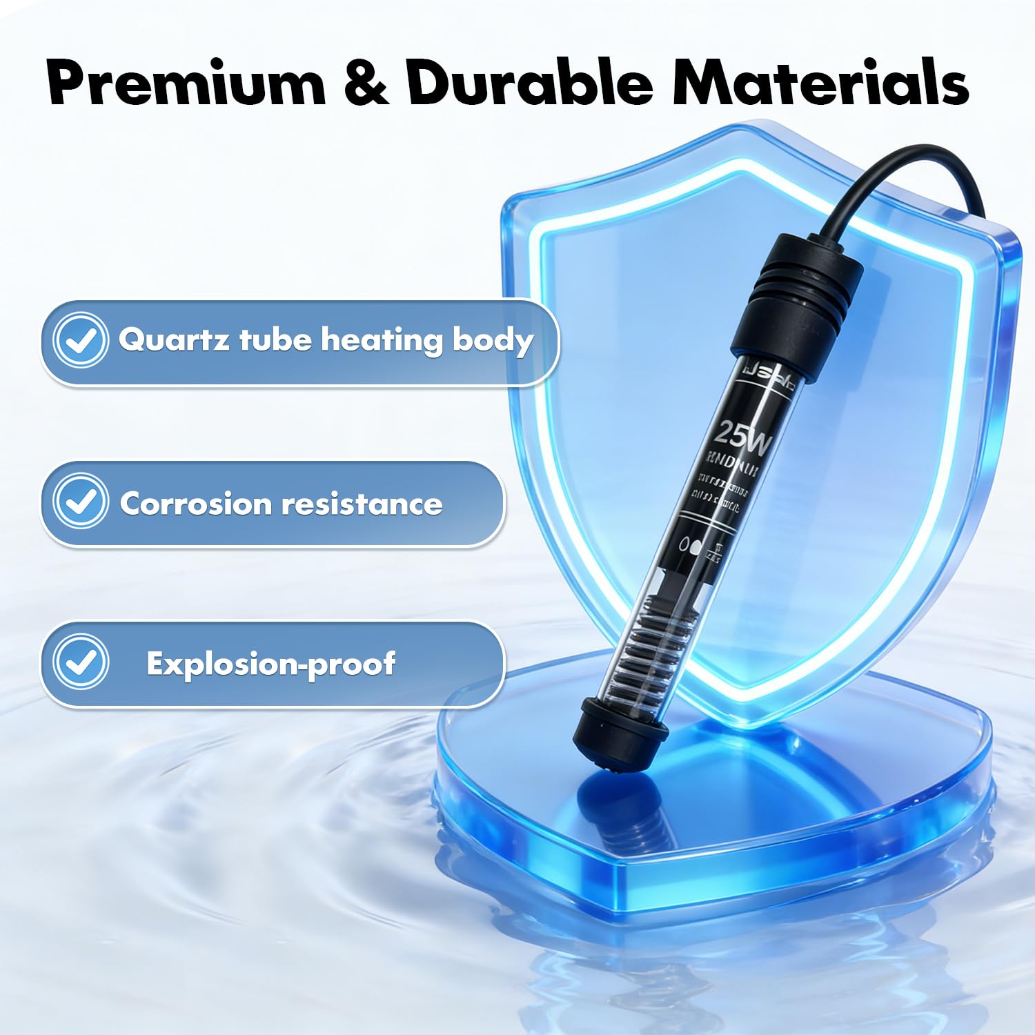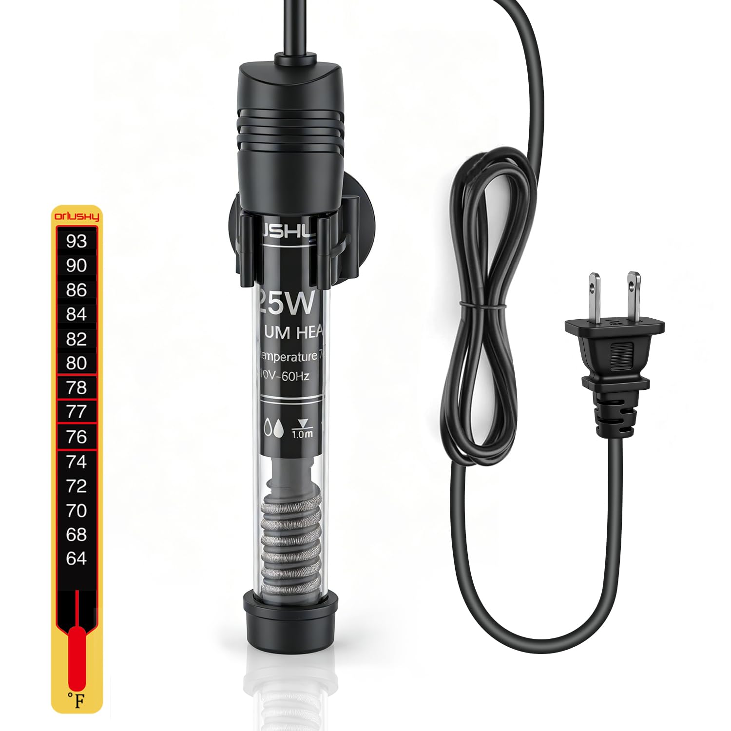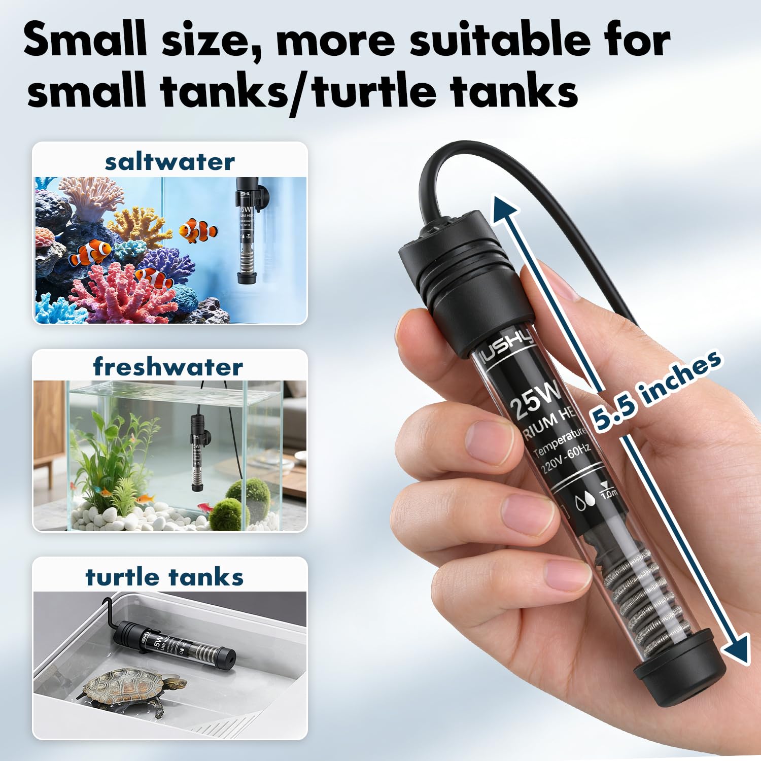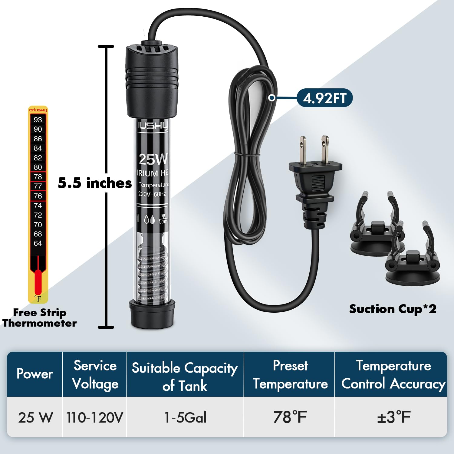 25W Aquarium Heater: Orlushy 25w fish tank heater can be applicable to 1-5 gallons tank. It is 4.7 inches in length, ideal for use in low water level and won’t take up mech place, easy to hide in small tank. Please fully submerged the heater vertically into water in fish tank, and horizontally into water in turtle tanks.