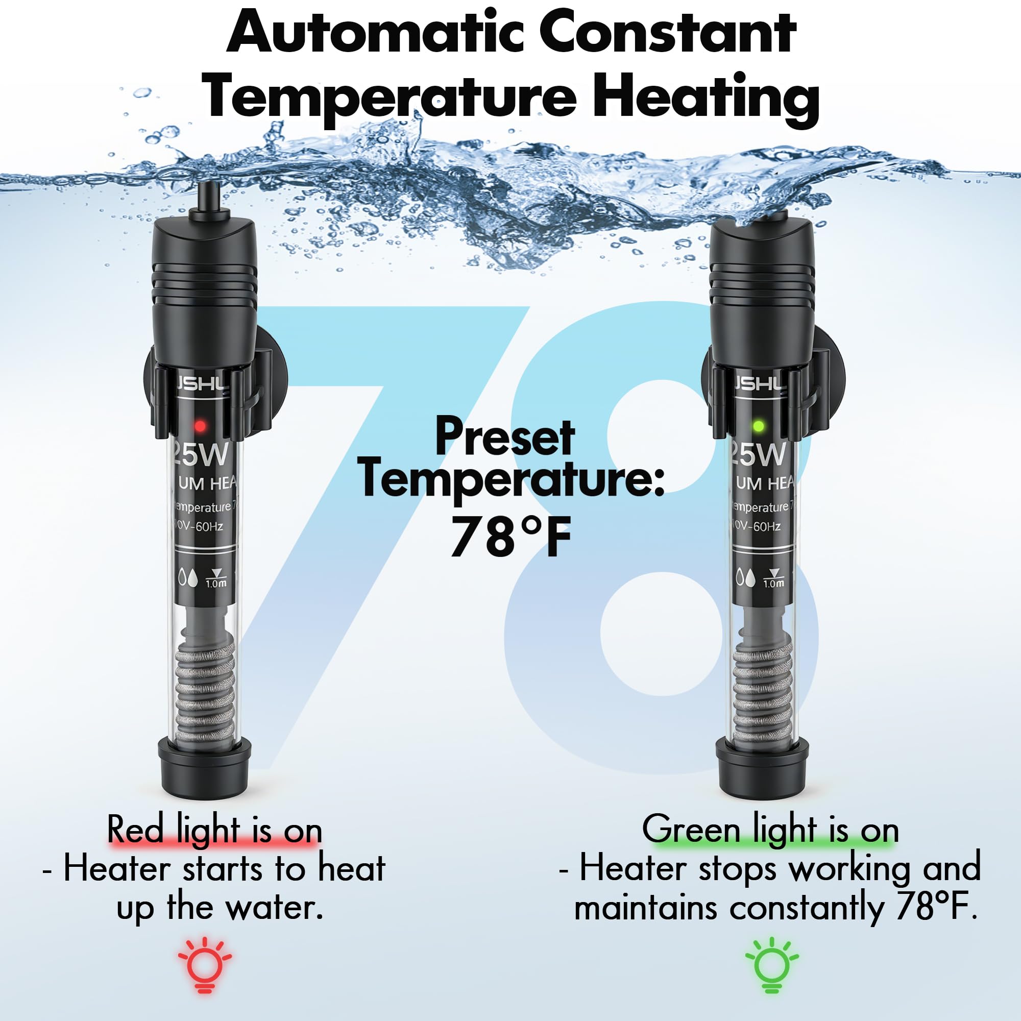 Easy to Operate: This aquarium heater is automatic constant temperature heating when the power is switched on. The preset temperature is 78℉. Accuracy is ±3℉. Stair shape heating that red light is on and heater starts to intermittently heat the water to the preset temp, saving energy and electricity. When green light is on, heater stops working and maintains constantly 78℉.