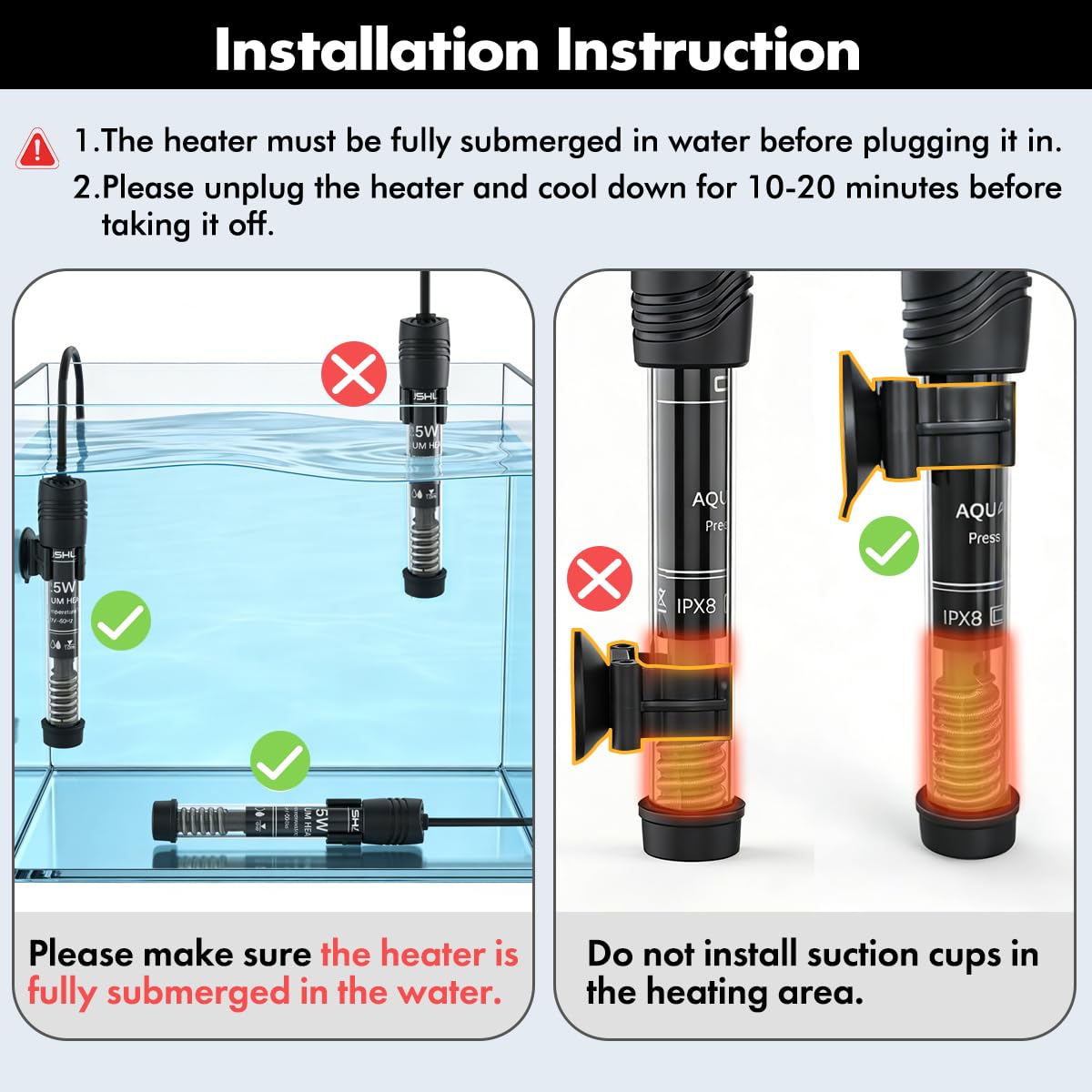 Cautions: 1.Please ensure the heater is 100% submerged into the water before plug in the power. 2. Please unplug the power and cool down the heater for 10-20 minutes before taking it out to clean the fish tanks or change the water.