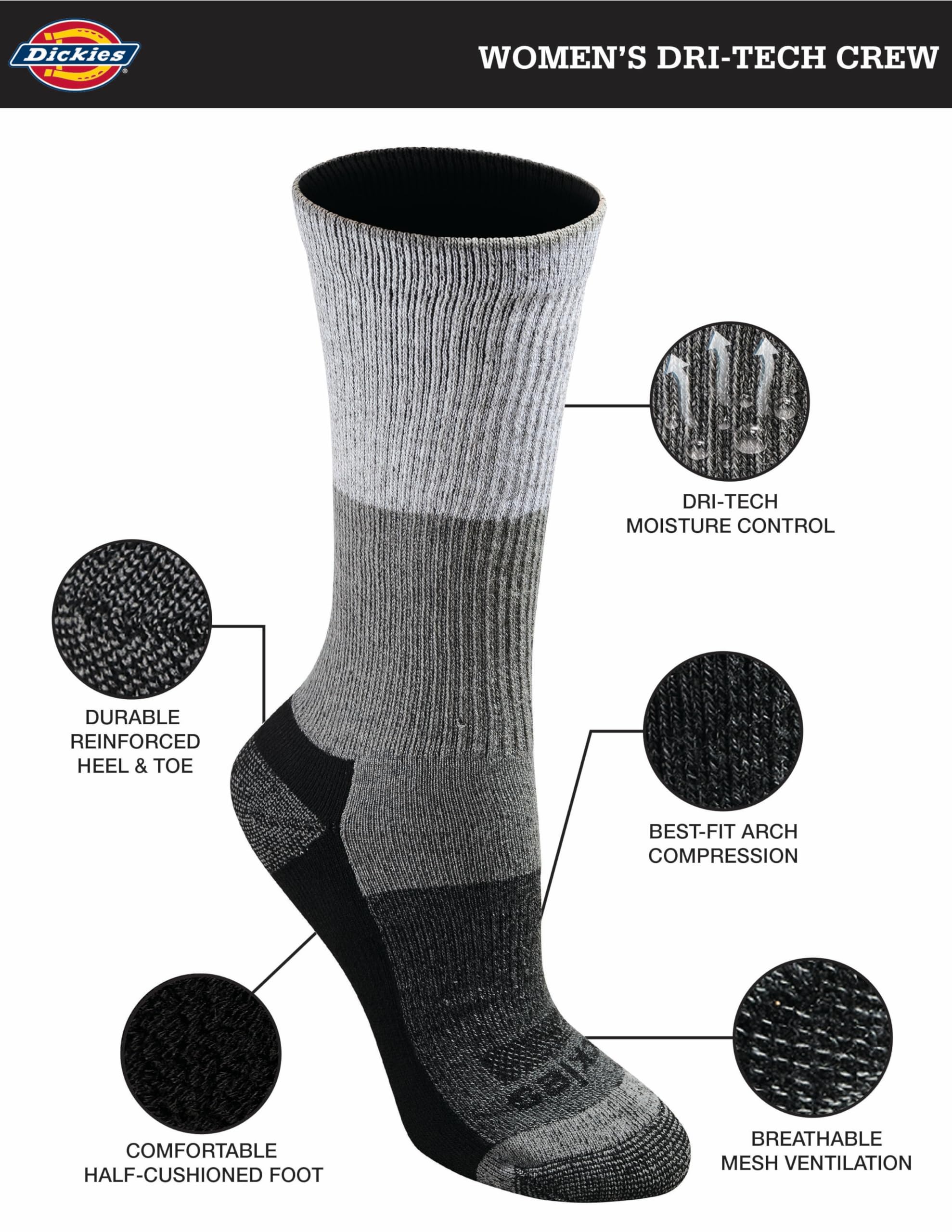 Description Dickies dri-tech moisture control for women's crew socks combines moisture wicking fibers and mesh ventilation channels to keep feet dry and comfortable. Since 1922 Dickies has been making hard-duty work products built to stand up to whatever life throws at you. Dickies Work Socks are built with purpose to deliver superior comfort and performance on and off the job. Dri-tech Moisture Control Sock Collection features: Moisture Management to help keep your feet cool, dry, and comfortable throughout the day.