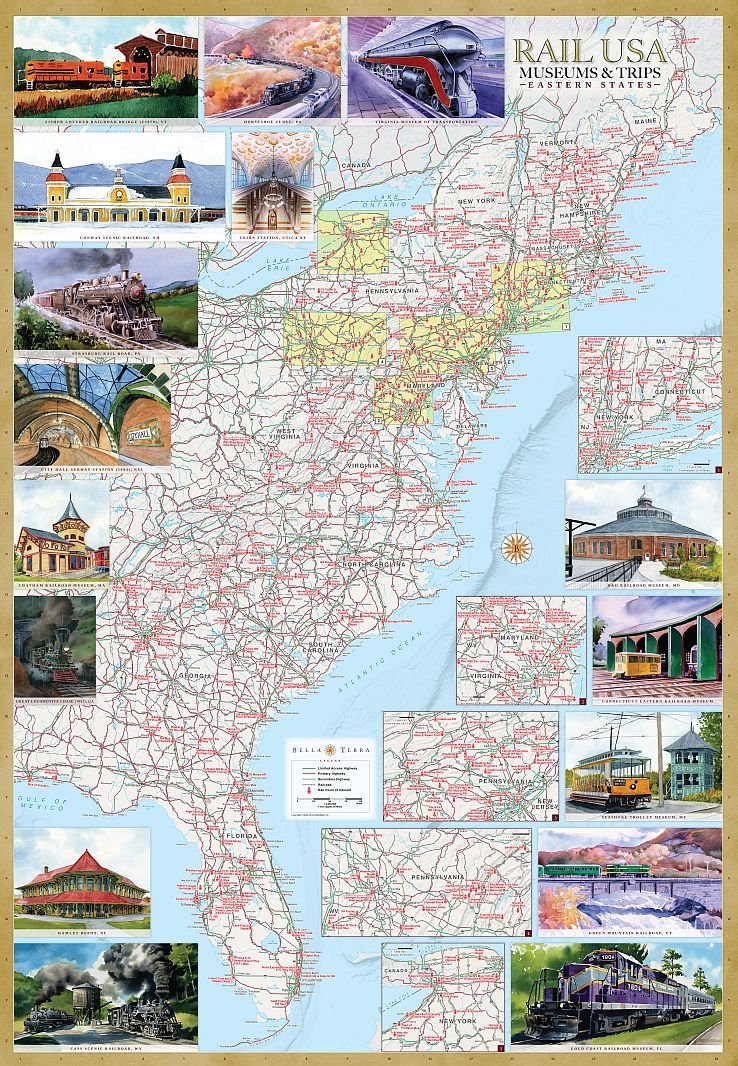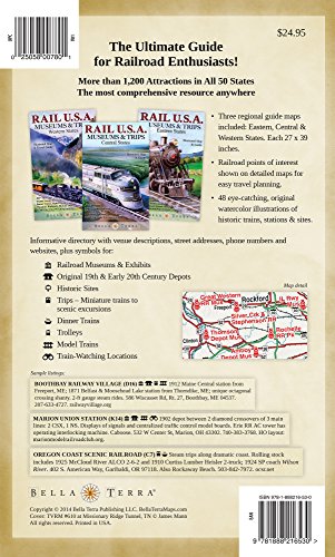 The ultimate guides for rail enthusiasts! More than 1,200 attractions in all 50 states. Three illustrated regional guide maps included: Eastern, Central & Western States. Rail museums, historic depots, scenic railroads, dinner trains, trolleys, model layouts, train-watching locations...and more...are located on detailed maps for easy travel planning. Directory includes descriptions of each venue and GPS-ready addresses and contact info. 48 eye-catching, original watercolor illustrations of historic trains, stations & sites. Each map is 27 x 39 inches, folded to 6 x 9-3/4 inches. Printed two sides. The three maps are wrapped in a ziploc bag with cardstock cover. Individual titles also offered separately on Amazon. For Eastern States, search 1888216476. Central States, search 1888216492. Western States, search 1888216514.
