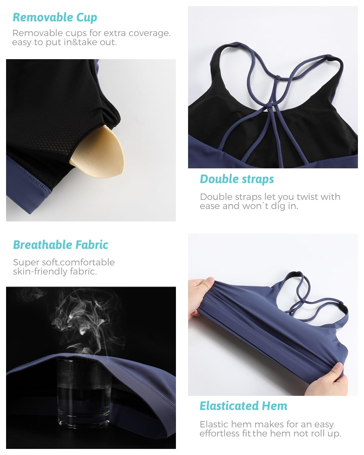 √YOUR SECURE FIT - Strappy design meets sporty style. Super soft scoop neckline with light, removable pads. Open cutout back styling sports bras for women medium support, widen band underneath the breast ensures a tight secure fit. Removable cups for extra coverage. The removable vertical cotton bra pads are easy to clean.The padded sports bra which always retains its shape and prevent bra bulges, caresses your figure to adjust to your curves.