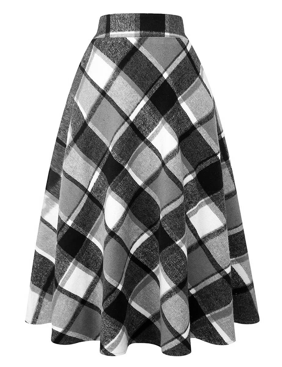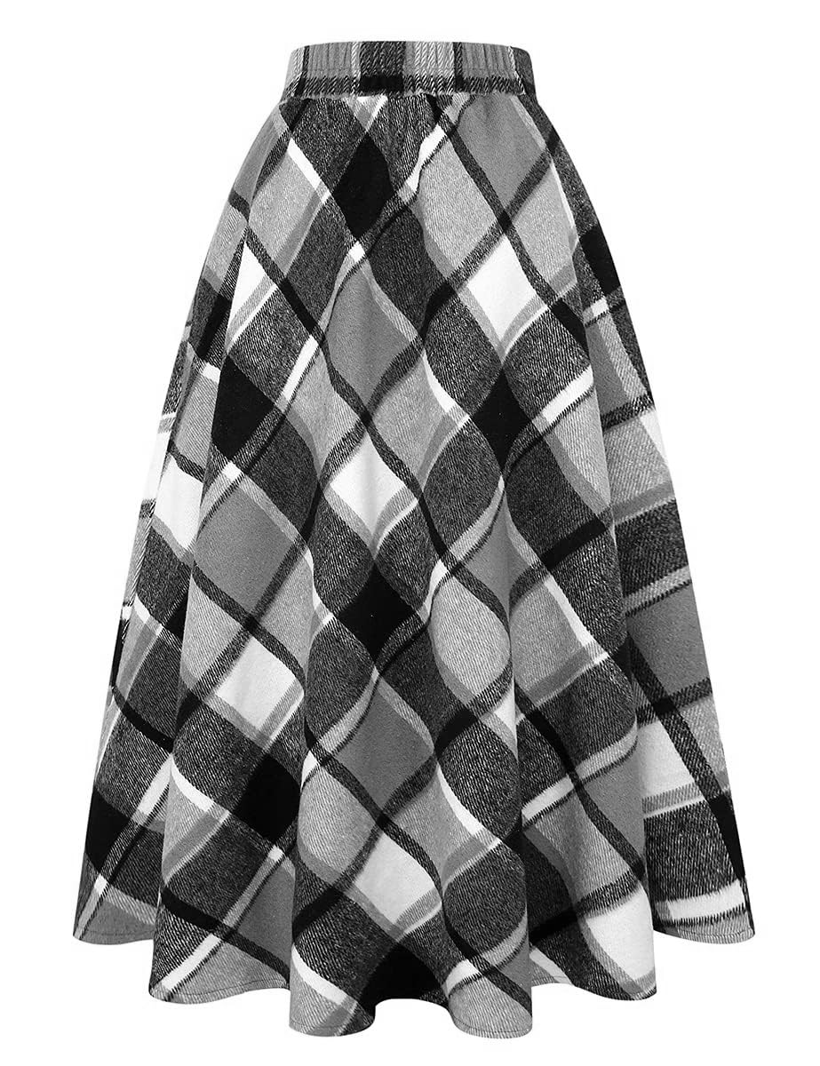Style: Casual vintage mid-long aline pleated flared wool plaid skirts for junior/ladies fall fashion outfits winter clothes long maxi skirt