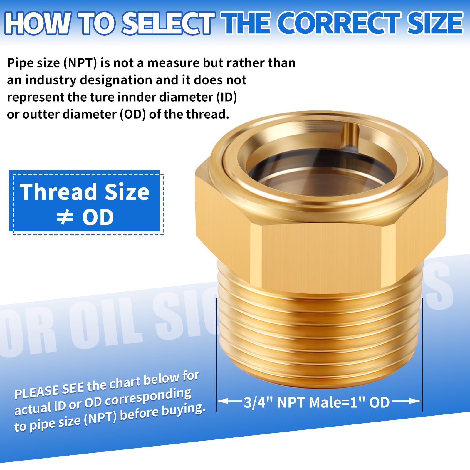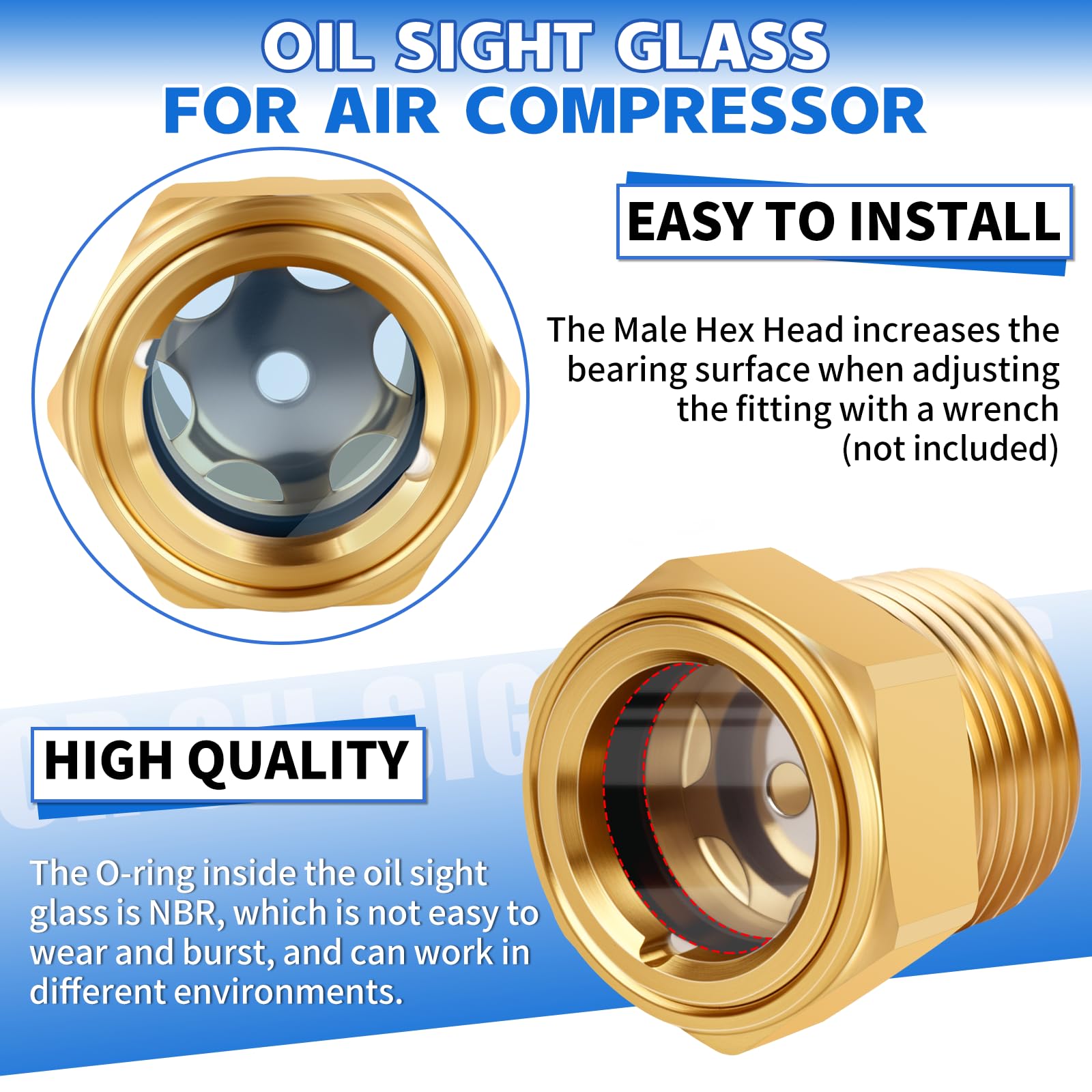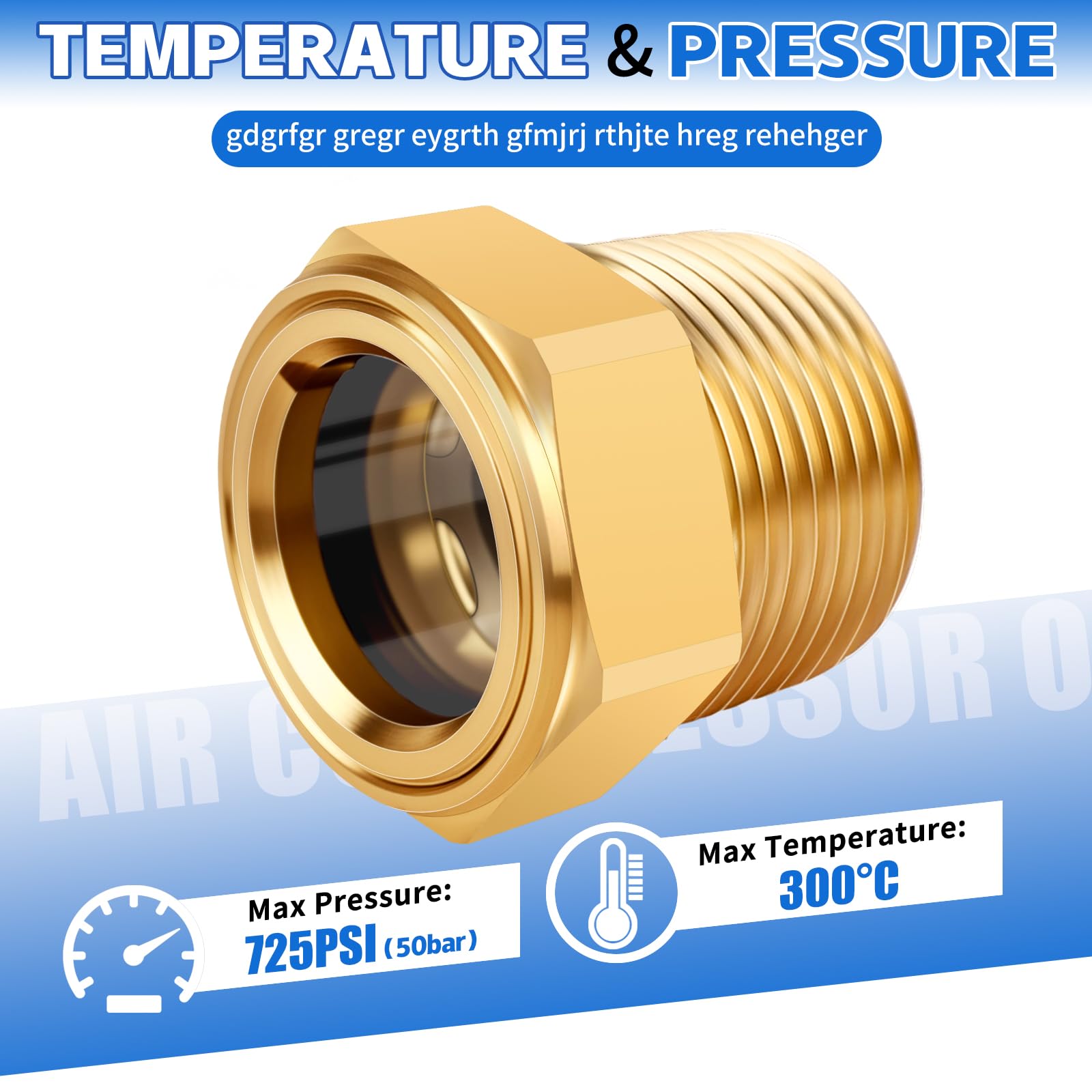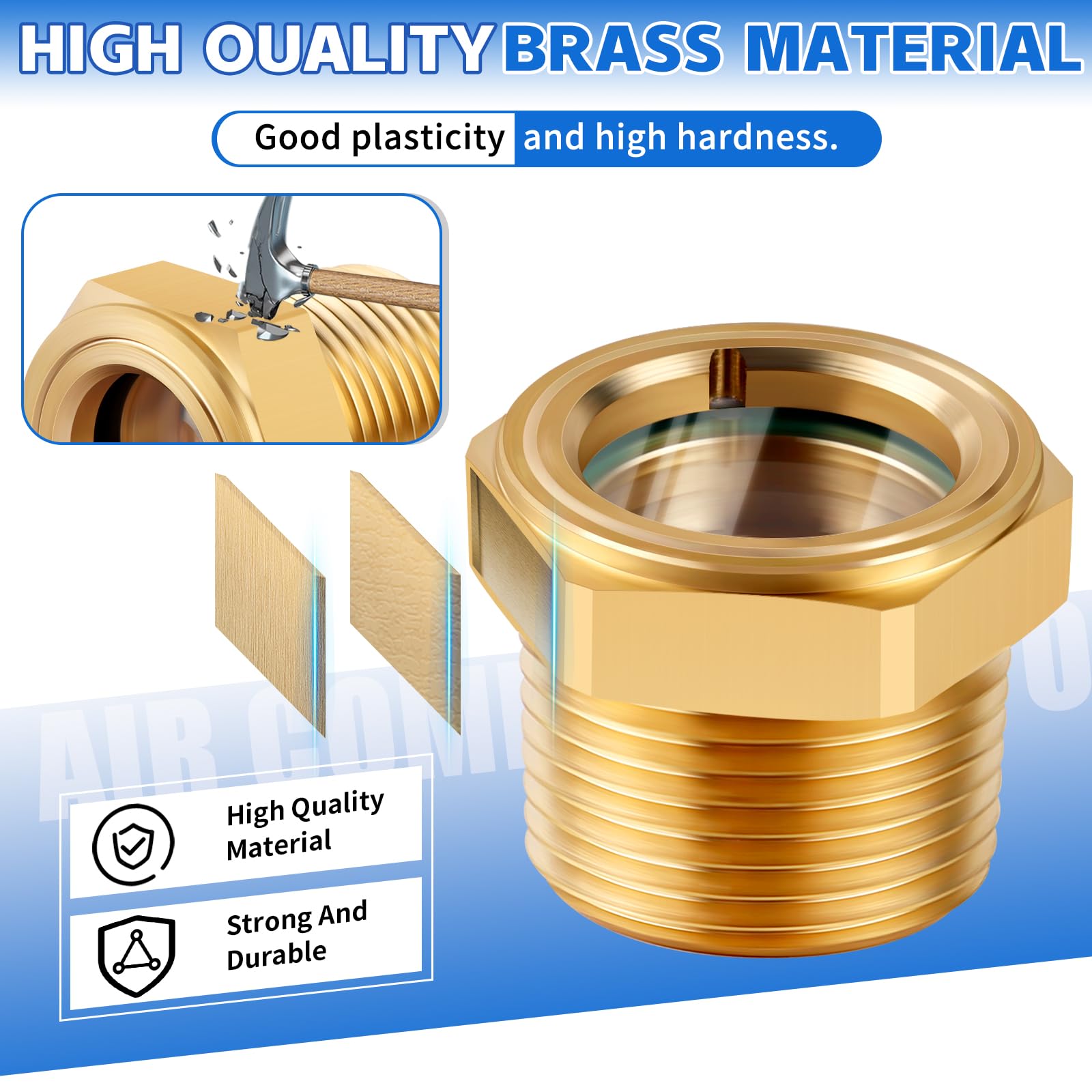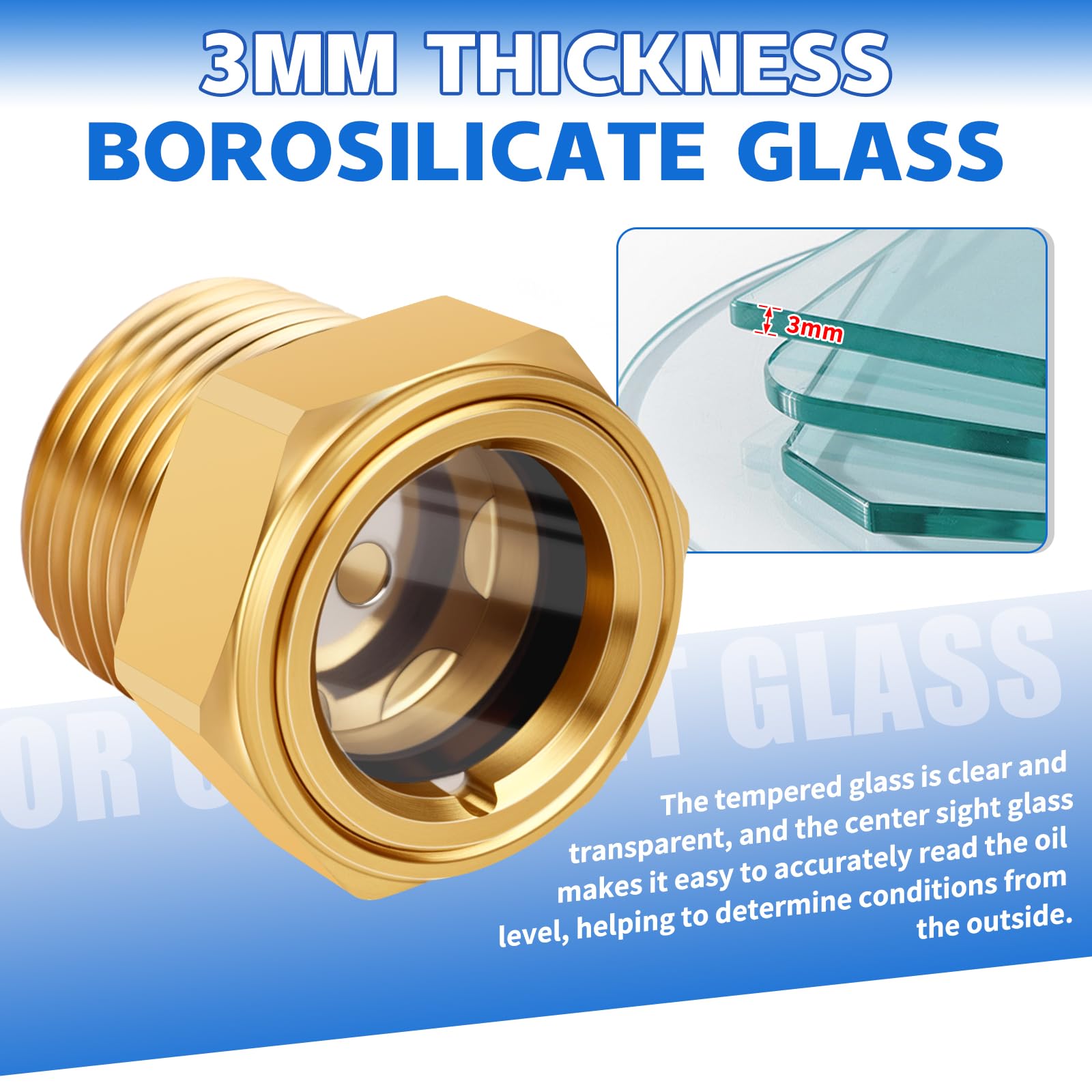 【Good Transparent View 】The 3/4 NPT brass oil level sight glass with tempered glass which the thickness is 3mm , can provide you with a good transparent sight view and has a good has a good ability to withstand pressure, the compressor oil sight glass is also with baffle which help you can easily observe the change of medium.