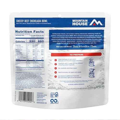 Mountain House Cheesy Beef Enchilada Bowl is everything you want in a camping meal: soul-satisfying taste, and effortless prep. Ground beef, melted cheese, rice, beans, and corn tortillas smothered in bold red enchilada sauce. Inside, you'll find two servings packed with flavor and completely free of artificial flavors and preservatives. Plus, it's gluten-free certified by GFCO. Mountain House Cheesy Beef Enchilada Bowl tastes like the real thing because it is the real thing. Experience the ultimate in convenience with Mountain House’s camping enchiladas. These freeze-dried meals make enjoying a delicious enchilada bowl in the backcountry as easy as adding hot water to the pouch. Enjoy a hot, hearty meal straight from the pouch in 15 minutes with no refrigeration or extra cleanup required. Mountain House meals deliver all the flavor with none of the hassle. Every Mountain House meal is carefully crafted in small batches and freeze-dried to lock in flavor and nutrients. Whether you're hiking, camping, or need emergency food for your stash, our meals are lightweight, easy to pack, and absolutely delicious. Remember to recycle your used Mountain House pouches for free through TerraCycle to keep nature clean for future adventurers. Serving up deliciously satisfying meals since 1969, Mountain House has the longest shelf life in the business, and we back this claim with our 30-Year Taste Guarantee. Mountain House is your go-to for camping food, backpacking food, or an emergency food supply that lasts when you need it most. Elevate your outdoor meals with Mountain House - where convenience, flavor, and adventure come together. It's not just freeze-dried camping food, it's a legacy of flavor and reliability.