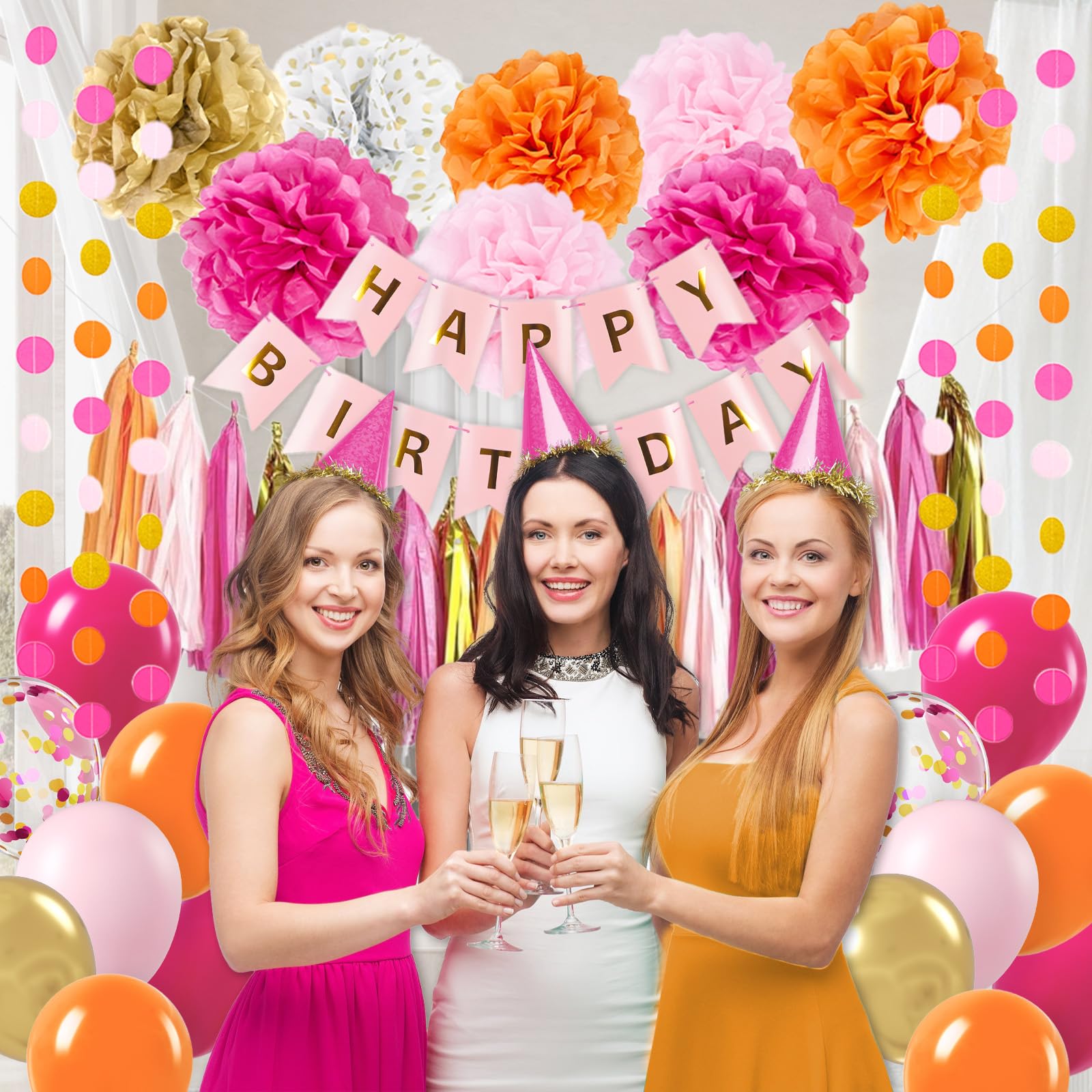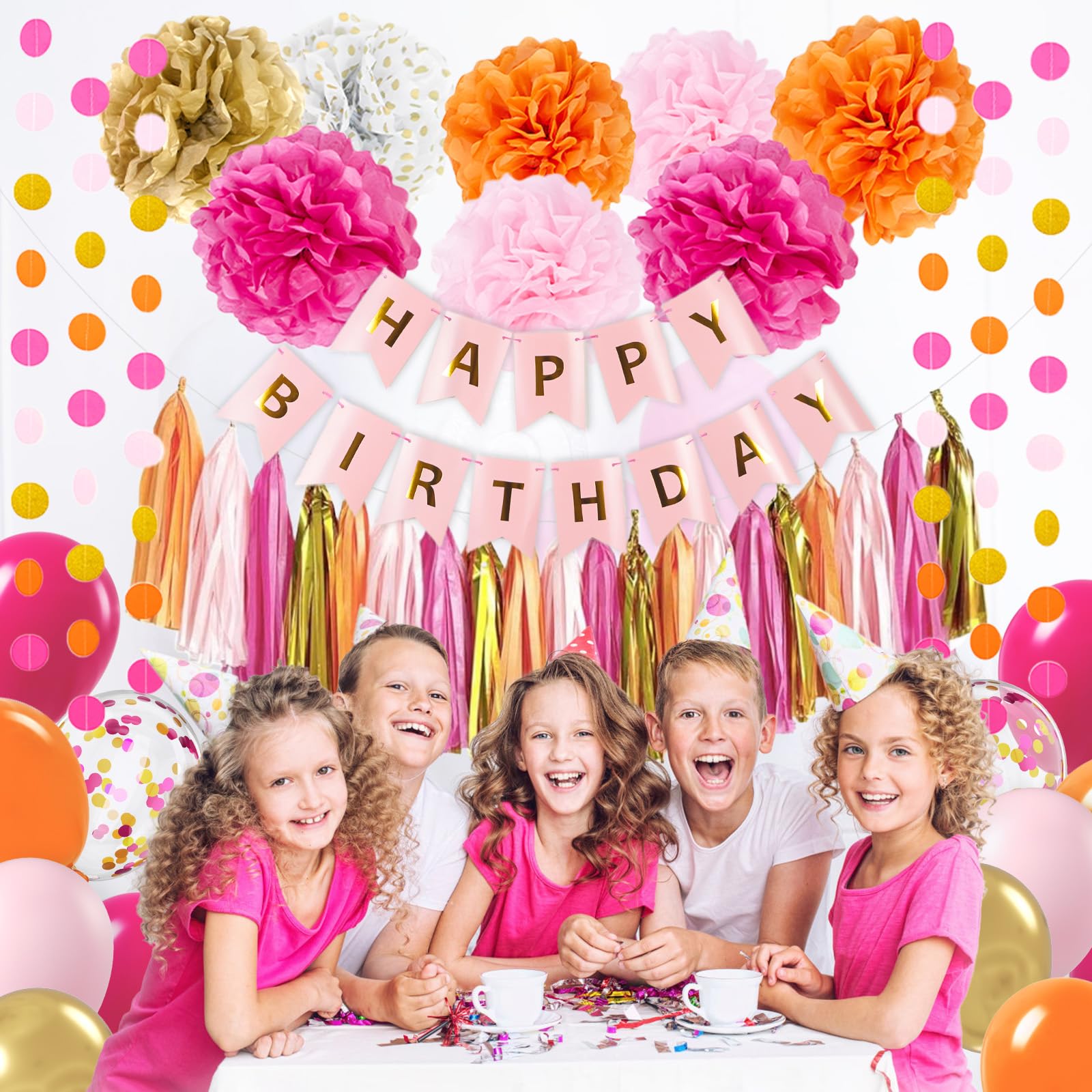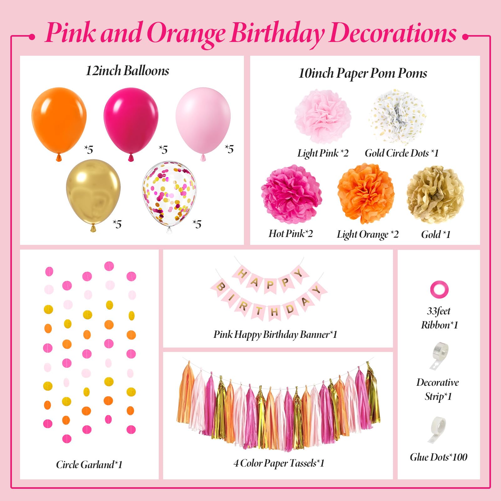 Package Includes:The orange and pink party decorations include 8pcs paper pompoms light pinkx2, light orangex2, hot pinkx2, goldx1, 12inch balloonsx20 light pinkx5, orangex5, hot pinkx5, goldx5, 12inch gold and pink confetti balloonsx5, happy birthday bannerx1, 4 color paper tasselsx1, circle garlandx1, glue dotsx100, decorative stripx1, ribbonx1
