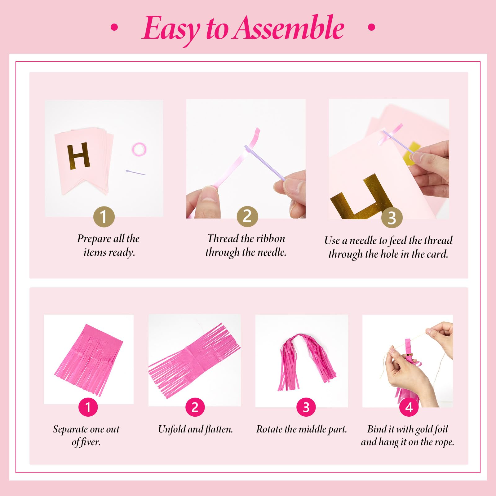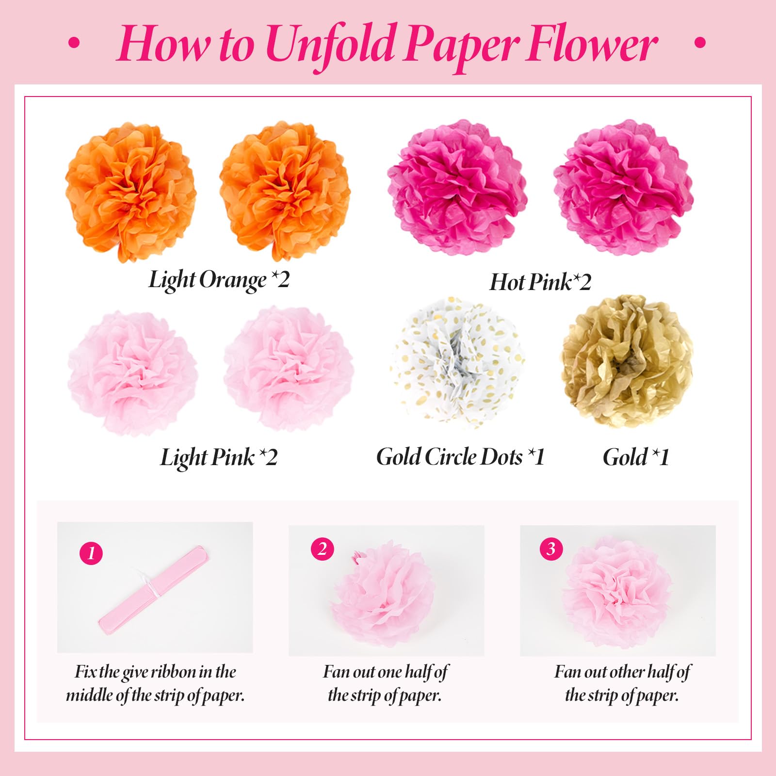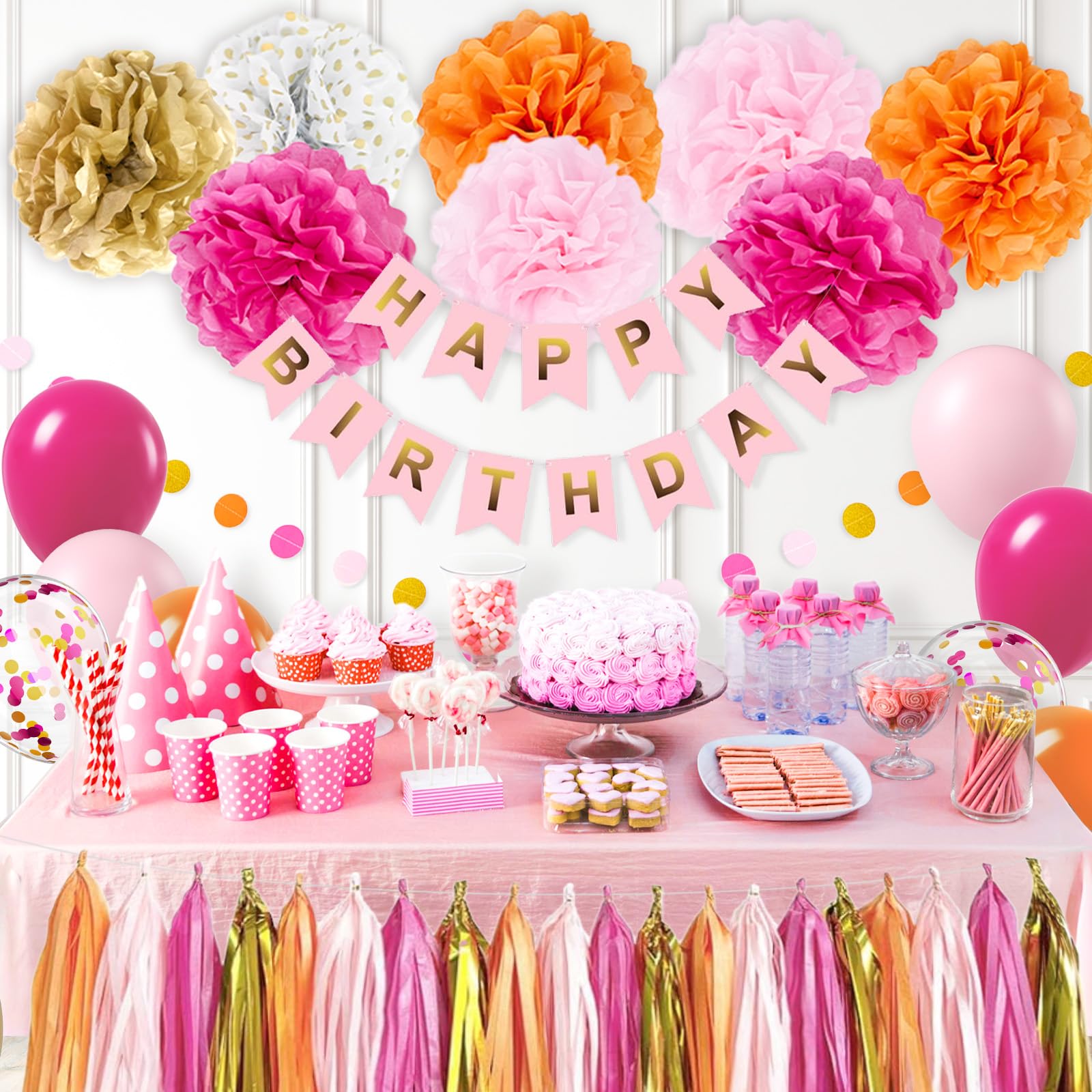 Package Includes:The orange and pink party decorations include 8pcs paper pompoms light pinkx2, light orangex2, hot pinkx2, goldx1, 12inch balloonsx20 light pinkx5, orangex5, hot pinkx5, goldx5, 12inch gold and pink confetti balloonsx5, happy birthday bannerx1, 4 color paper tasselsx1, circle garlandx1, glue dotsx100, decorative stripx1, ribbonx1