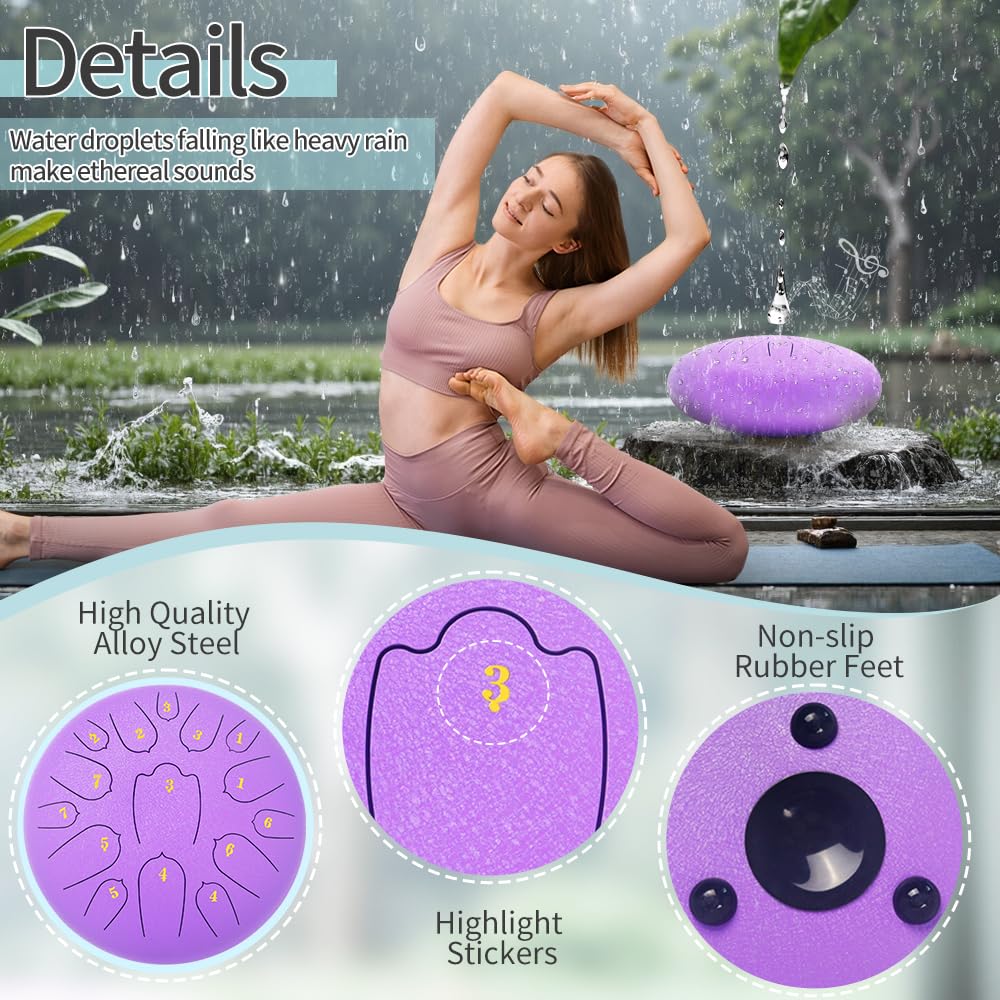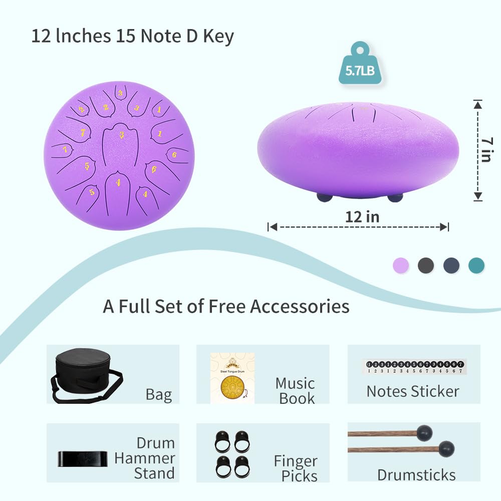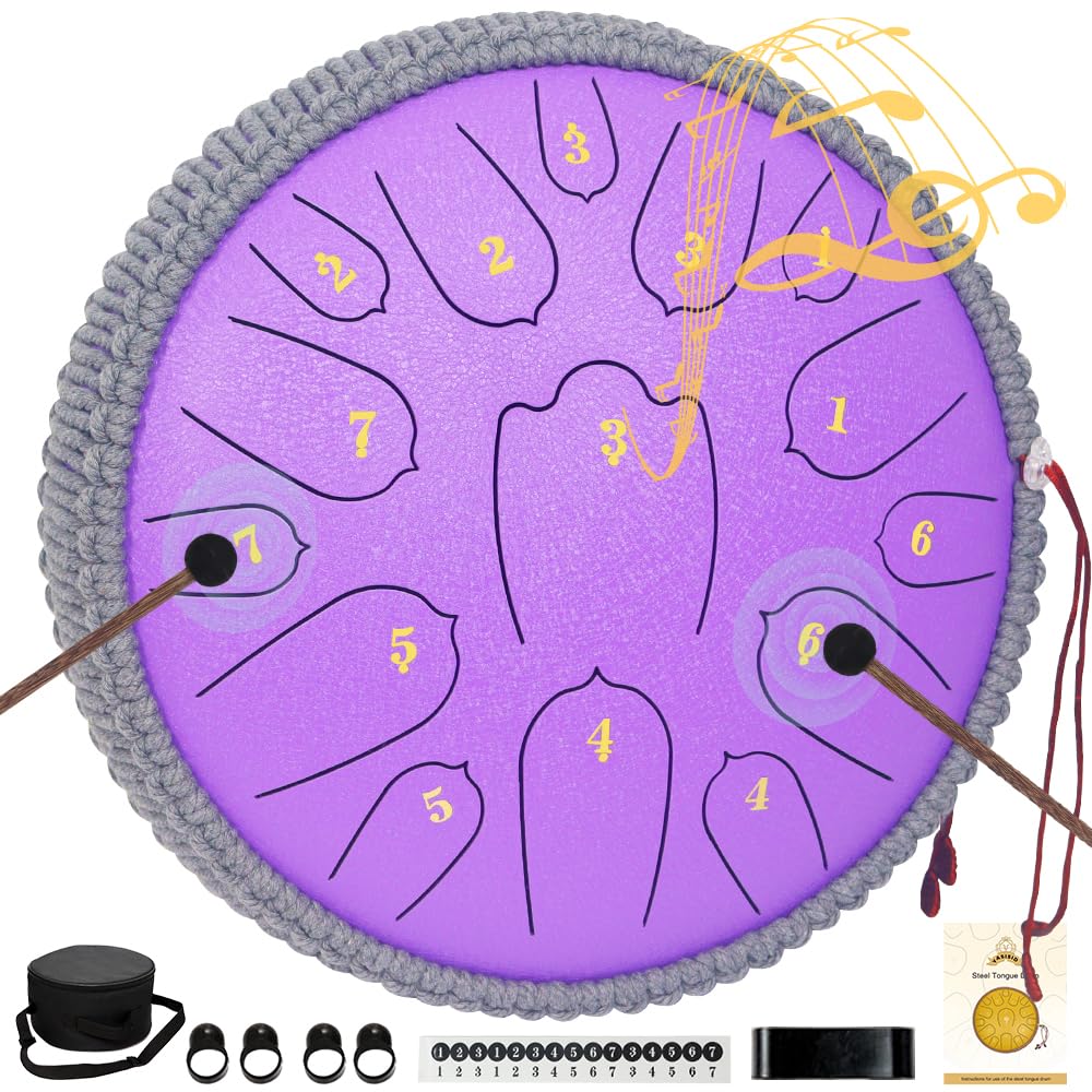 ♫【Package Included】12 inches steel tongue drum * 1, drumstick * 2, drumstick bag * 1, 2 set of notes sticker, drumstick bracket * 1, music book*1, finger sleeves*4, soft bag with strap * 1, Please feel free to reach us by message to contact our awesome support team.