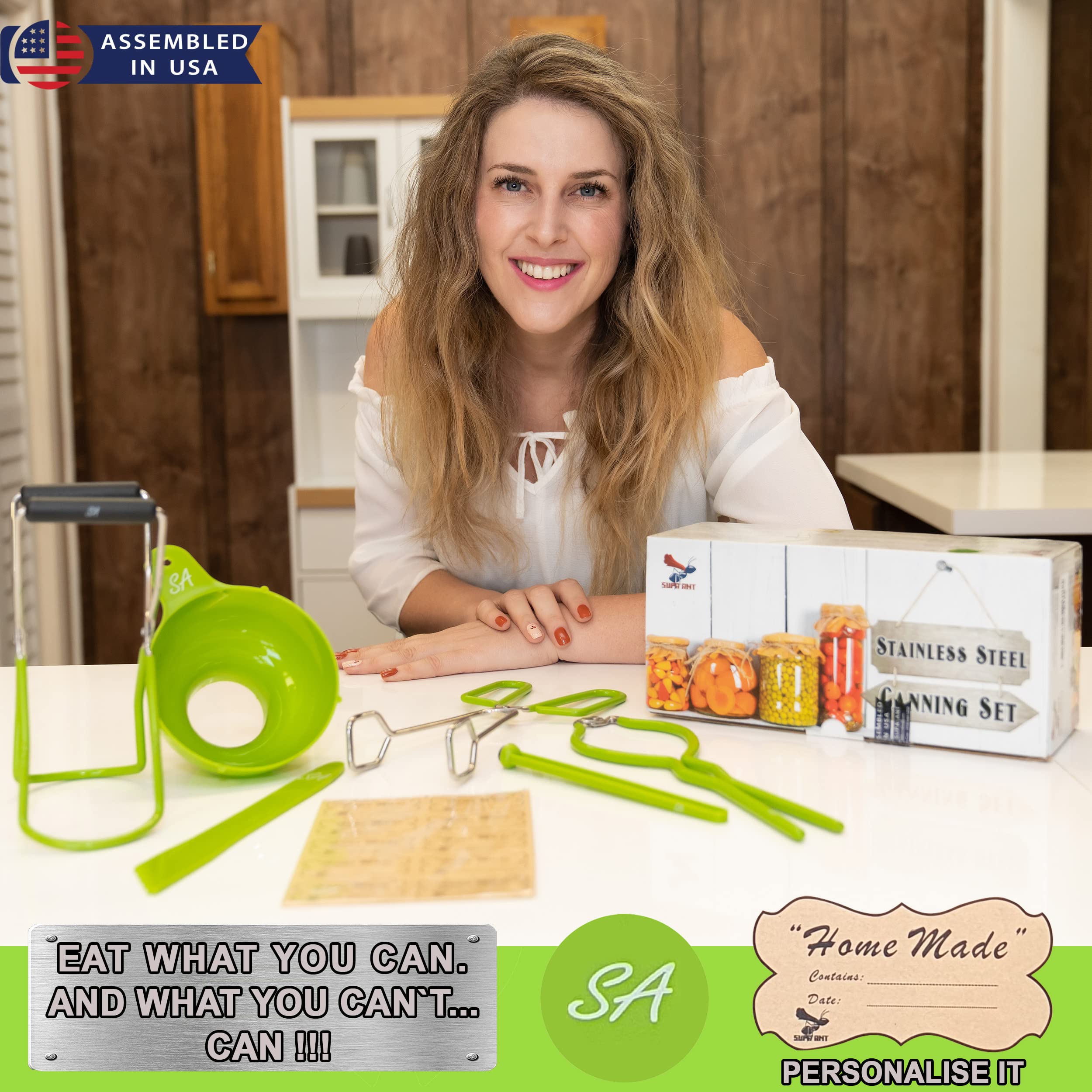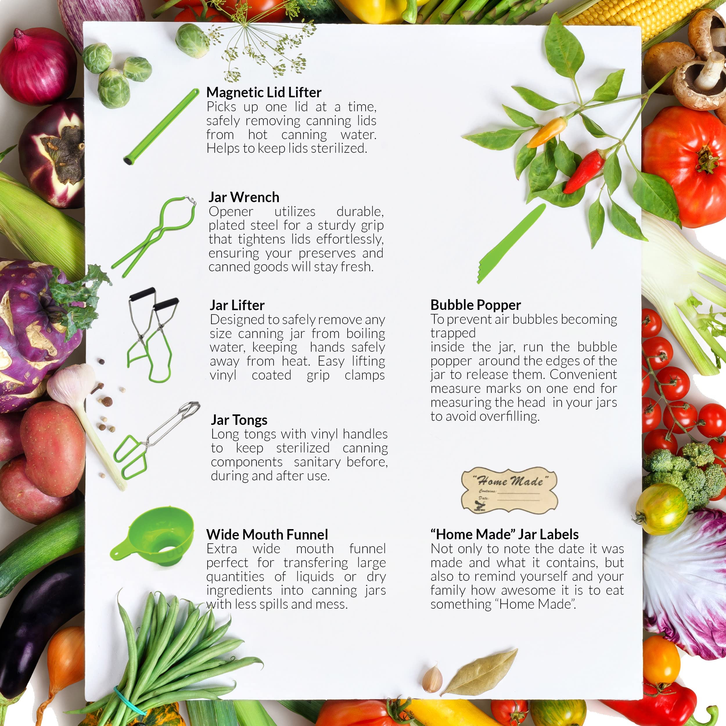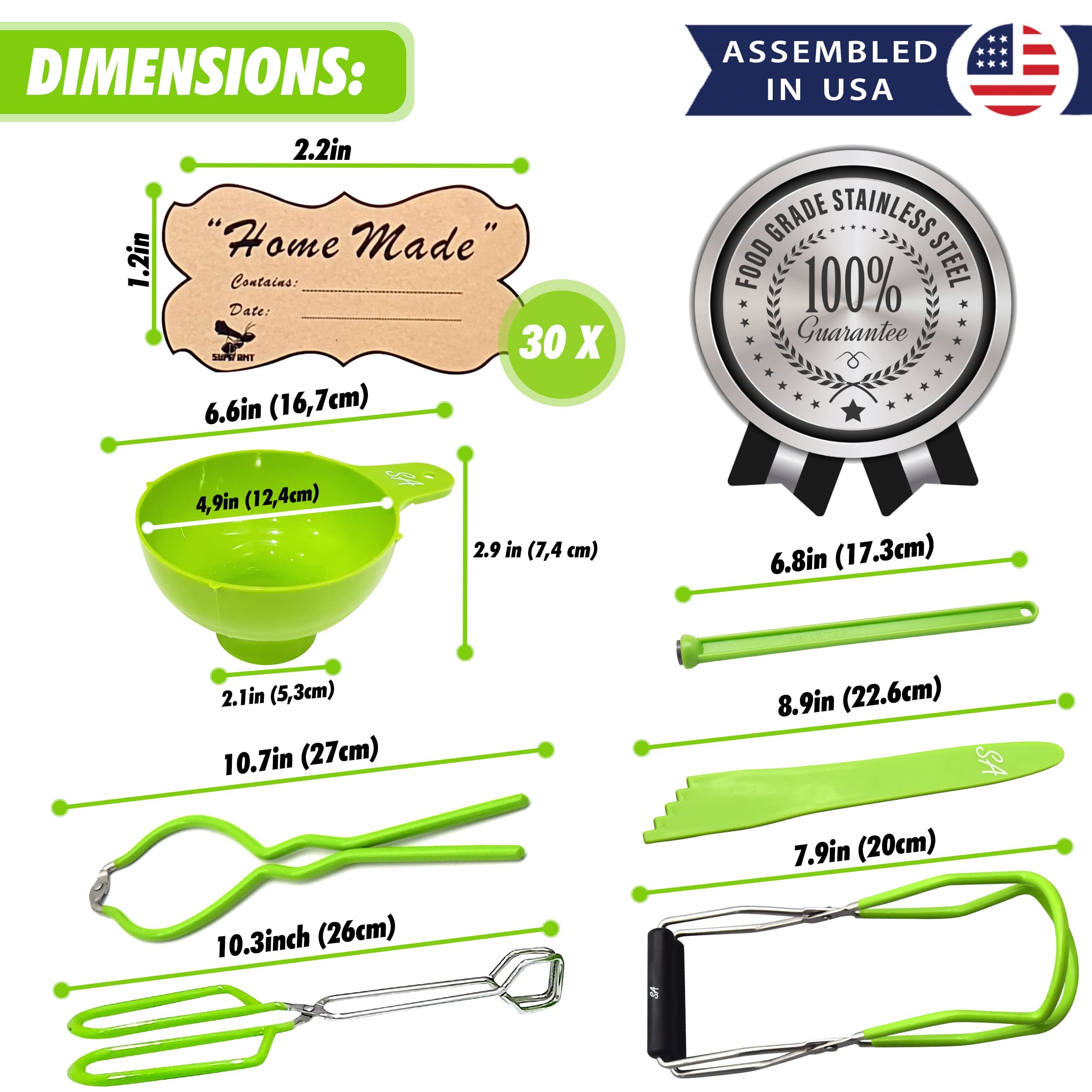All-in-one canning supplies starter kit - This kitchen tool set consists of all essential canning tools : extra wide canning funnel for wide mouth canning jars , magnetic jar lids lifter , canning bubble popper / measurer, canning jar lifter, jar wrench, pickle grabber tongs and a set of "Homemade" canning labels to remind everyone of the hard work you have put in to make it. The absolute canning must haves for beginner, canning gifts for women , fathers day gift ,mothers day gift and the best canning kitchen essentials.