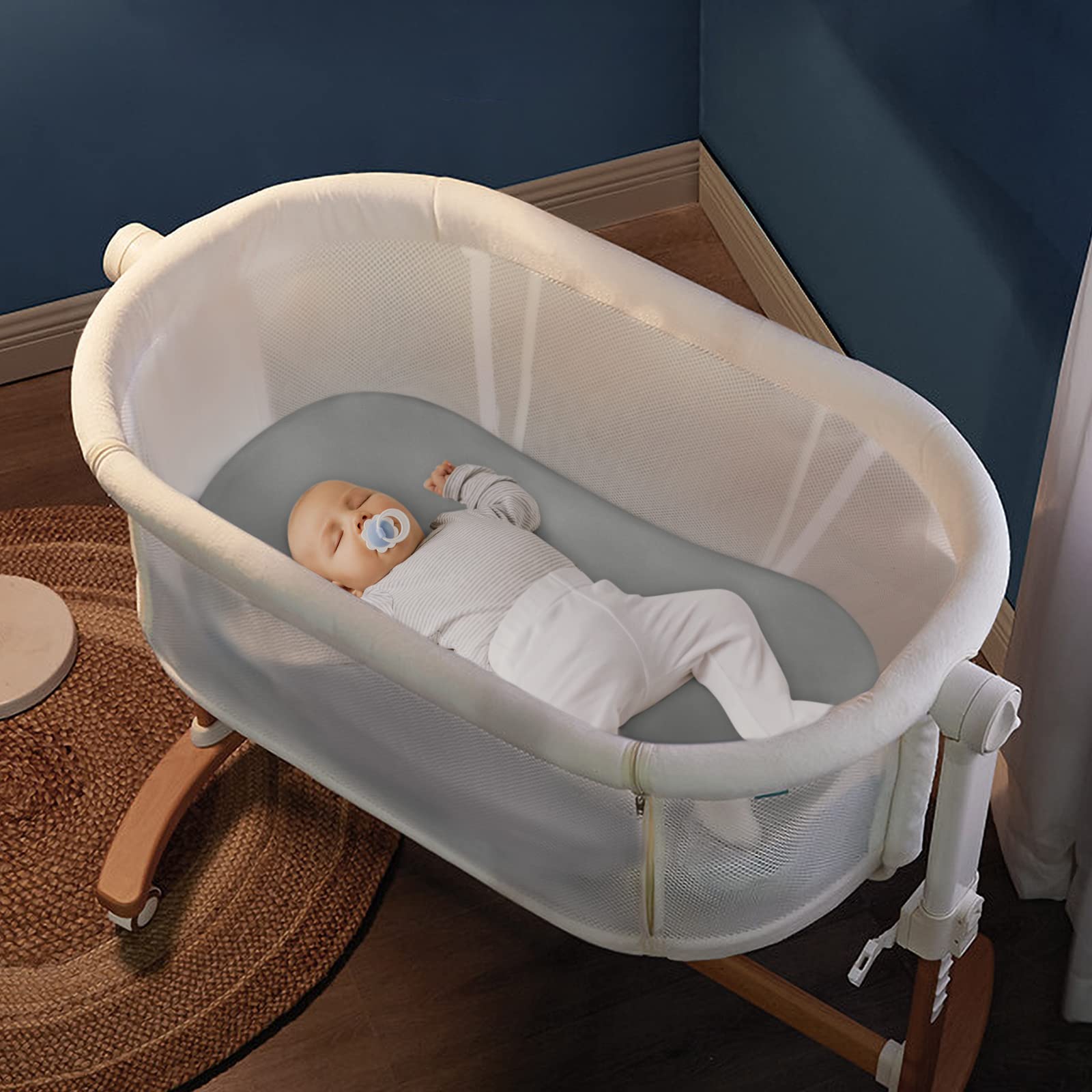 Not Only Fitted, But Snug: Measuring 32”x17”x5.5” Our bassinet mattress sheets fit almost all standard oval, round, rectangle, hourglass shaped bassinet mattress. Compatible with Dream On Me Karley & Lacy bassinet and other bassinet. Each baby bassinet sheet comes with an elastic band encased at the bottom for safety.