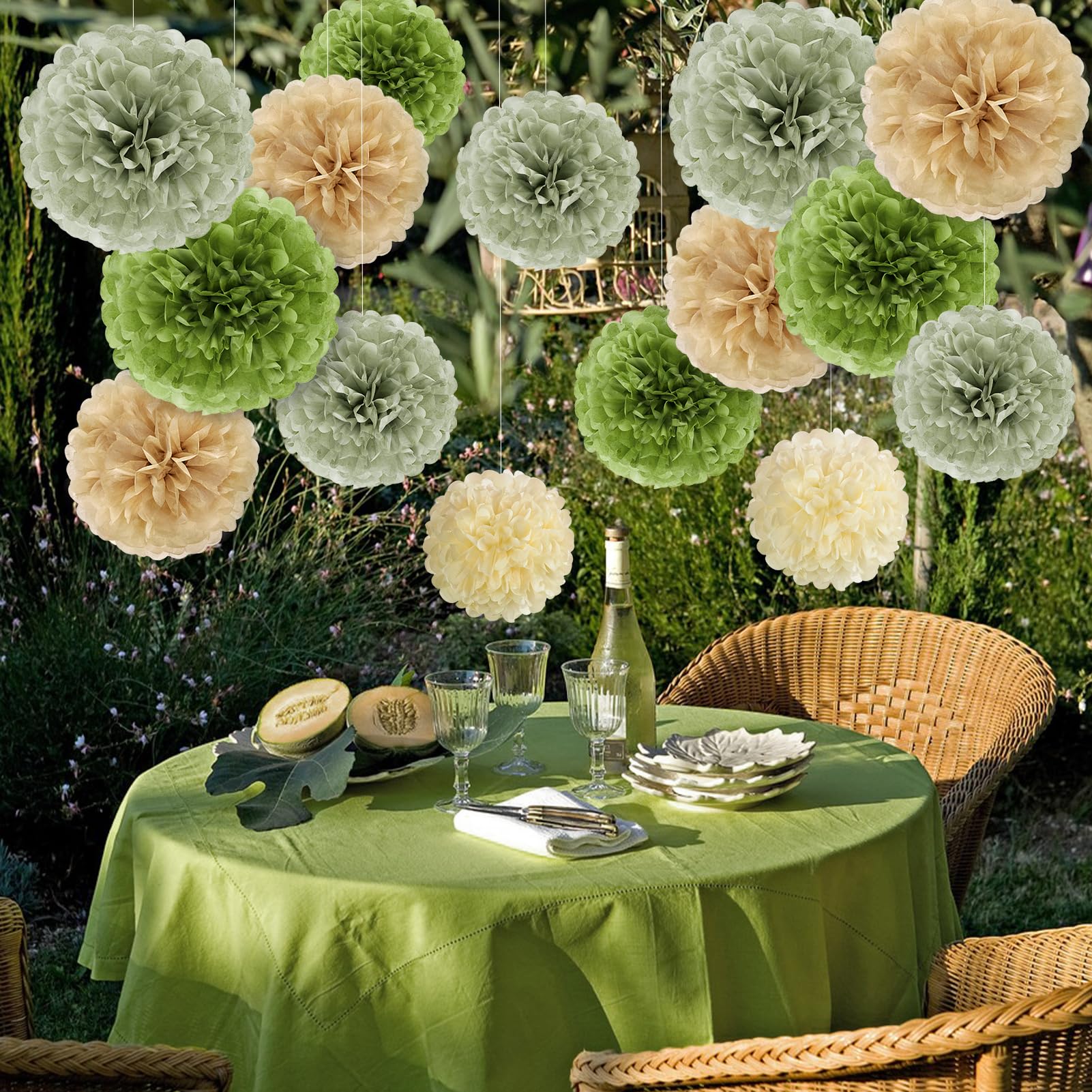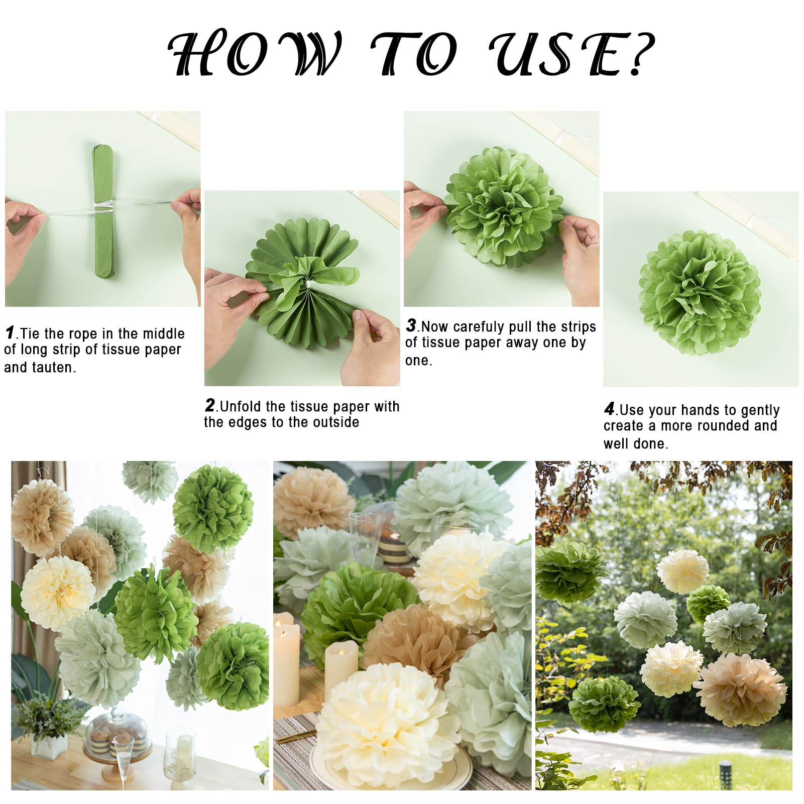💚Sage Party Decorations --- Set includes 25cm brown pompon*2, 20cm brown pompon*2, 20cm cream pompon*2, 20cm sage green pompon*2, 20cm olive green pompon*2, 25cm olive green pompon*3, 15 pcs. in total. 25cm olive green pompon*2, 25cm sage green pompon*3, 15 pcs. in total