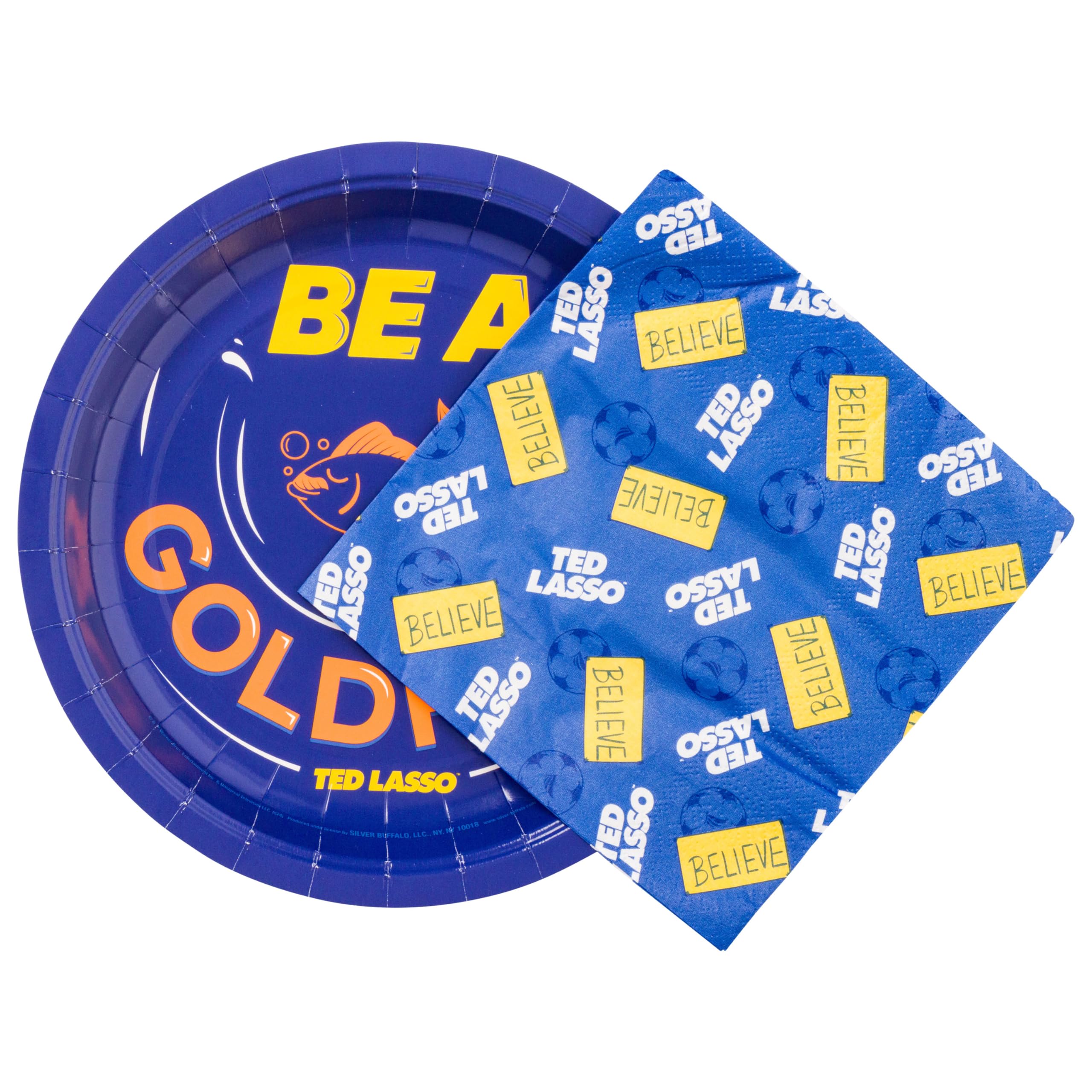 Elevate the spirit of your gathering with our Silver Buffalo Ted Lasso Be A Goldfish Believe Sign 32-Piece Party Pack. Inspired by the heartwarming and inspirational TV series, this party pack features uplifting messages and iconic imagery from Ted Lasso, including the beloved goldfish logo. Each set includes 16 paper plates and 16 napkins, adorned with motivational phrases that create a cheerful atmosphere for any event. Remember, these items are not for reuse; please dispose of them properly after use. Rest assured that you're purchasing Official Ted Lasso merchandise from Silver Buffalo, ensuring quality and authenticity for your sports-themed parties, watch parties, and gatherings with friends and family. SINGLE USE ONLY. Please dispose of properly after use. Take your fan experience to the next level with Silver Buffalo, a brand dedicated to delivering cherished official character merchandise. Through collaborative efforts, we pioneer unique, creative, and groundbreaking products, with detail and innovation. At Silver Buffalo, our pride lies in crafting extraordinary, playful items that forge a connection between fans and their beloved characters, superheroes, movies, TV series, and beyond. Celebrate your fandom!