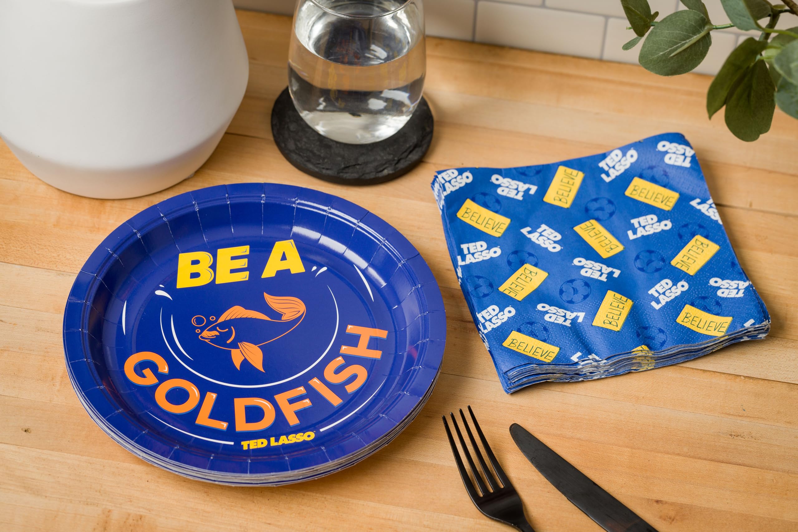 UPBEAT TED LASSO PARTY SET: Bring the positive vibes of the hit TV show Ted Lasso to your next gathering with this inspiring party pack, featuring uplifting messages of Be A Goldfish and iconic imagery of the Believe sign from the series