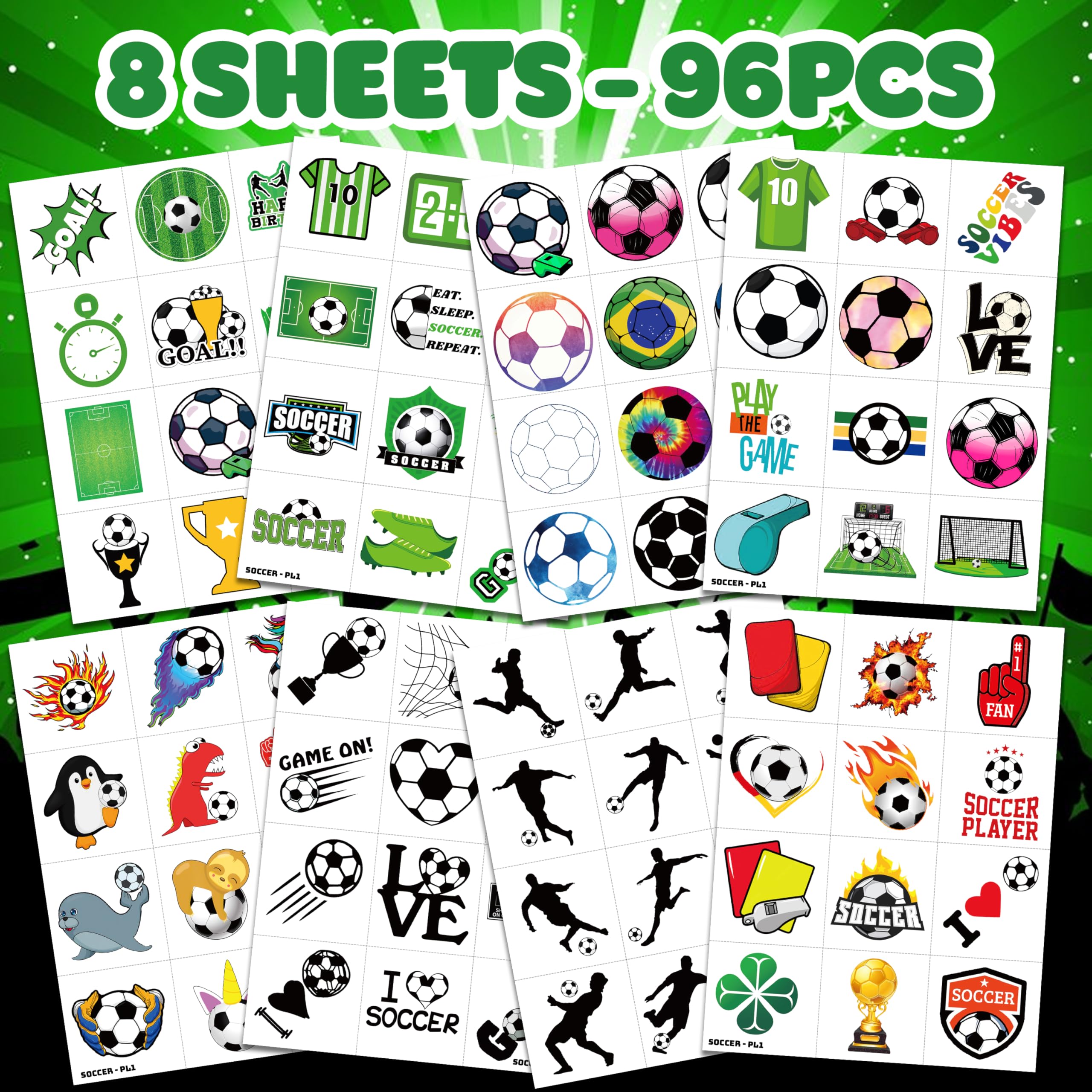 Pattern rich: Soccer Ball Pre-Cut Football Sports Player Temporary Tattoos include 8 Sheets 96 PCS, the size of each sheet is 6.3 * 4.7 inches. Easy to share,even if a lot of people's parties, you can have a different tattoo with others.These adorable tattoos will keep you and your little ones – and their friends – occupied for a while. Great for playdates, parties, or rainy days.