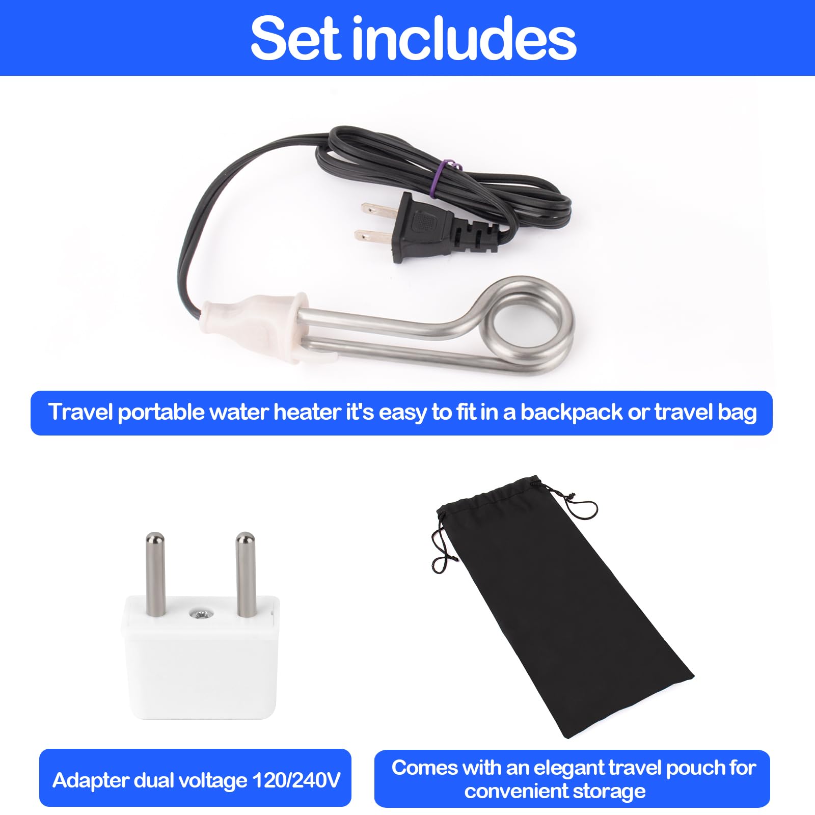 Portable Immersion Water Heater: Electric Immersion water heater comes with a travel or camping adapter, making it easy for instant cup immersion heater portable. The immersion heater for boiling water is versatile, can be used to comfortably instant immersion heater for coffee or tea the of your hotel room or immersion water heater electric camping site without any issue. Portable immersion water heater electric kettle single cup also makes for an excellent gift choice for frequent travelers to make their trip go smoothly.