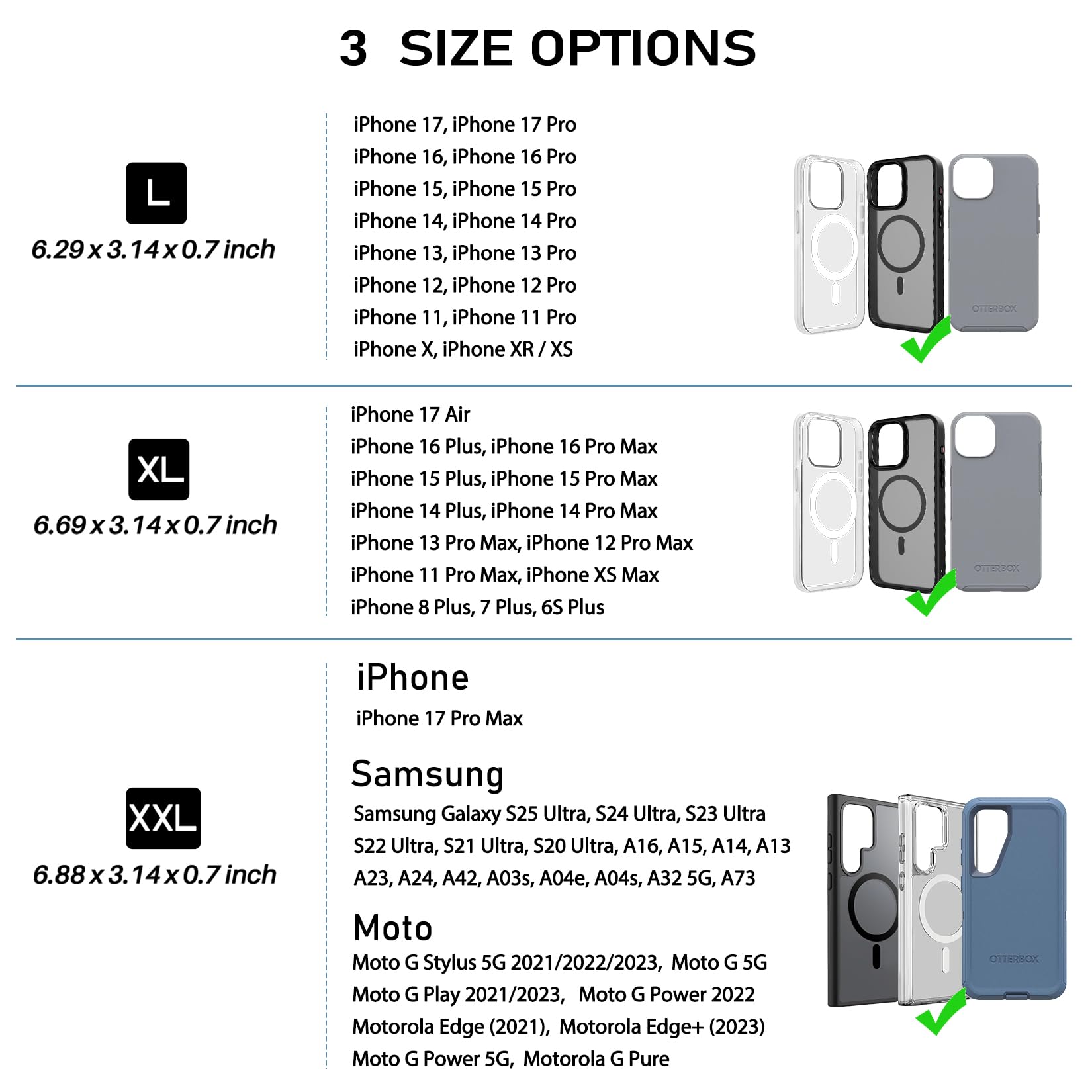 Choose from three sizes: L - 6.29x3.14 x0.7 inches, XL - 6.69x3.14x0.7 inches and XXL - 6.88x3.14x0.7 inches for a perfect fit with your phone