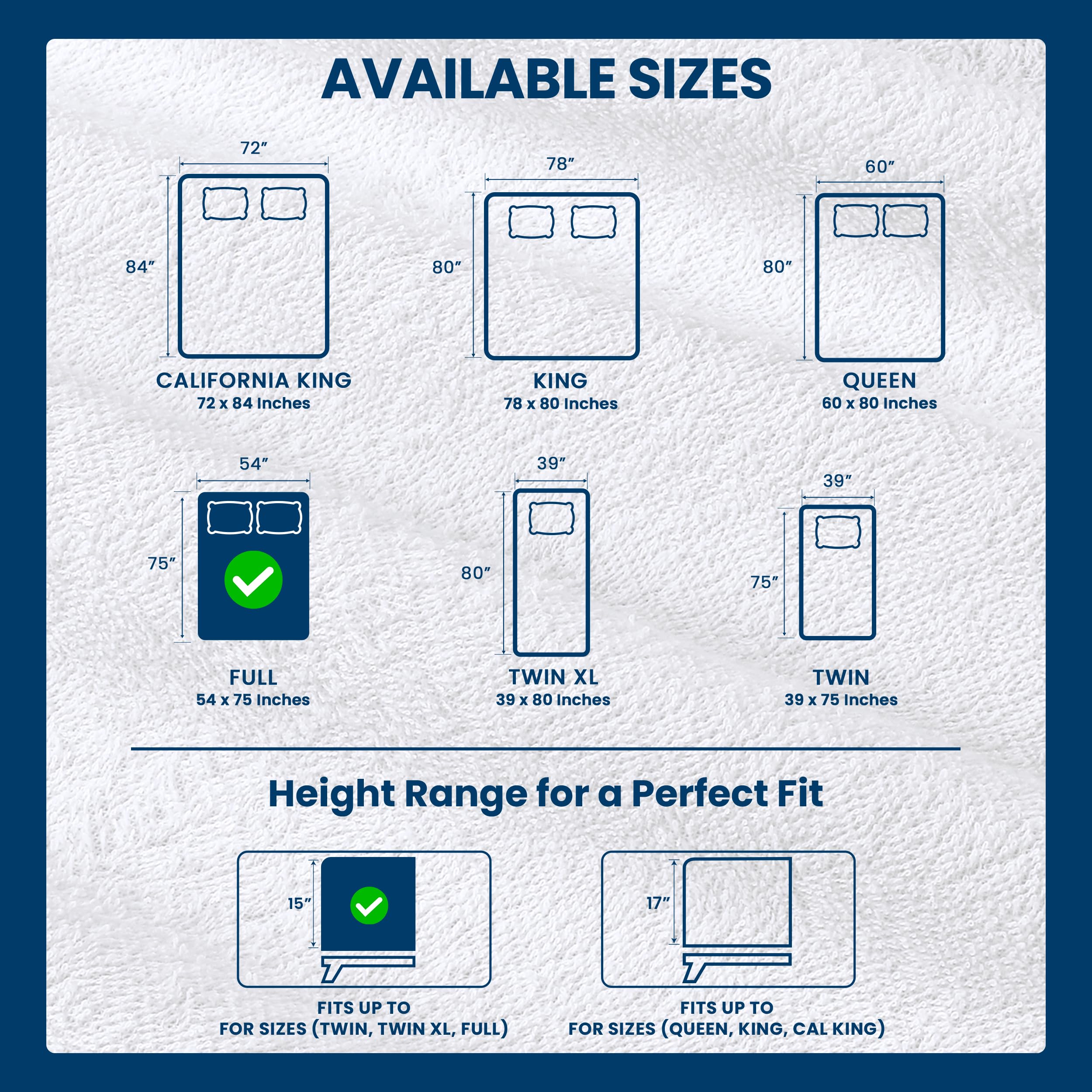 Mattress Protector - Fits Full size mattress perfectly with dimensions 54 inches by 75 inches by 15 inches, featuring professionally turned hems and deep fitted pockets