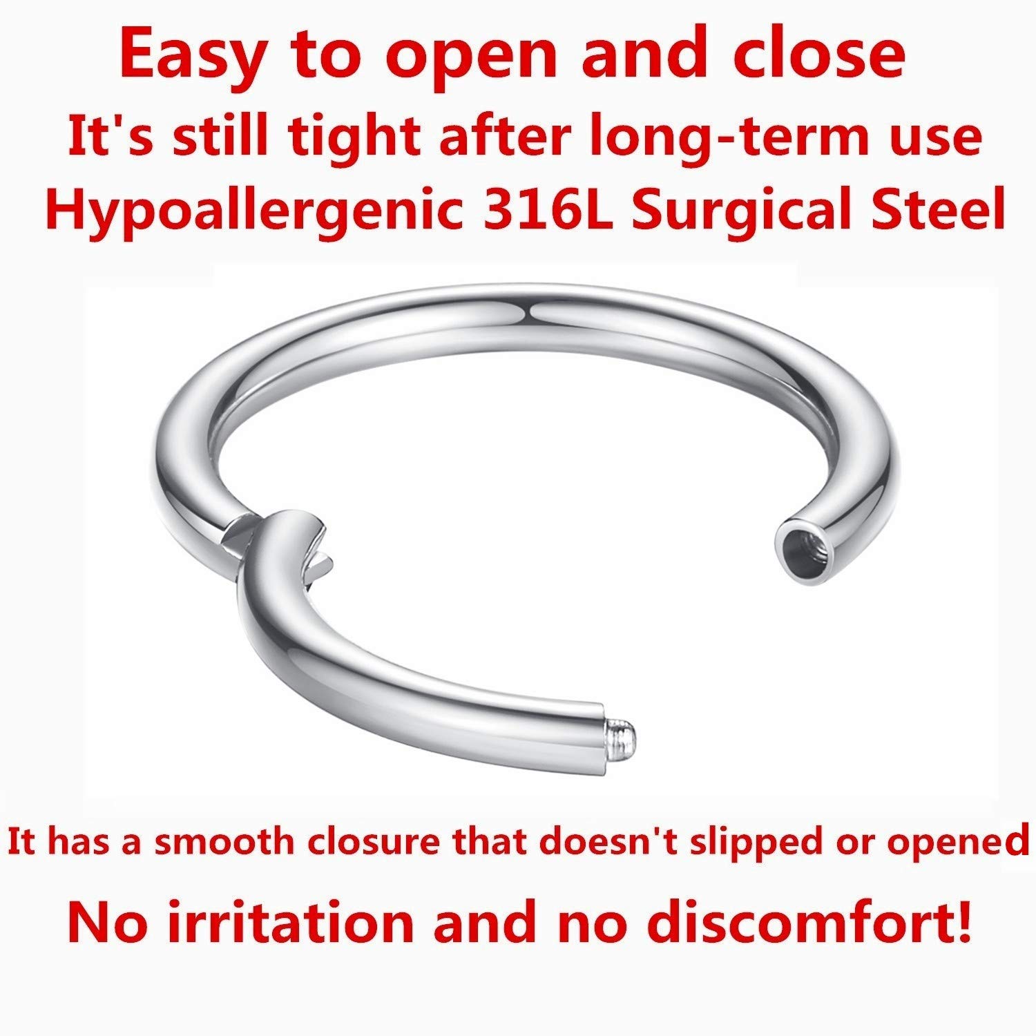 Perfect for Nose, Cartilage, Septum, Tragus Piercings,Helix Earring, Daith,Conch,Rook Ear Piercing, Lip Rings, Belly Ring,Nipple Piercing and more. Very easy to open/close a click closure by hand. Not require a tool.Smooth surface, comfortable to wear without sharp edge. Match with suitable apparel for different occasion. Smooth Surface and easy to use.