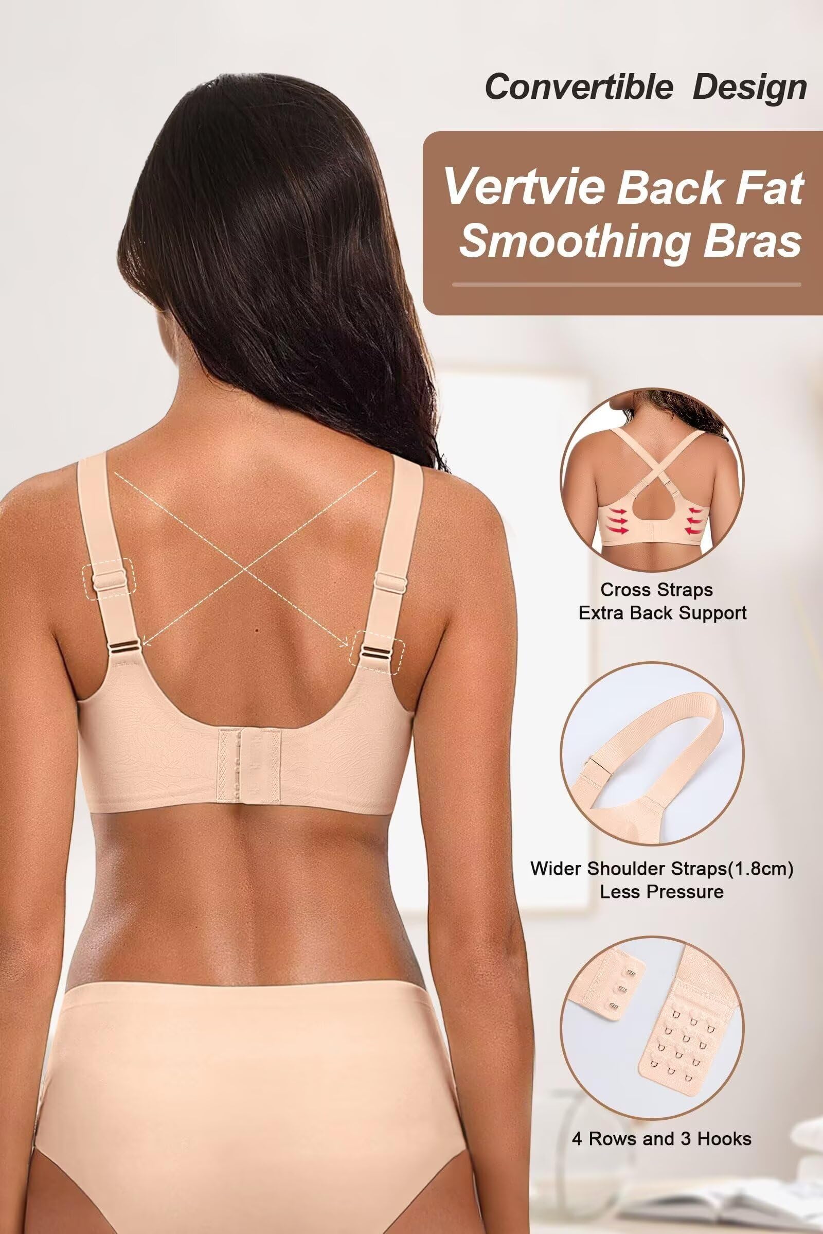 【Adjustable Shoulder Straps】 These supportive bras for women feature adjustable, non-slip straps and an extension buckle with 4 rows of hook-and-eye closures for a custom fit. They ensure comfort and stability, preventing sagging or riding up. The U-back design and wide side wings help hide underarm bulge and back fat, offering extra support