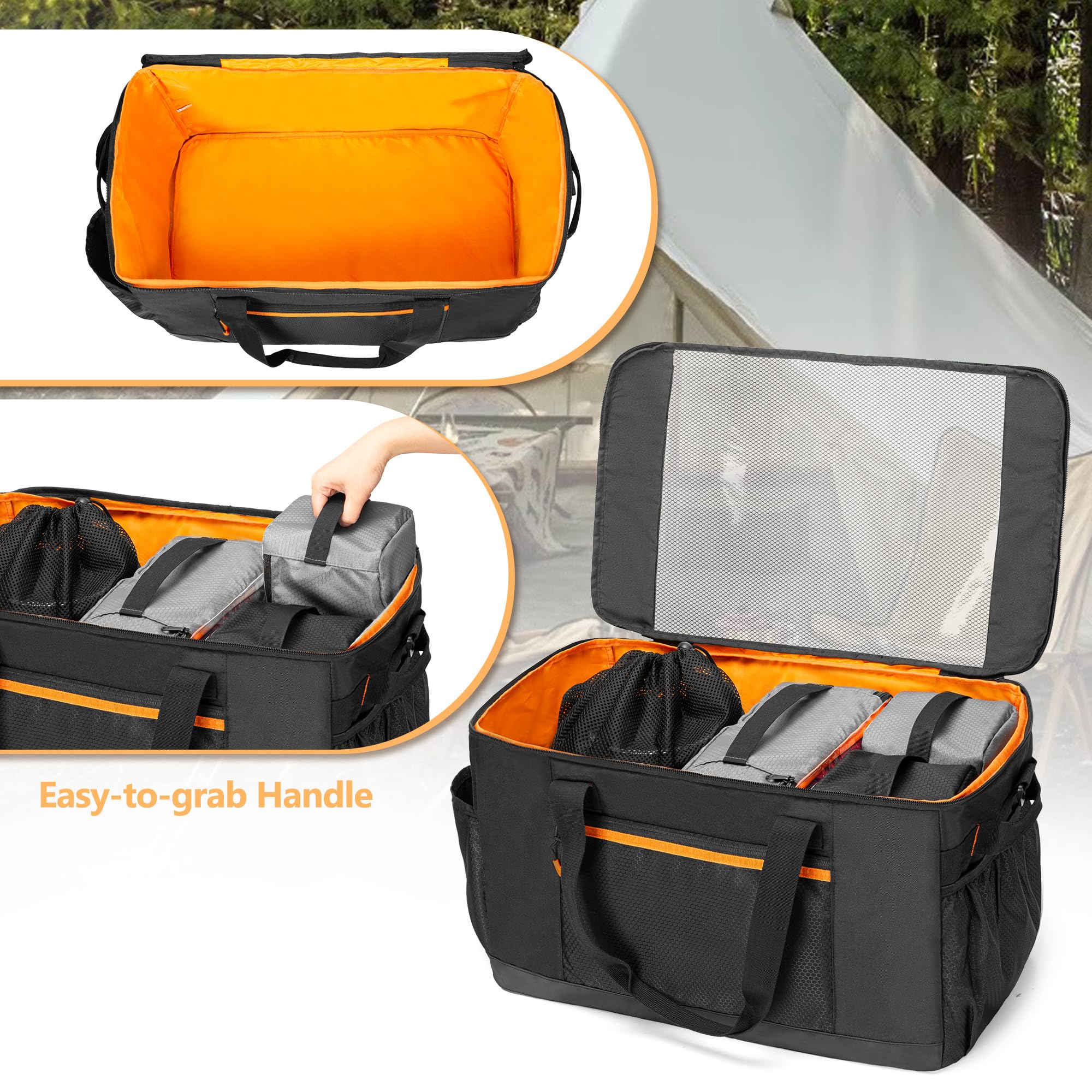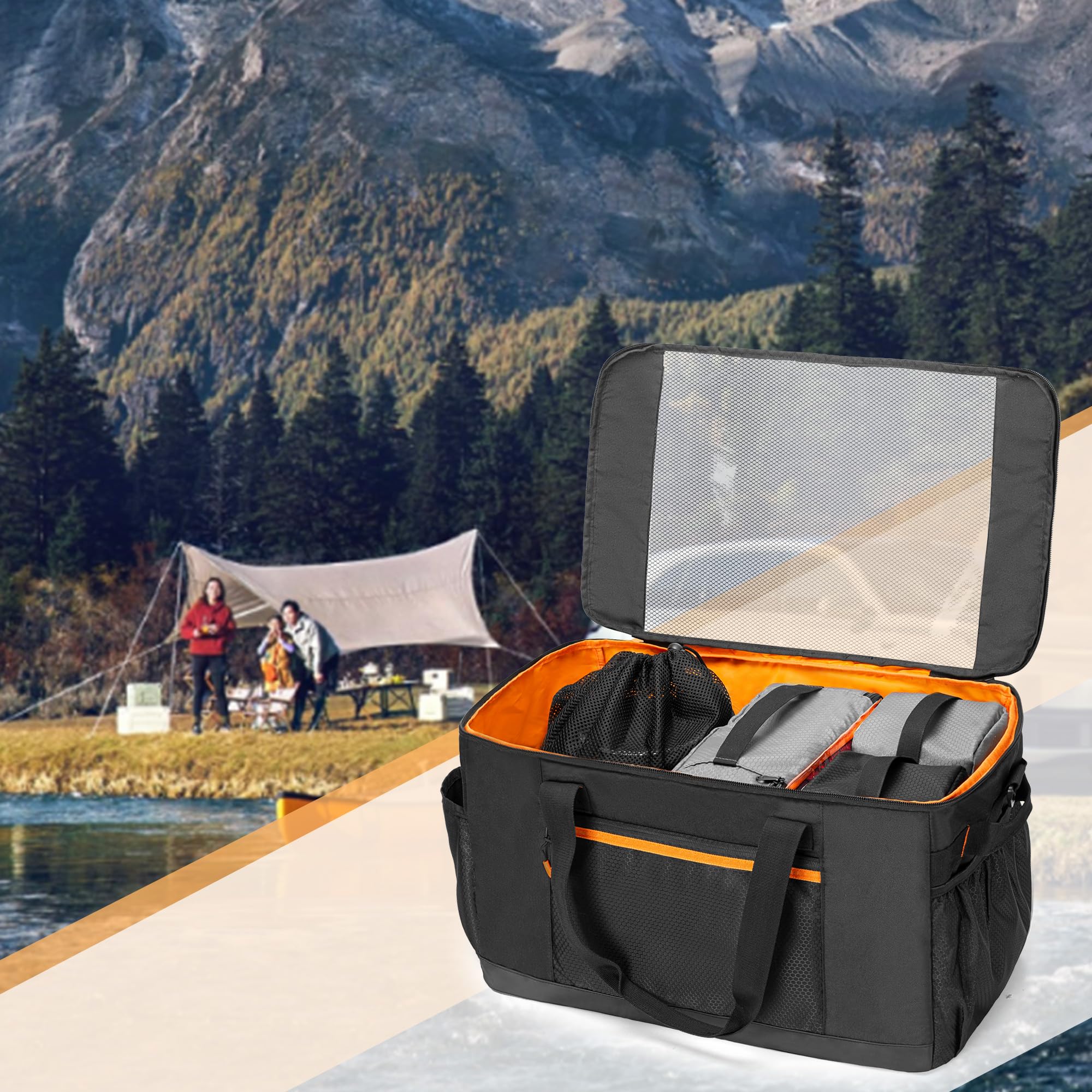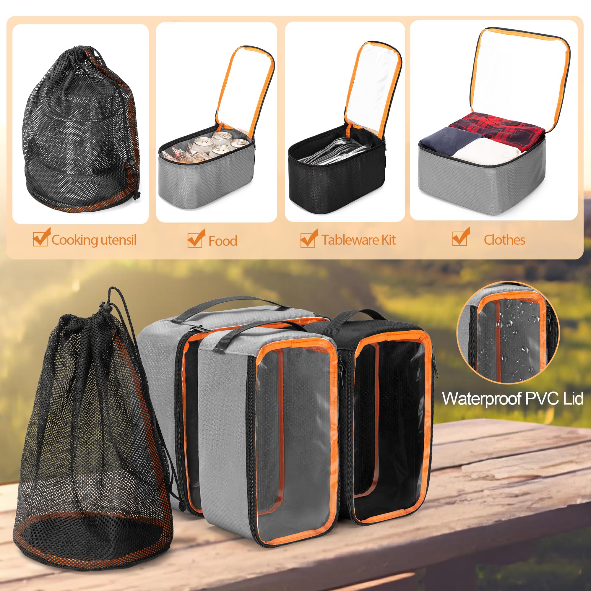 Camping Organizer Box Kit: 2 color packing cubes in total 3 pcs + 1 mesh pocket, which can be placed in the attached extra large storage bag, and hold all your camping equipment or kitchen necessities