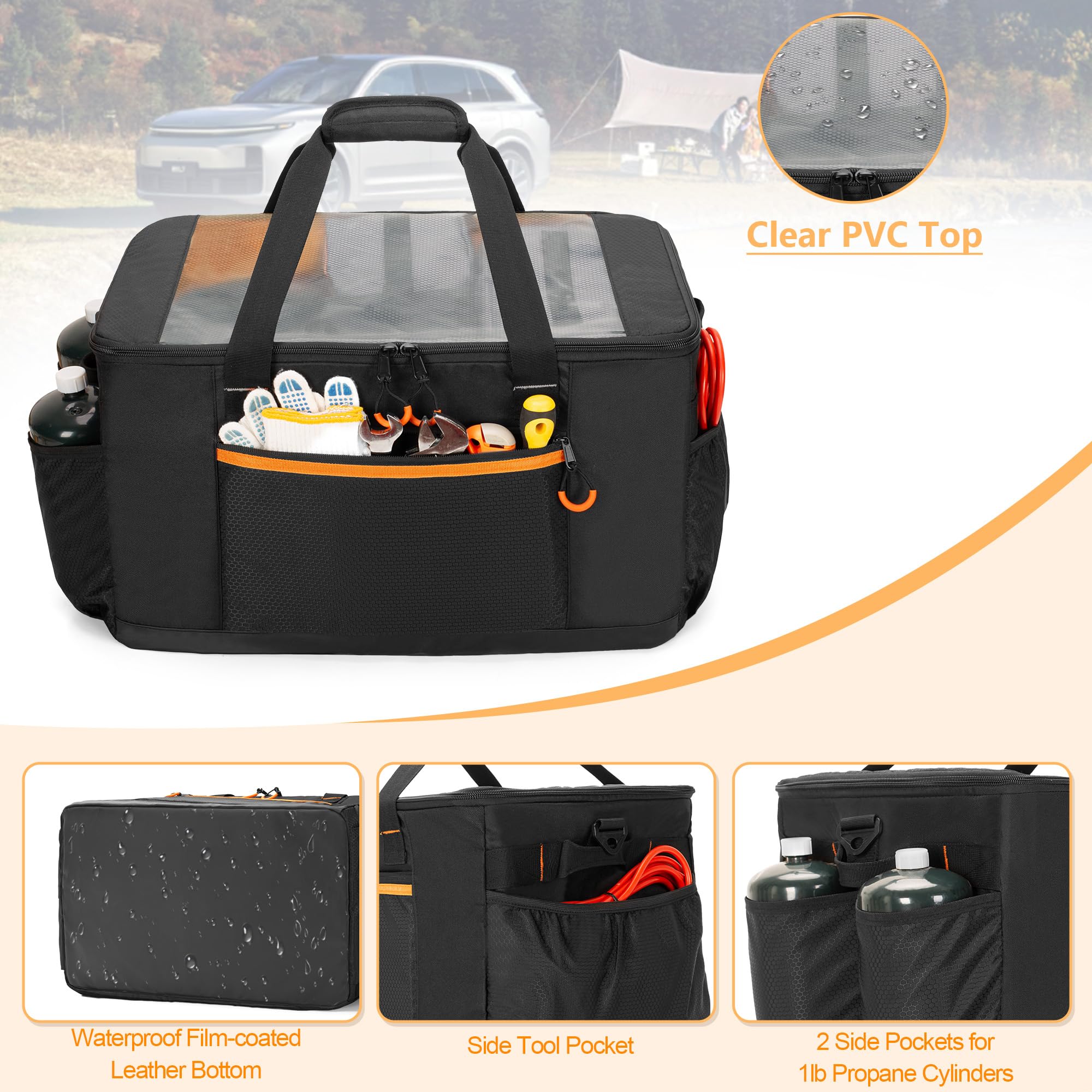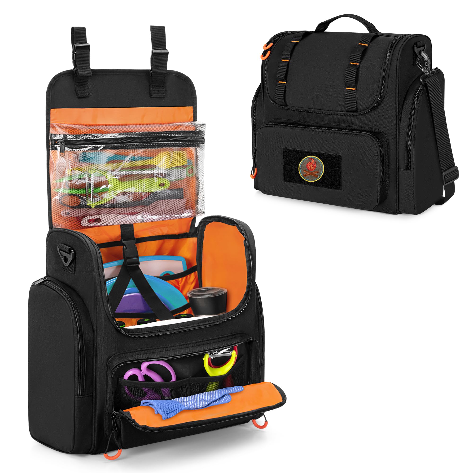 Practical: Dimension: Small: 5.2”*5”*10.4”, Large: 10.5”*4.5”*9.5”, Mesh Pocket: Diameter: 9.8”, H:13.6”, Storage bag: 19.7"*12"*11.5"; The front and side pockets of the camping storage box bag have extra storage space, with large capacity to hold all gear, making it an ideal organizer bag for home, picnics, outdoor and travel