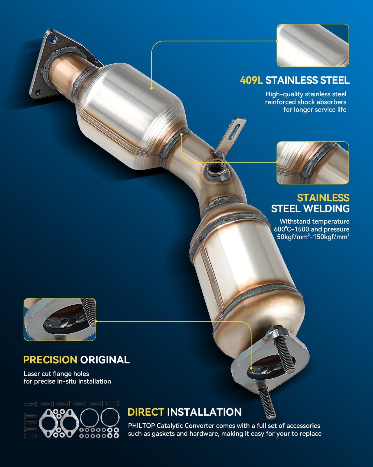 Stainless Steel Out Shell: The high flow catalytic converters with heavy-duty stainless steel construction feature maximum durability. Firmly welded connections can withstand high temper and pressures for longer service life.