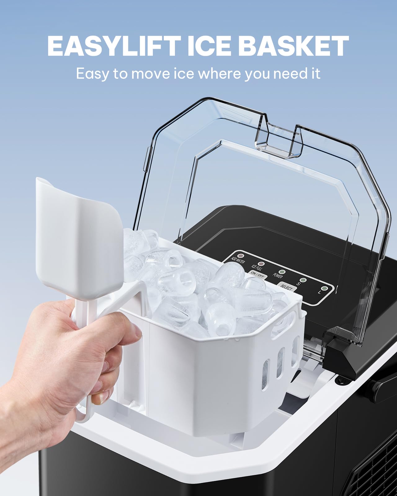 Portable and Convenient: Equipped with a sturdy handle for easy transport, this ice maker machine weighs only 13.7 lbs and includes a scoop that attaches to the basket for convenient storage. It's perfect for moving between rooms or bringing to events